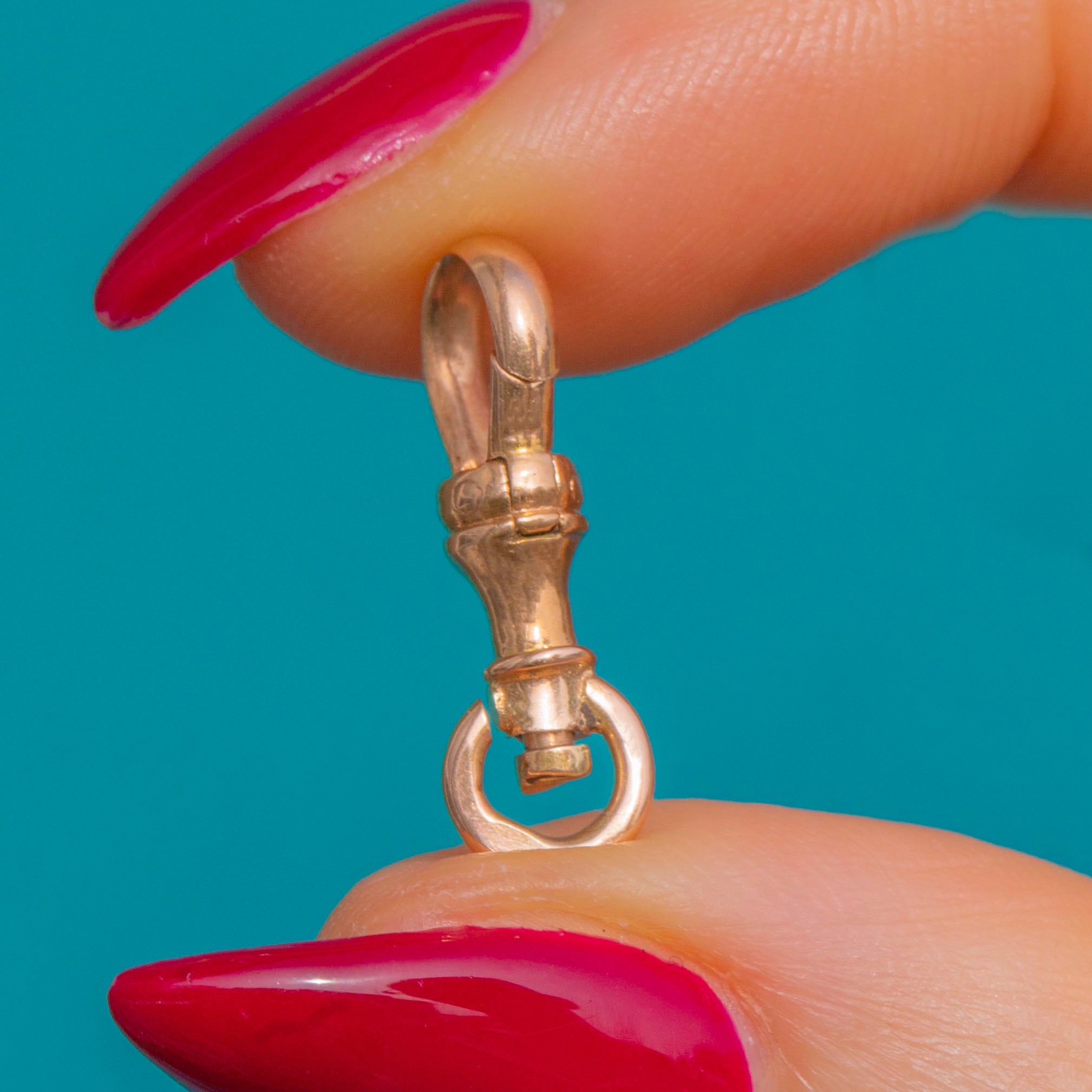 A petite Victorian swivel dog clip crafted in glowing 15ct Gold. Its baluster collar and turned detailing lend a refined, utilitarian elegance, while the working spring gate and rotating swivel ring offer both beauty and function.