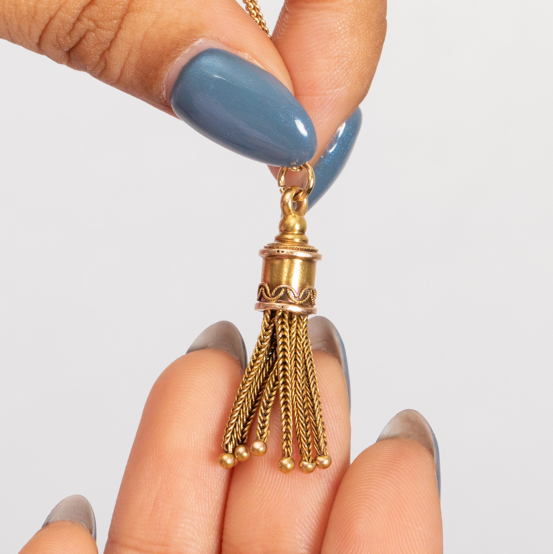 EXCELLENT. We are pleased to present this antique 15ct Gold tassel pendant in excellent condition! Each of her tassels is intact and securely suspended from her topper, and the Gold throughout is in mint condition. This antique Gold pendant is ready to wear straight from your pink Lillicoco box!