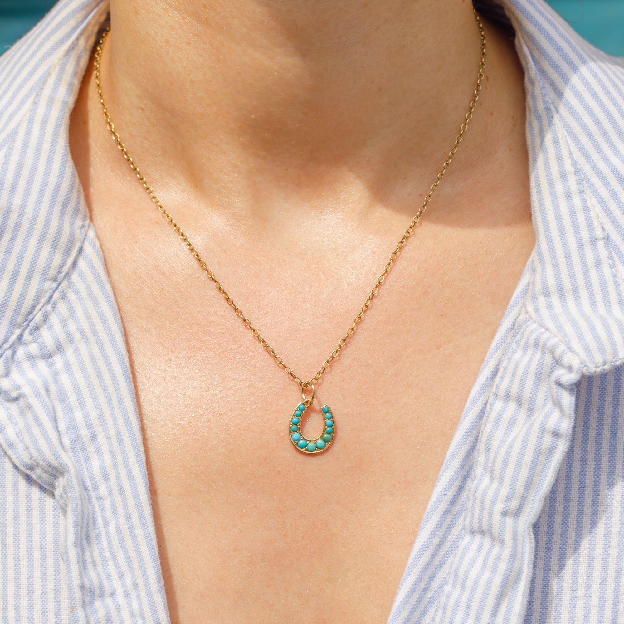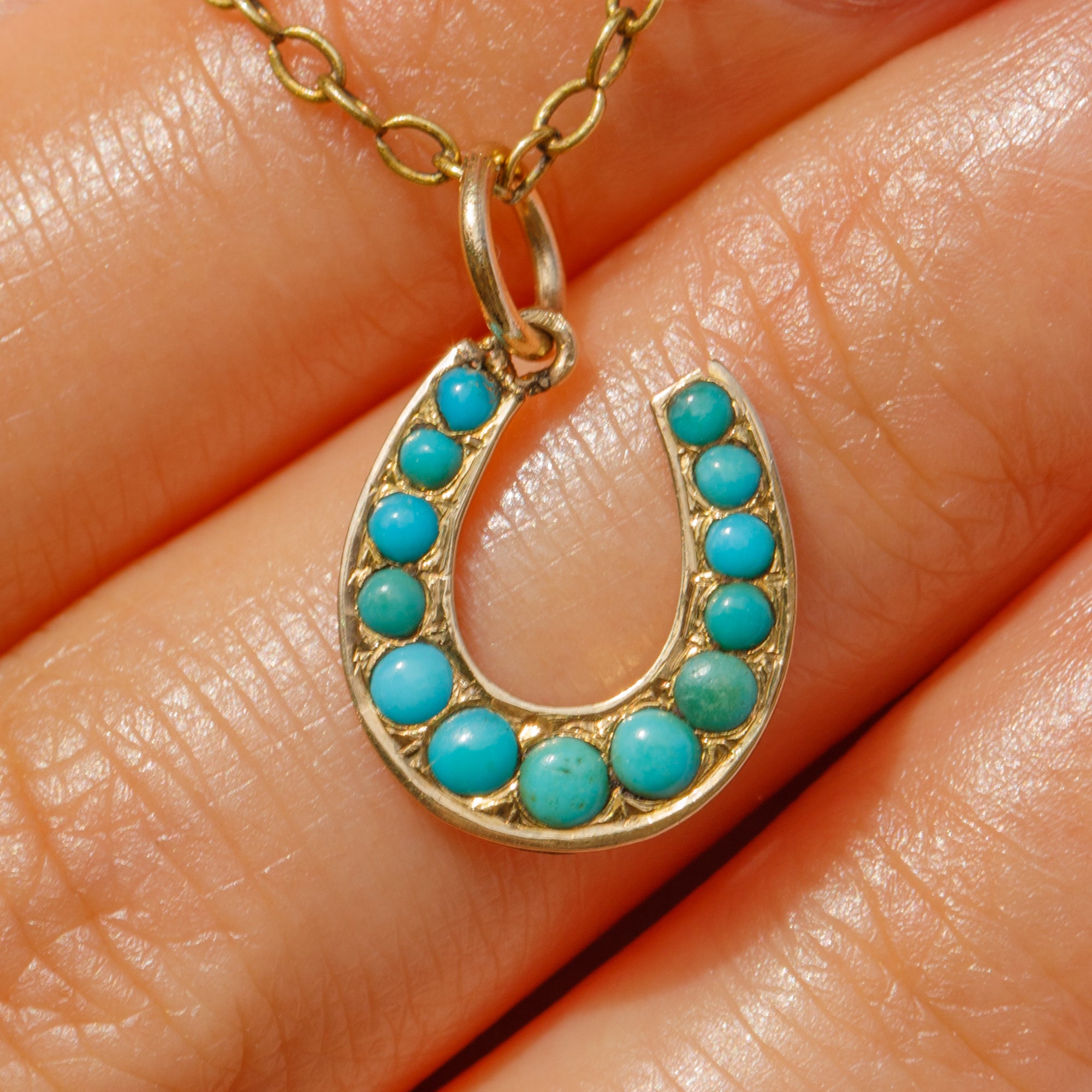 This antique 15ct Gold Turquoise horseshoe charm has captured our hearts! Boasting thirteen sky-blue Turquoise cabochons, this sweet treasure is the perfect good luck talisman for everyday wear.