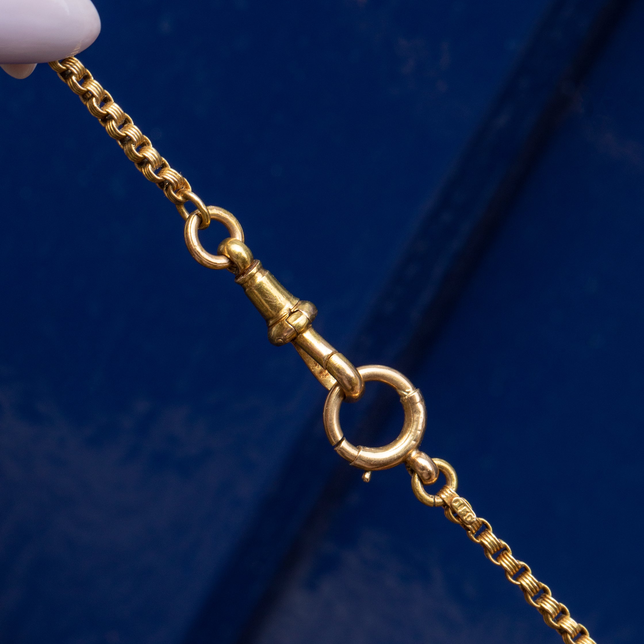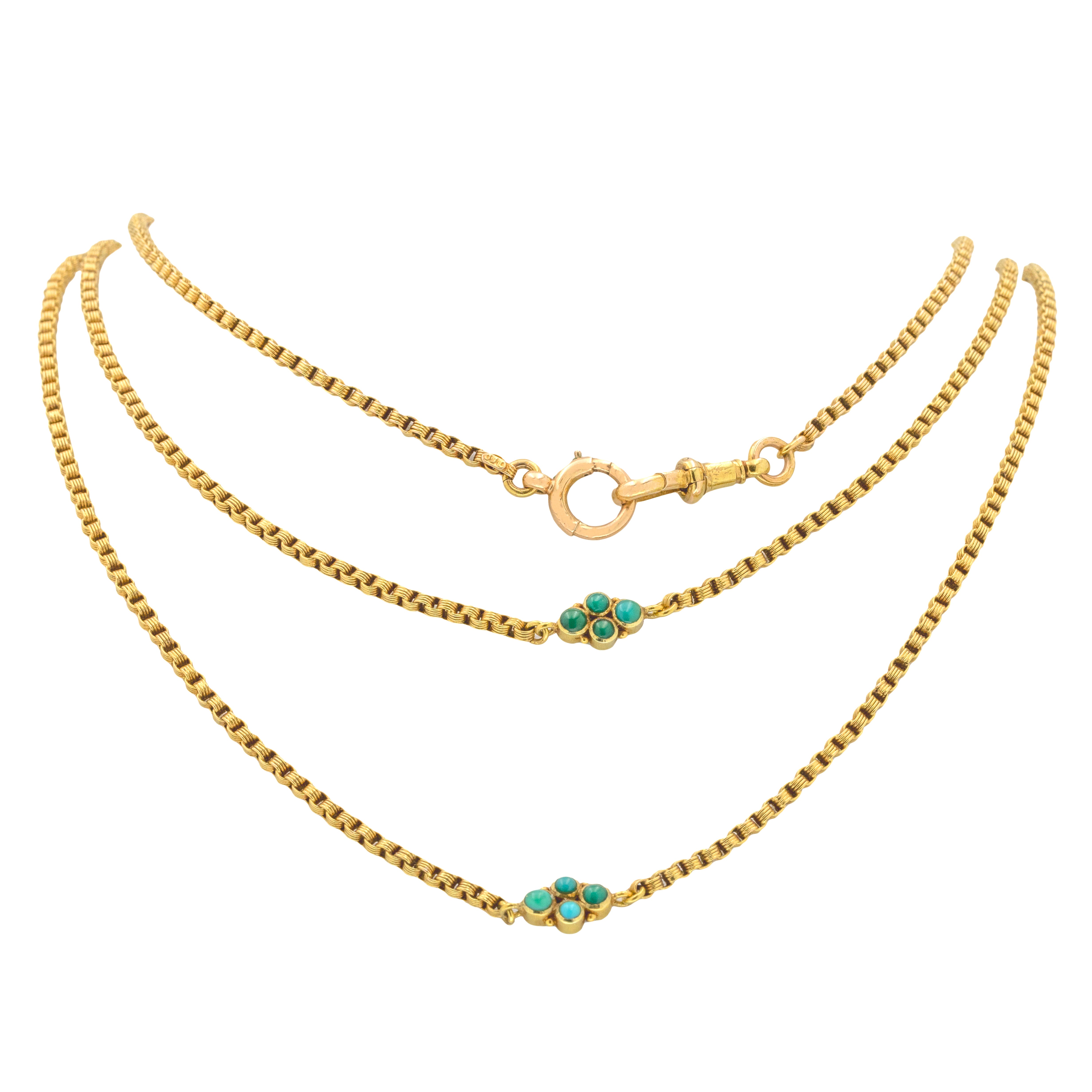 VERY GOOD-EXCELLENT. This antique 15ct Gold Turquoise longuard chain is in very wonderful condition. The chain has a beautiful fluidity with no notable damage to any of the links, retaining a rich golden hue throughout. The Turquoise are smooth and secure within their bezel settings. The dog-clip and bolt-ring securely hold this antique chain around your neck. The bolt-ring needs a soft push to close but one done so is tight. The perfect Victorian Turquoise chain to bring a part of the bygone era into the present day!