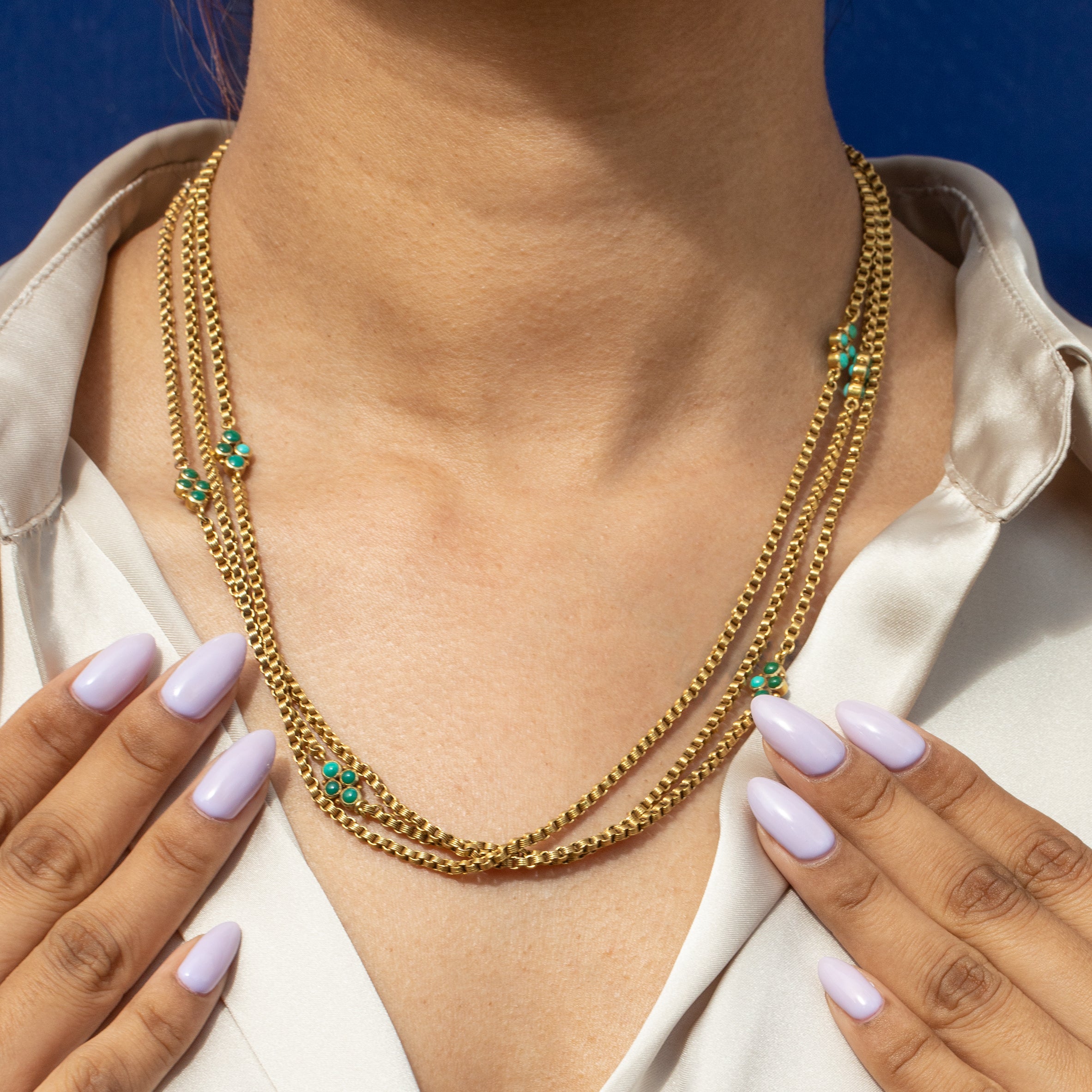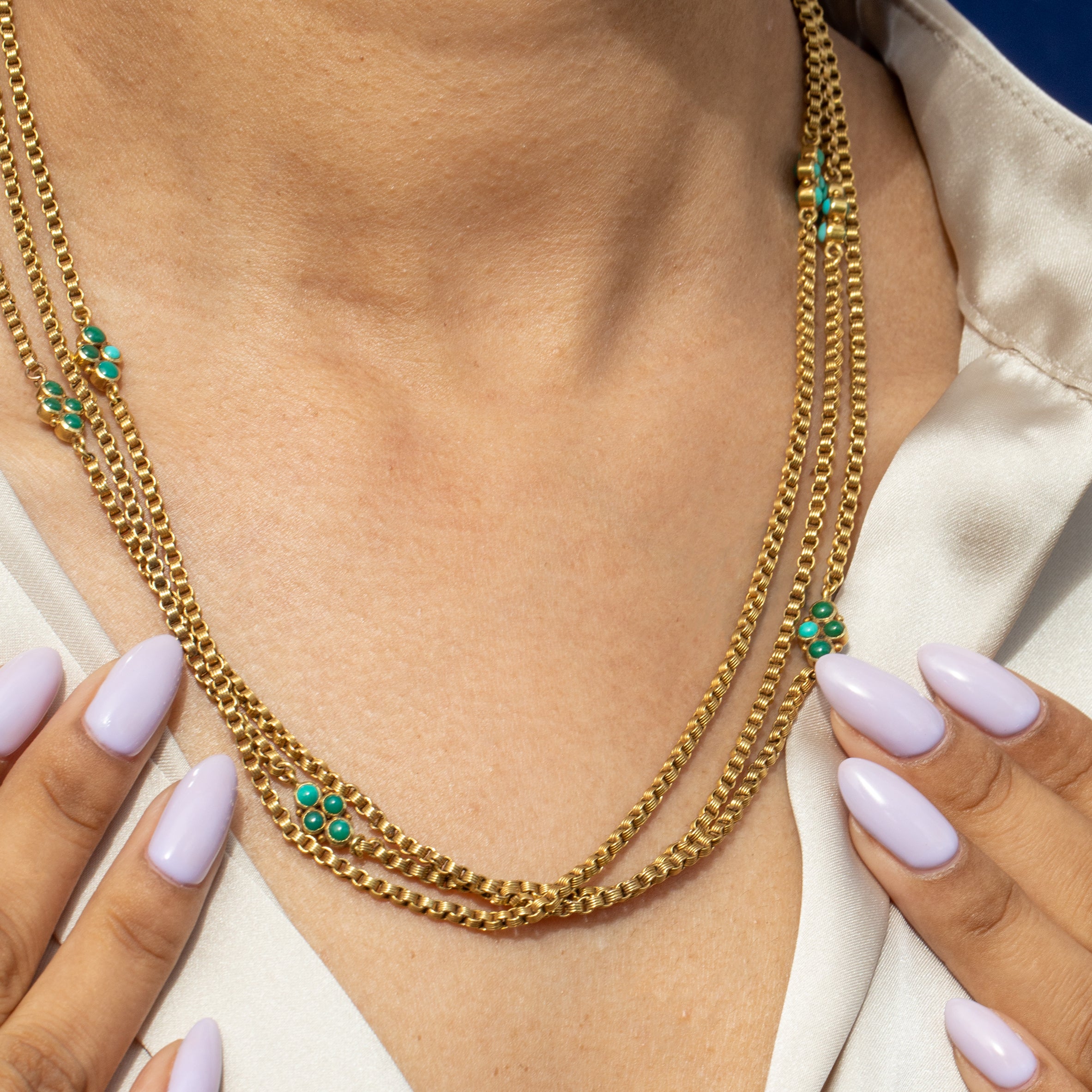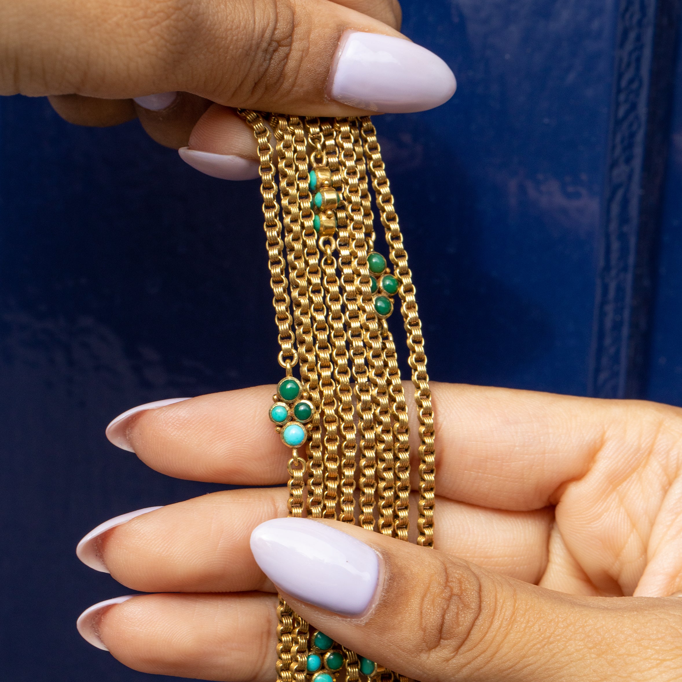 Adorn you neck with sheer beauty! The quality of this antique 15ct Gold Turquoise longuard chain is wonderful... her impressive 60 inch length is composed of ridged belcher links, formed of honey hued 15ct Gold, creating gorgeous texture throughout.