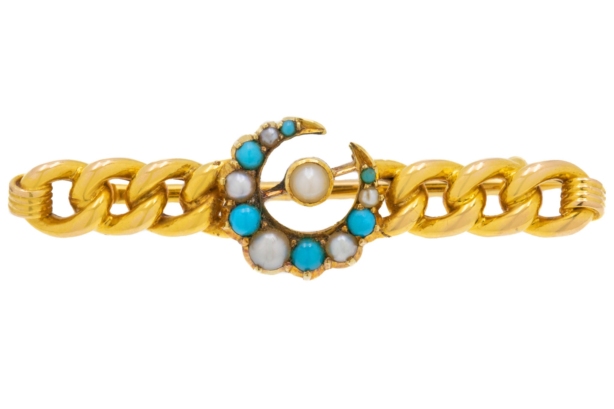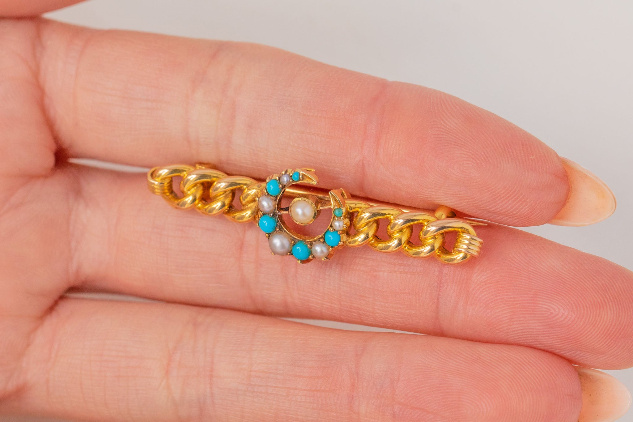EXCELLENT. We offer you this antique 15ct Gold Turquoise Pearl crescent moon bar brooch in excellent condition! Each curb link is bright, buttery and securely soldered together, forming a solid frame for the bar brooch. The Pearls and Turquoise are securely nestled within their settings with no damage to note. The brooch fixture is in perfect working condition, allowing the brooch to sit safely against your clothing. She is truly a showstopper!