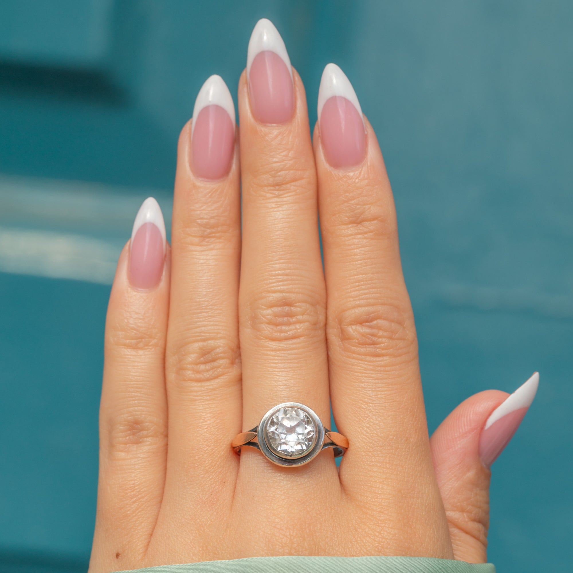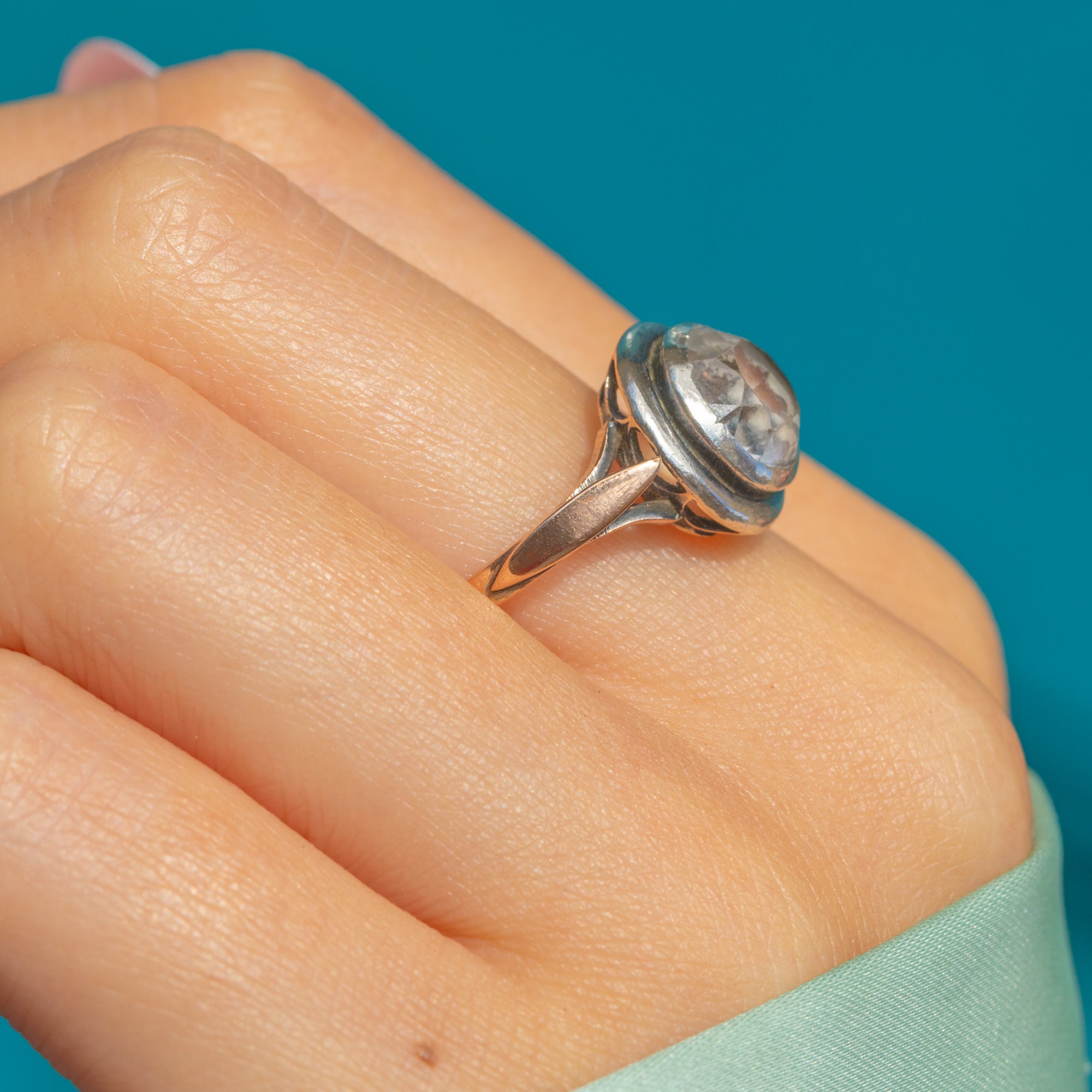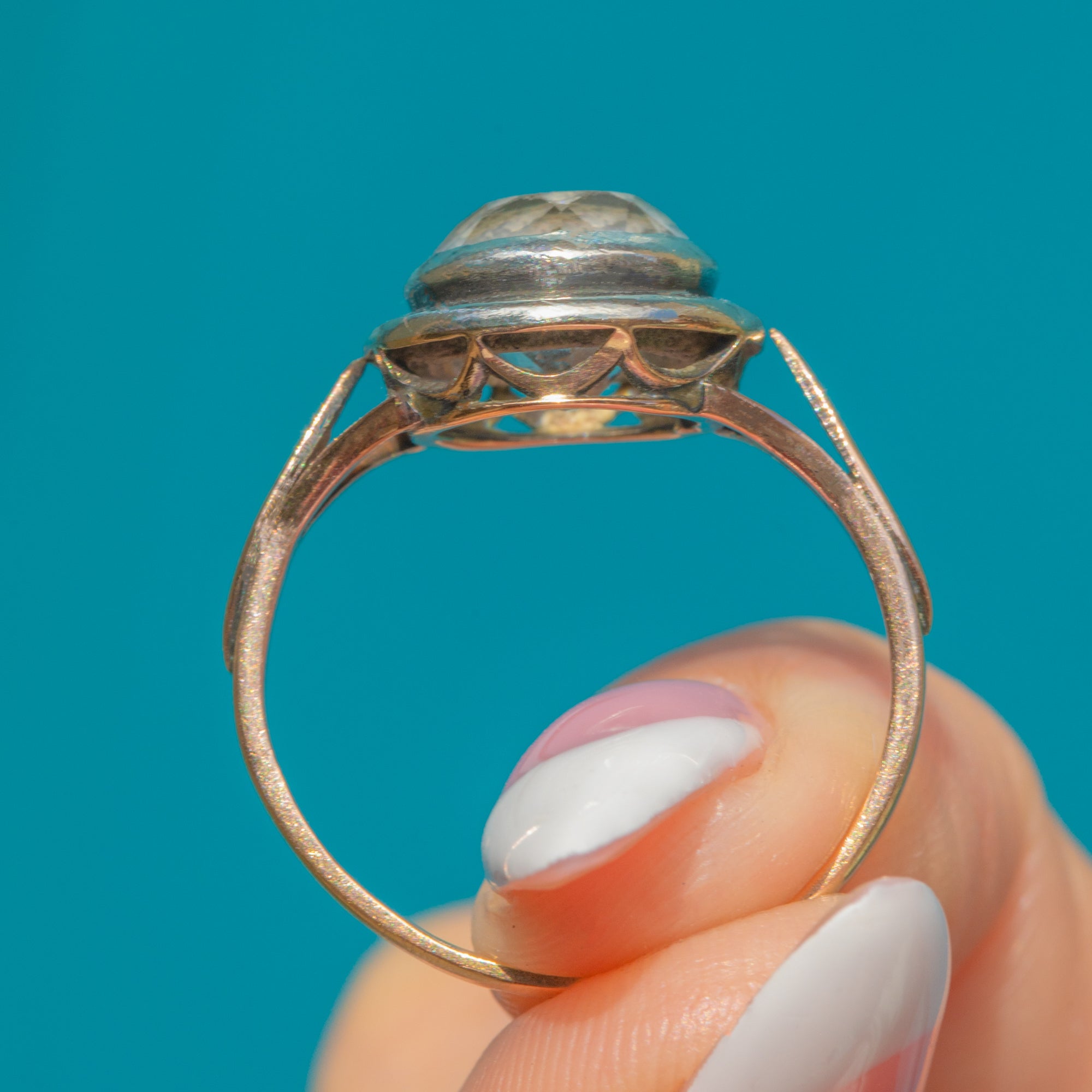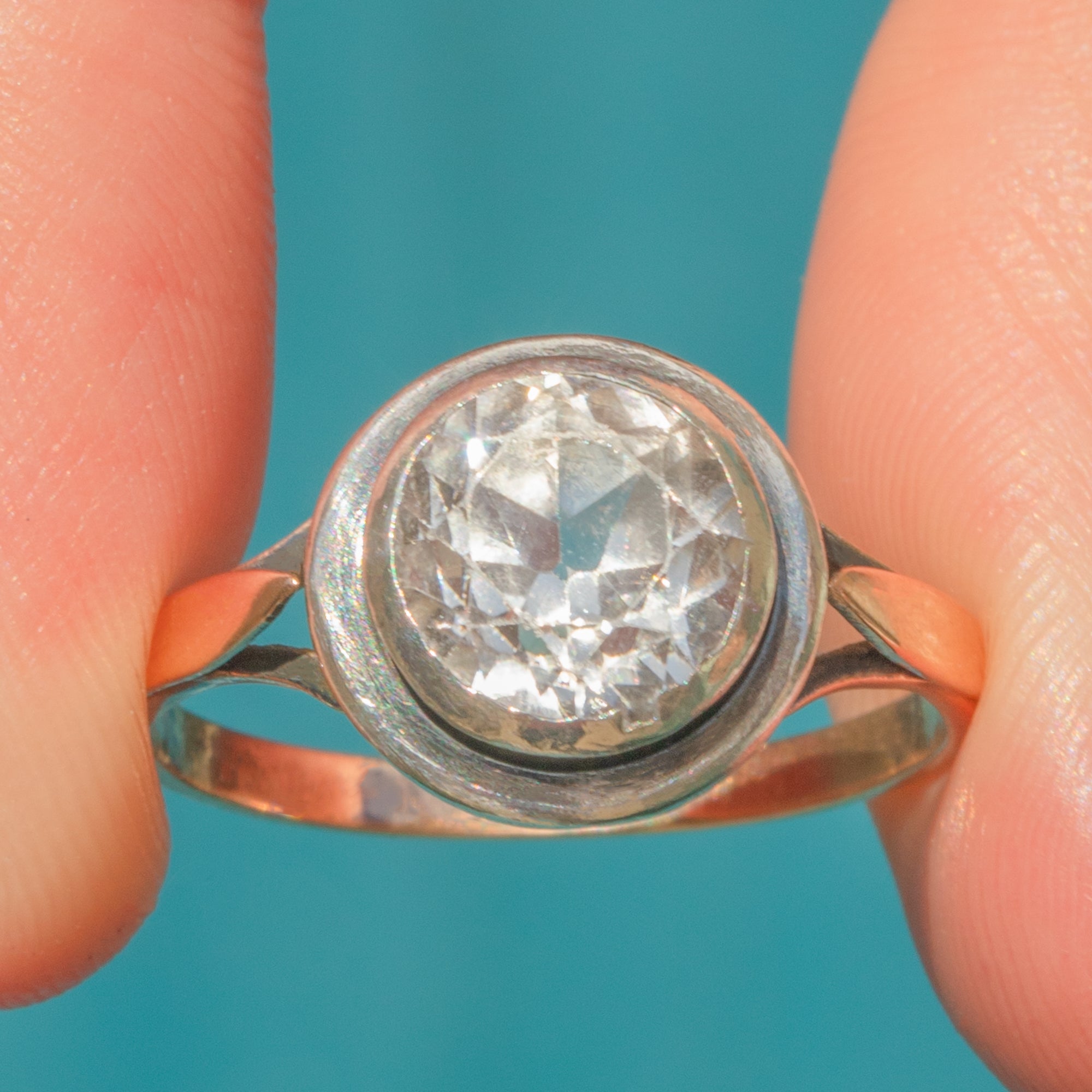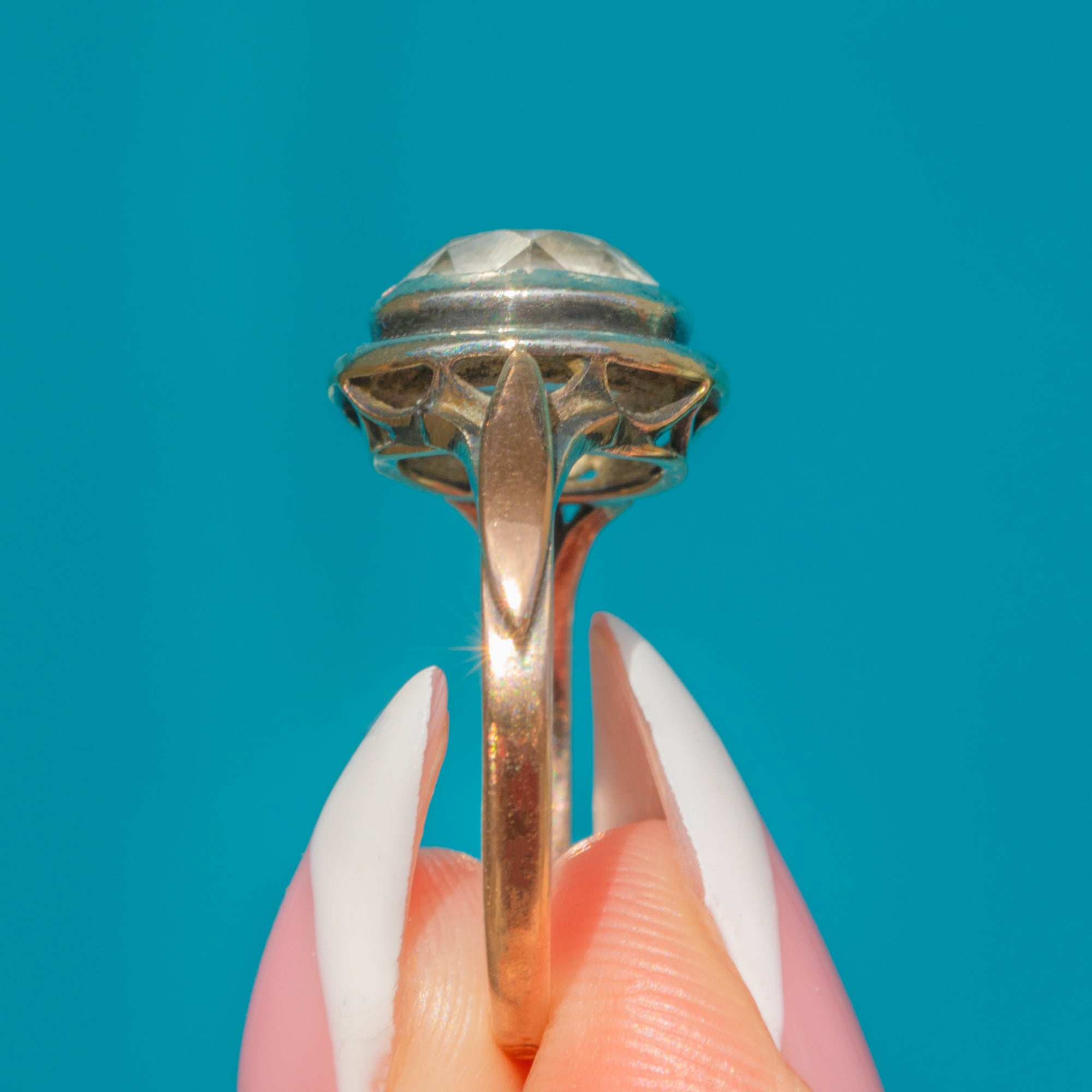 This Victorian ring boasts a spectacular 2.00ct White Sapphire displayed within a bright Sterling Silver setting, poised atop a rosy 15ct Gold band. She glistens from every angle, in every light, making her a real show-stopping piece.