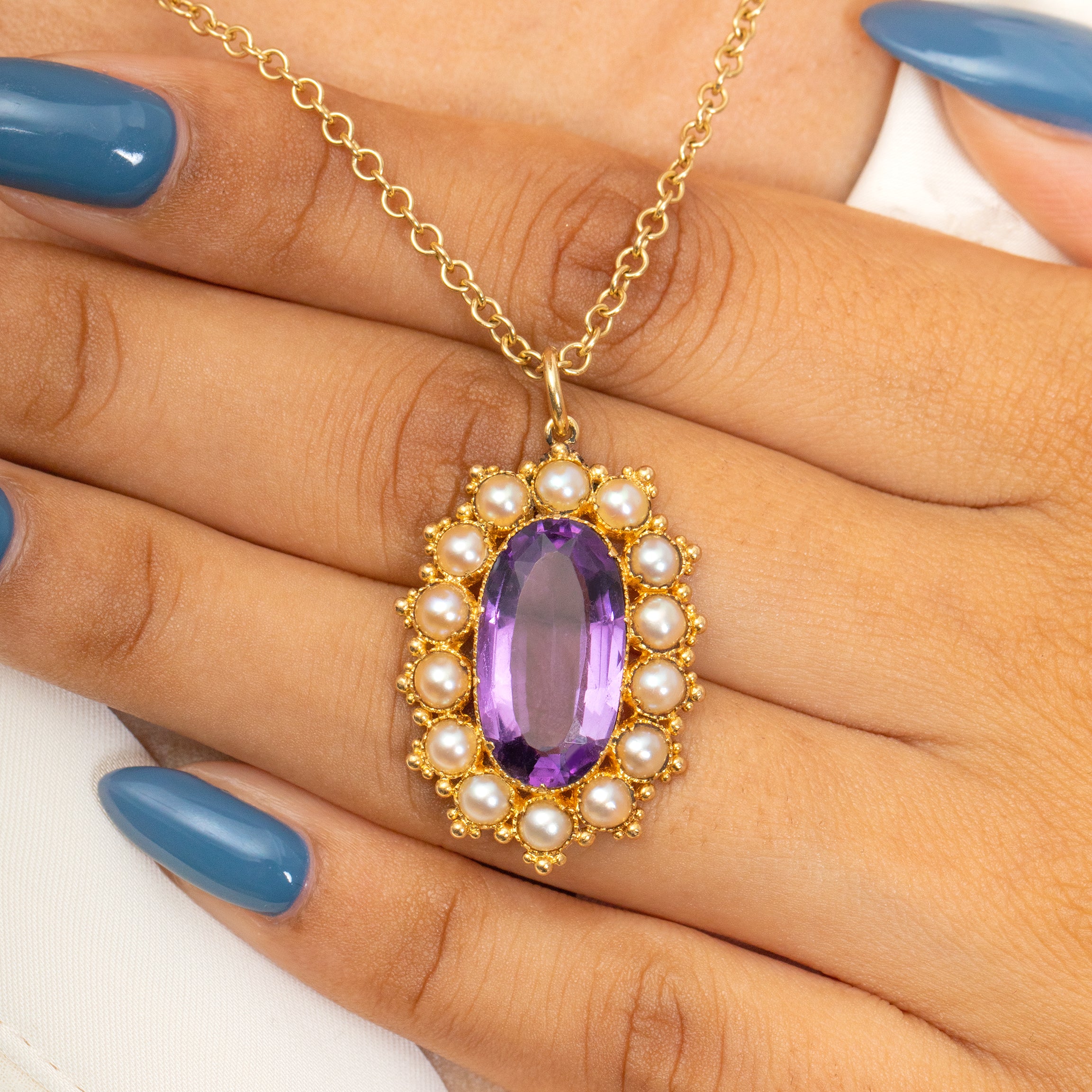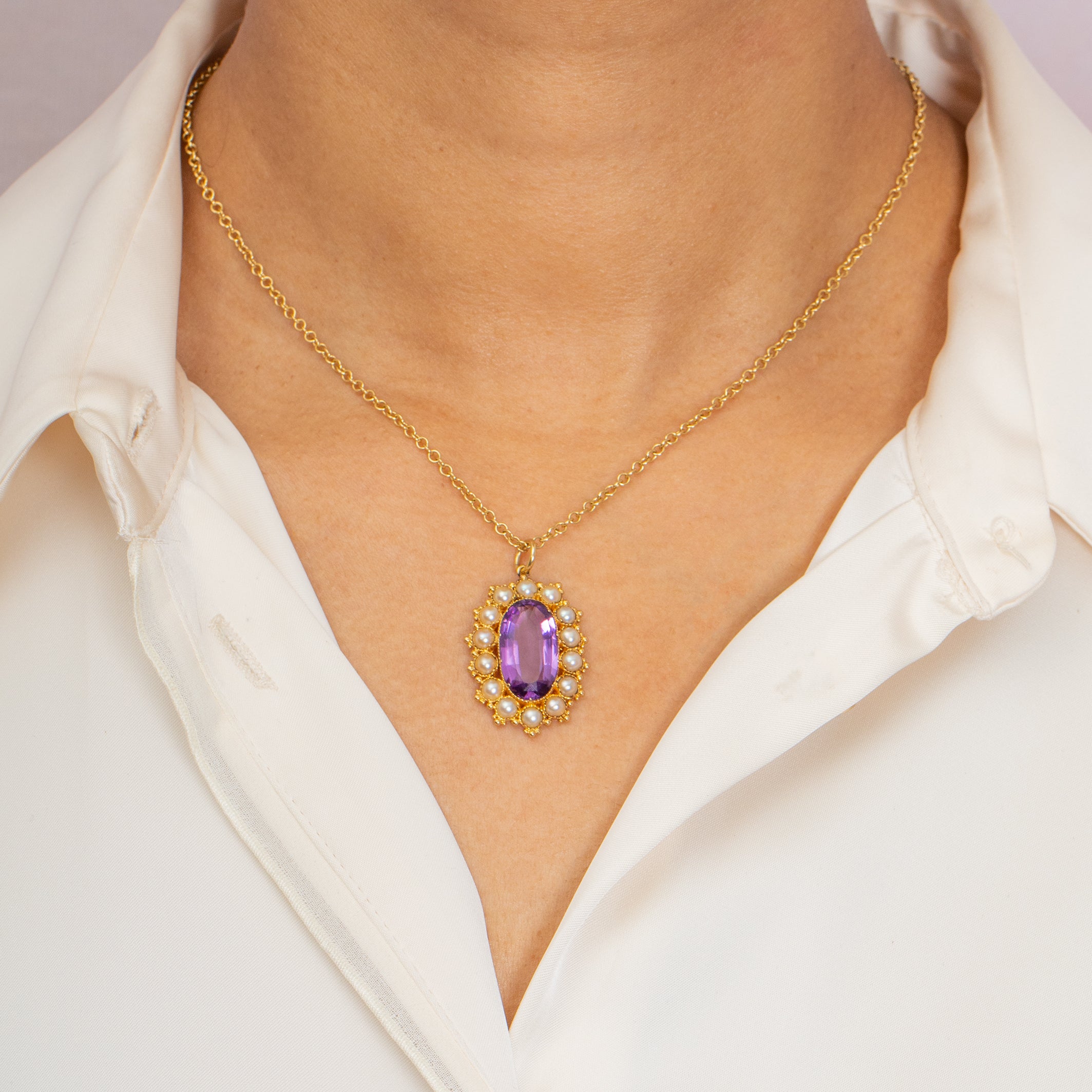 The 4.00ct Amethyst is a succulent and ripe grape hue, haloed by luminous creamy Pearls. This Victorian Gold pendant very much speaks for itself, she's a refined and elegant piece for your antique jewellery collection!