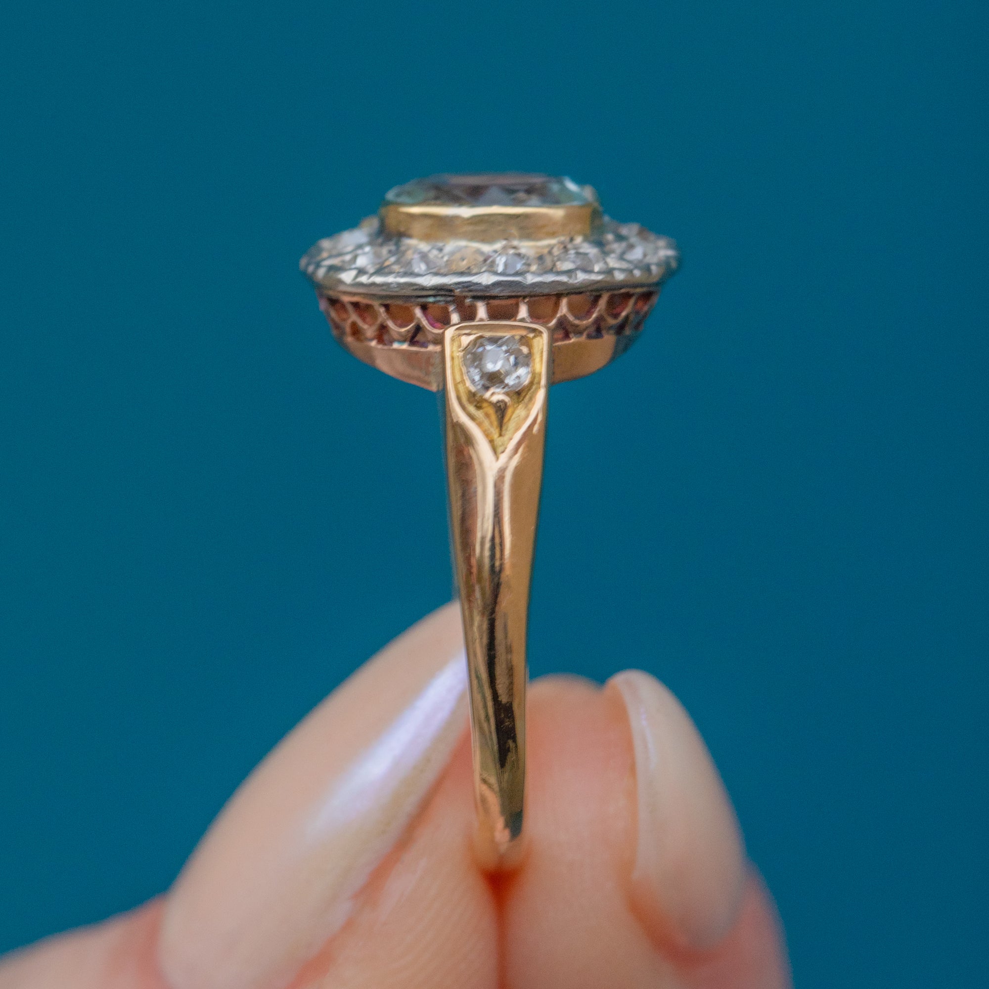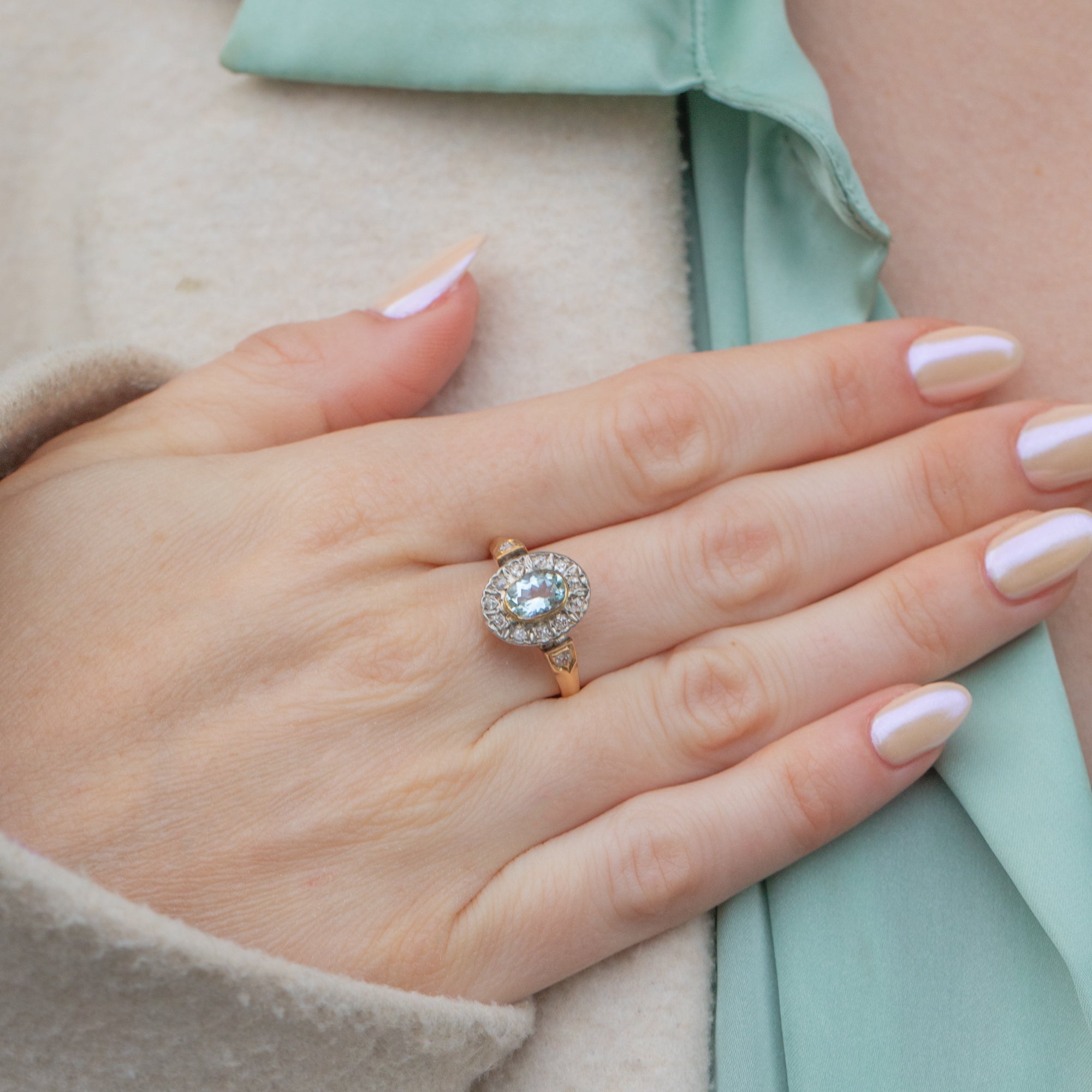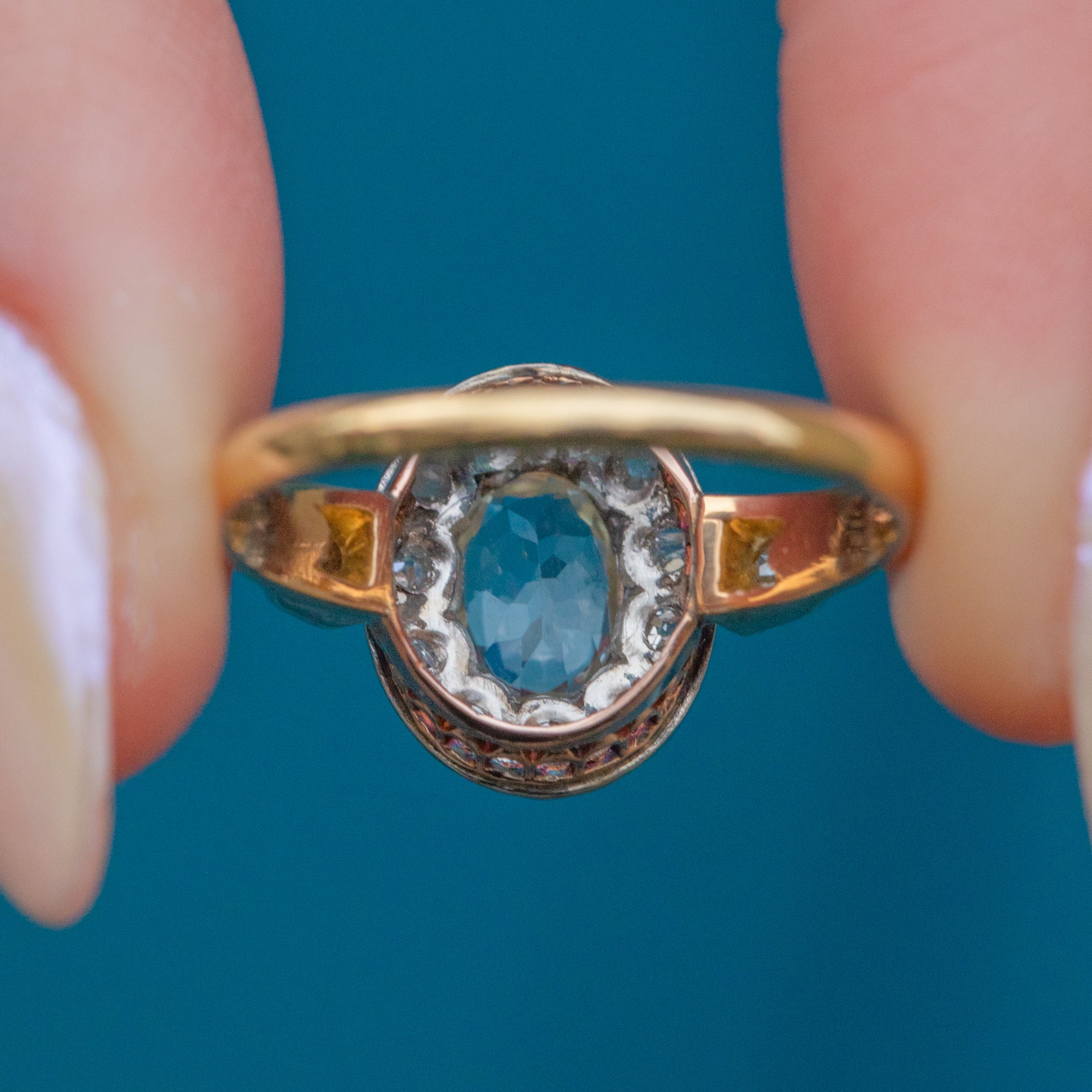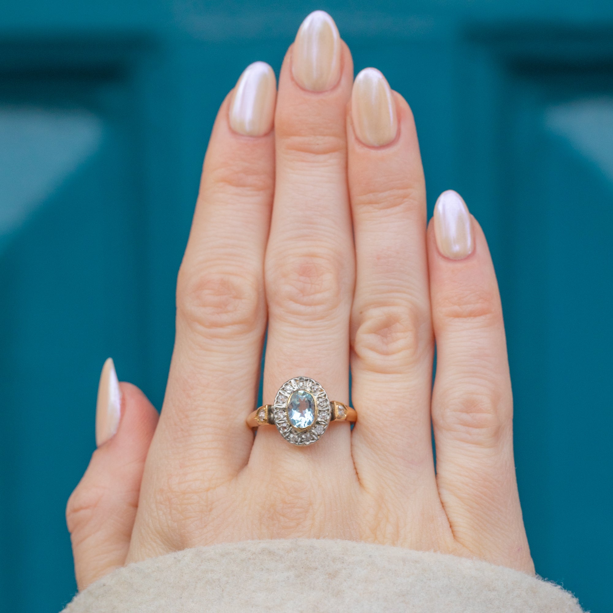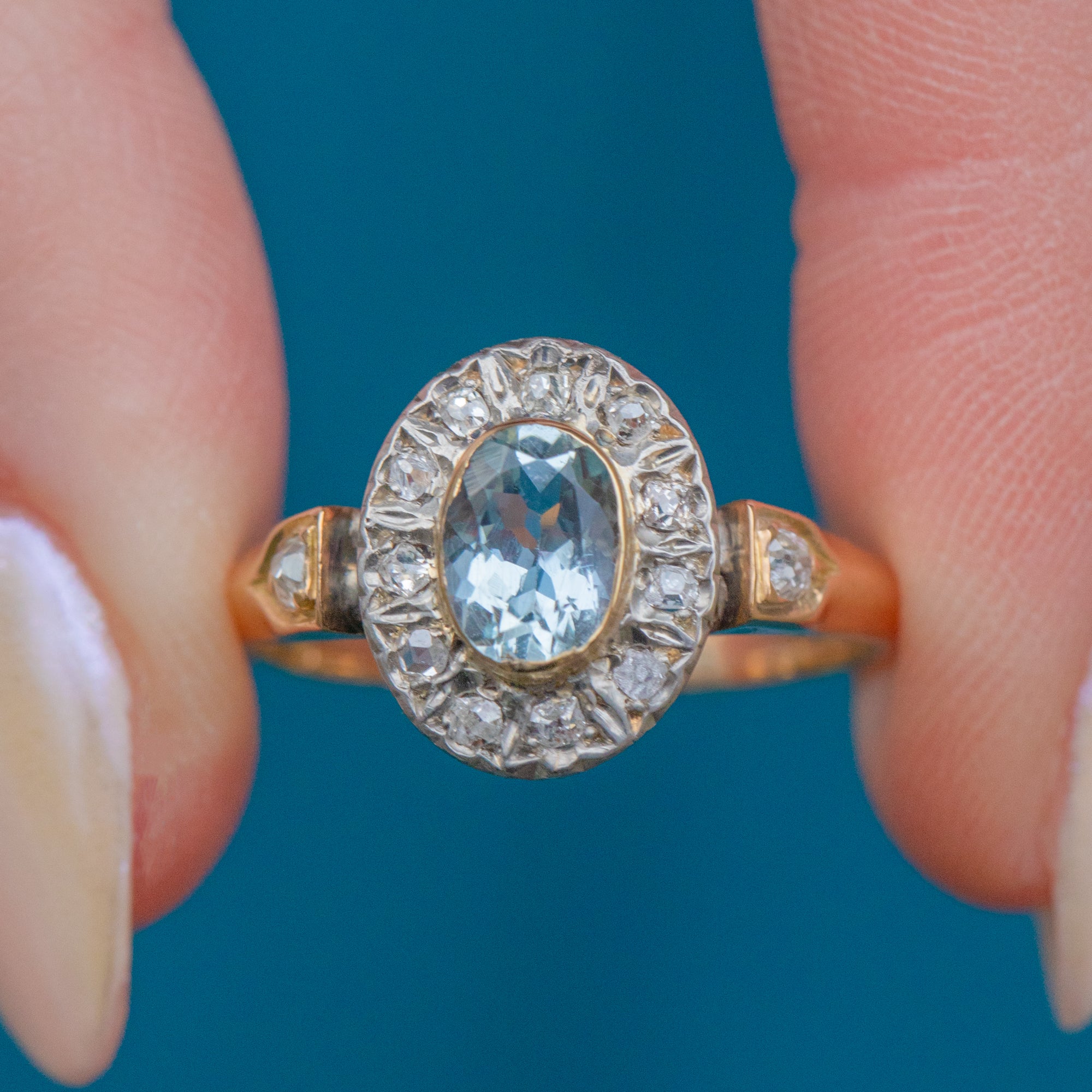 Antique 18ct Gold Aquamarine Diamond Cluster Ring, 0.65ct Aquamarine