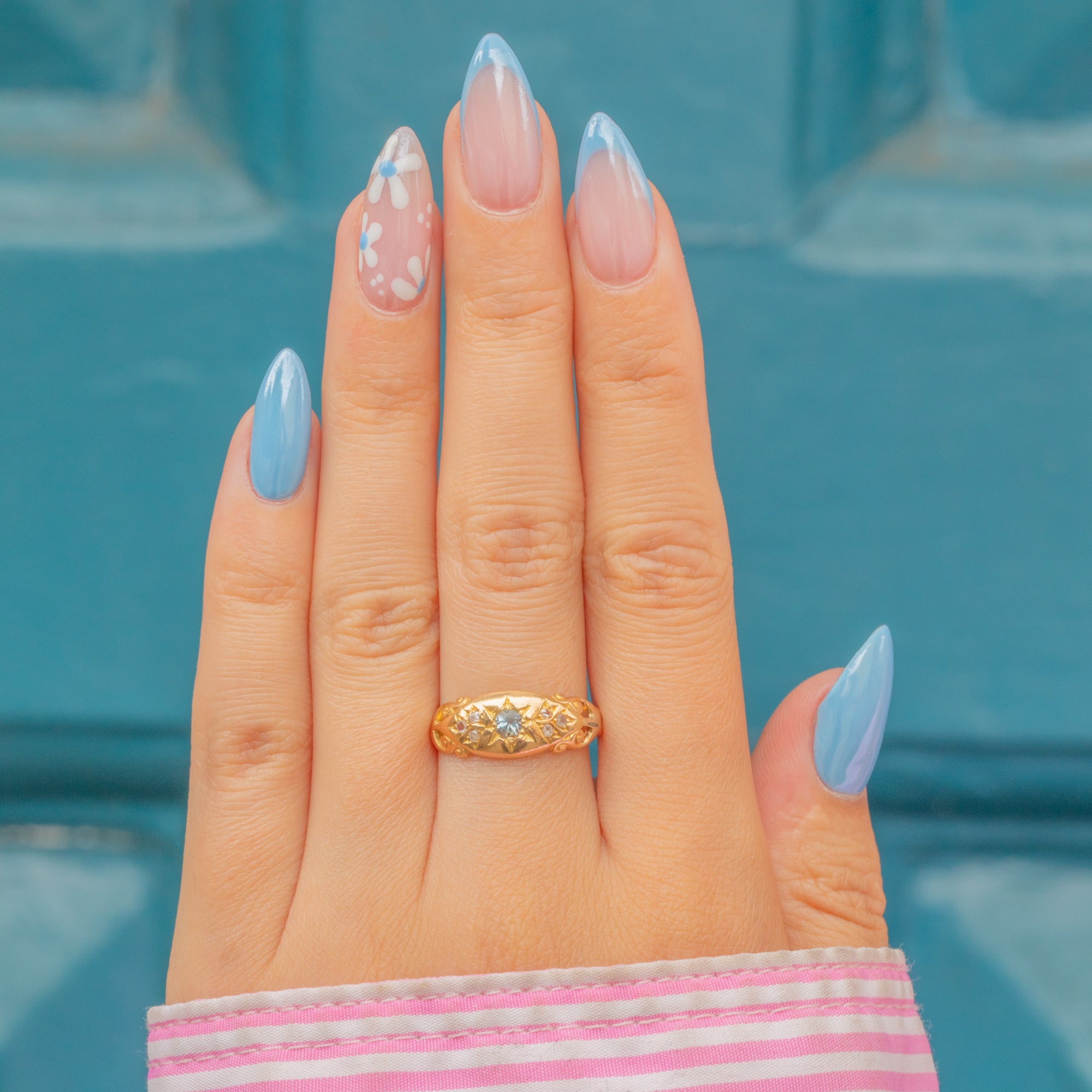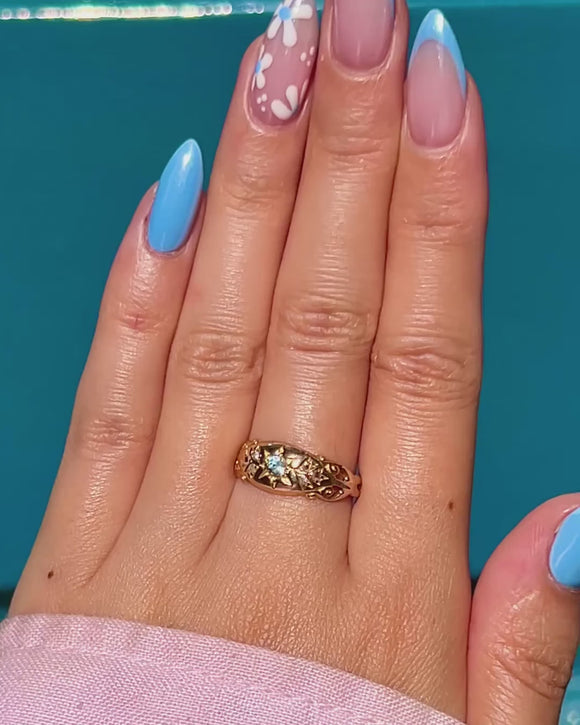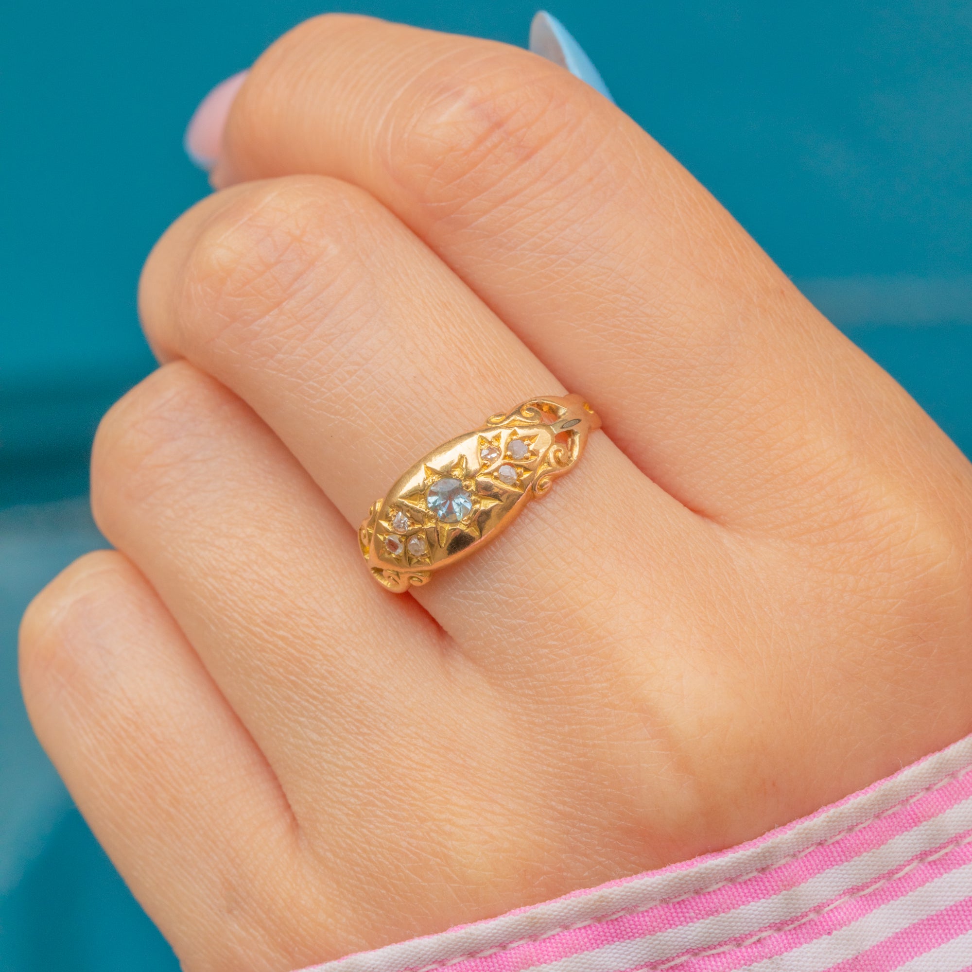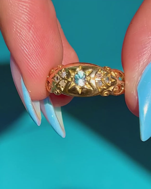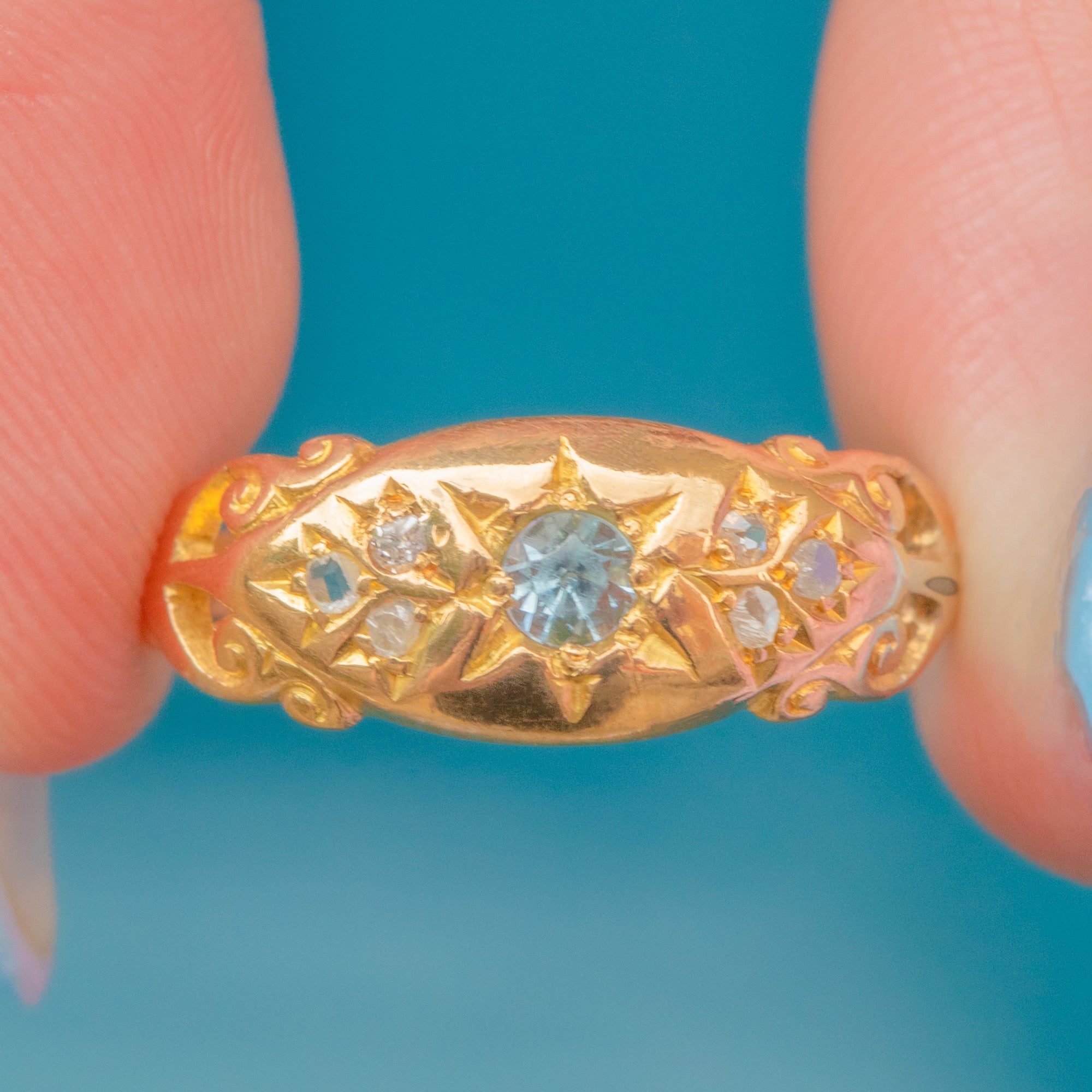Crafted from bright and buttery 18ct Gold, this Victorian gypsy ring is centred by a dazzling icy blue Aquamarine gemstone set in celestial star settings and is flanked by six scintillating Diamonds.
