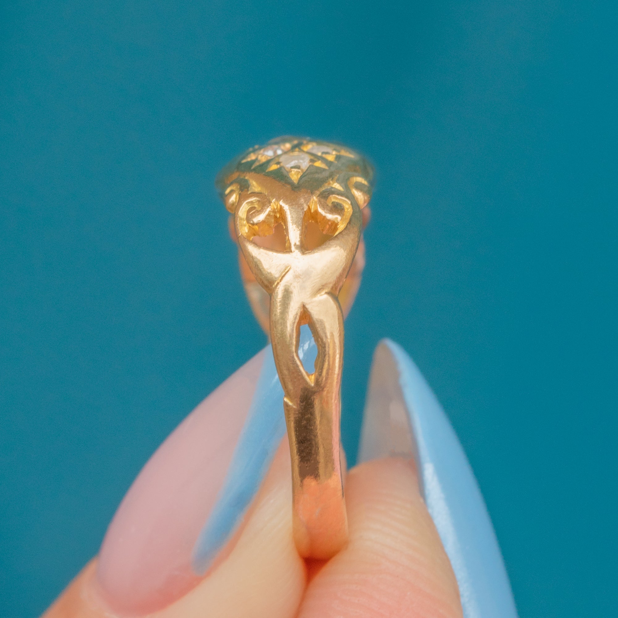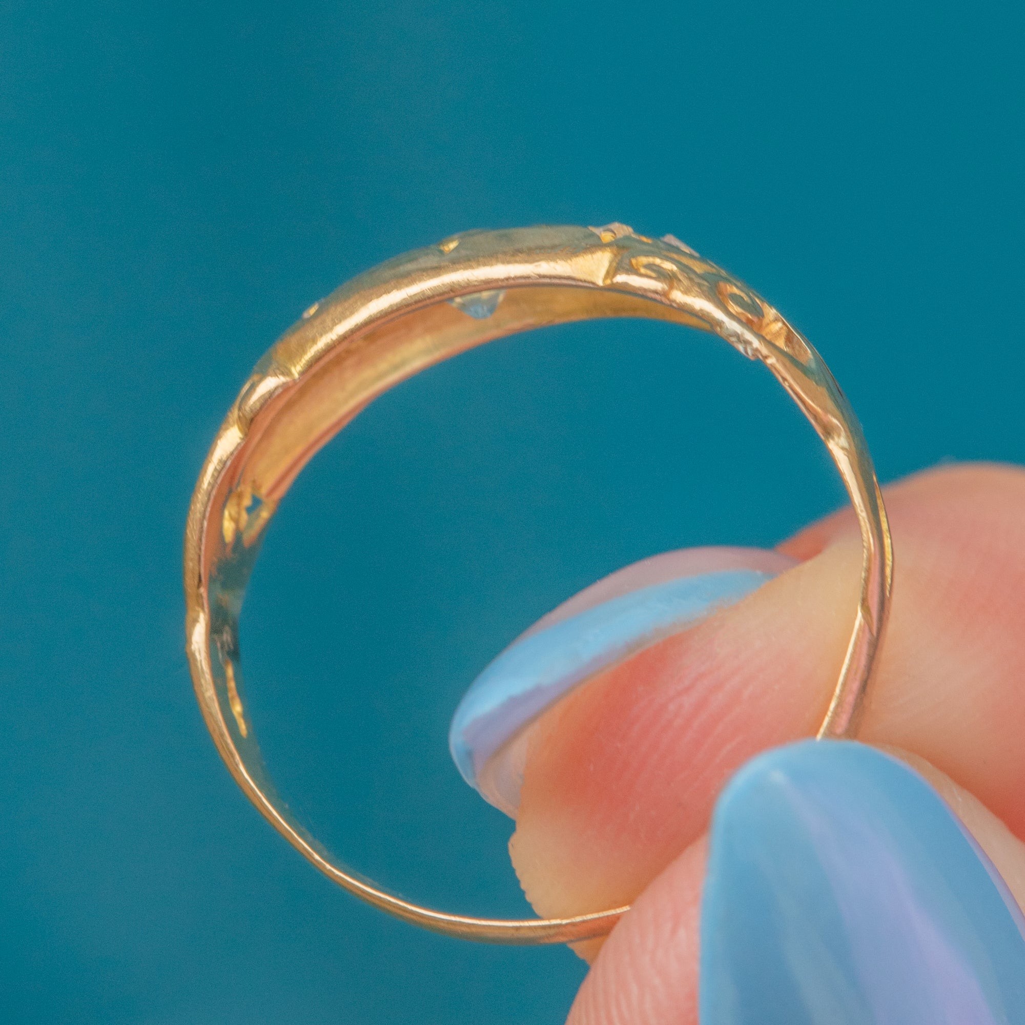 The 18ct Gold band has been intricately engraved with ornate swirling settings, adding an undeniable antique charm to the piece. With a flat profile ideal for stacking, this Victorian gypsy ring will make a wonderful addition to your collection.