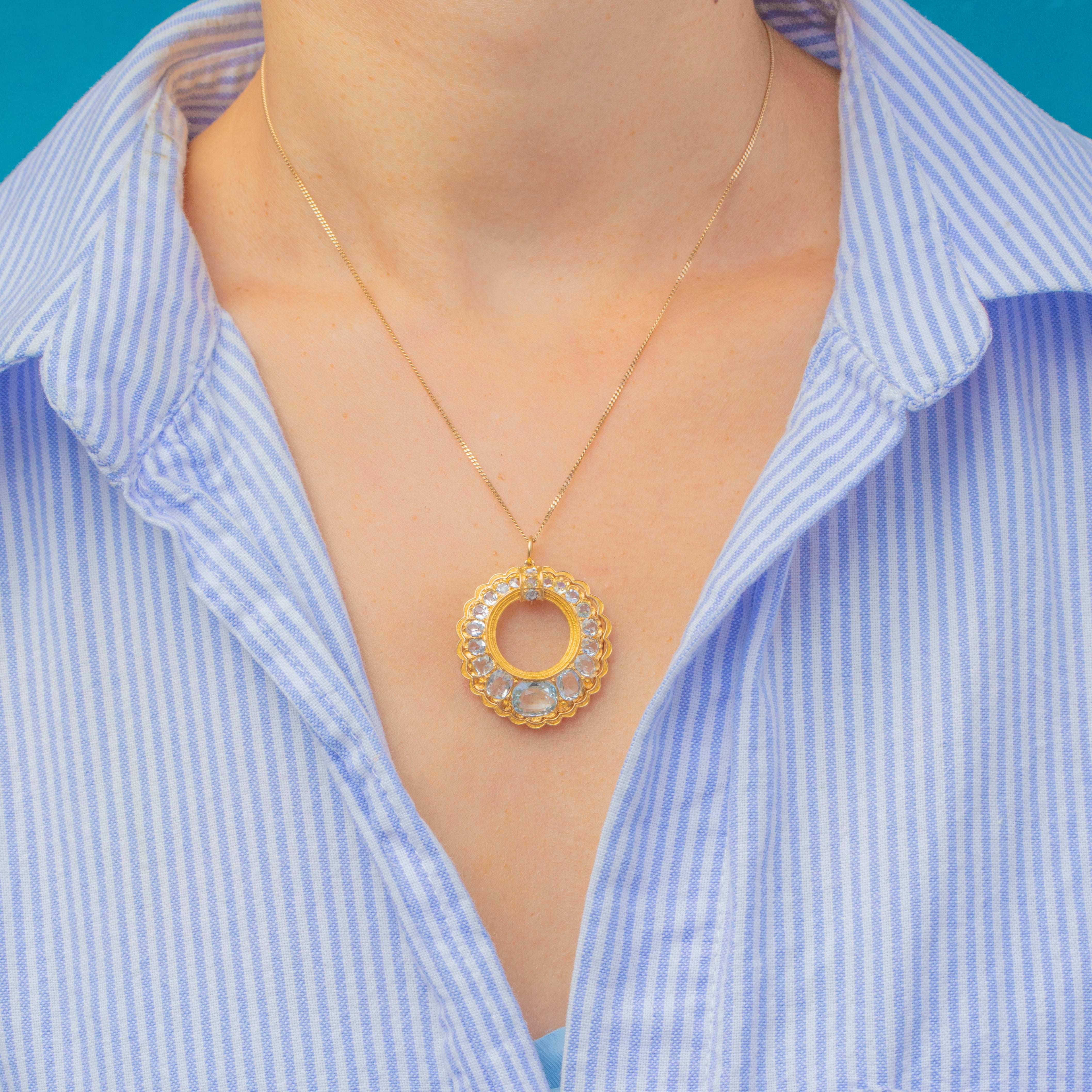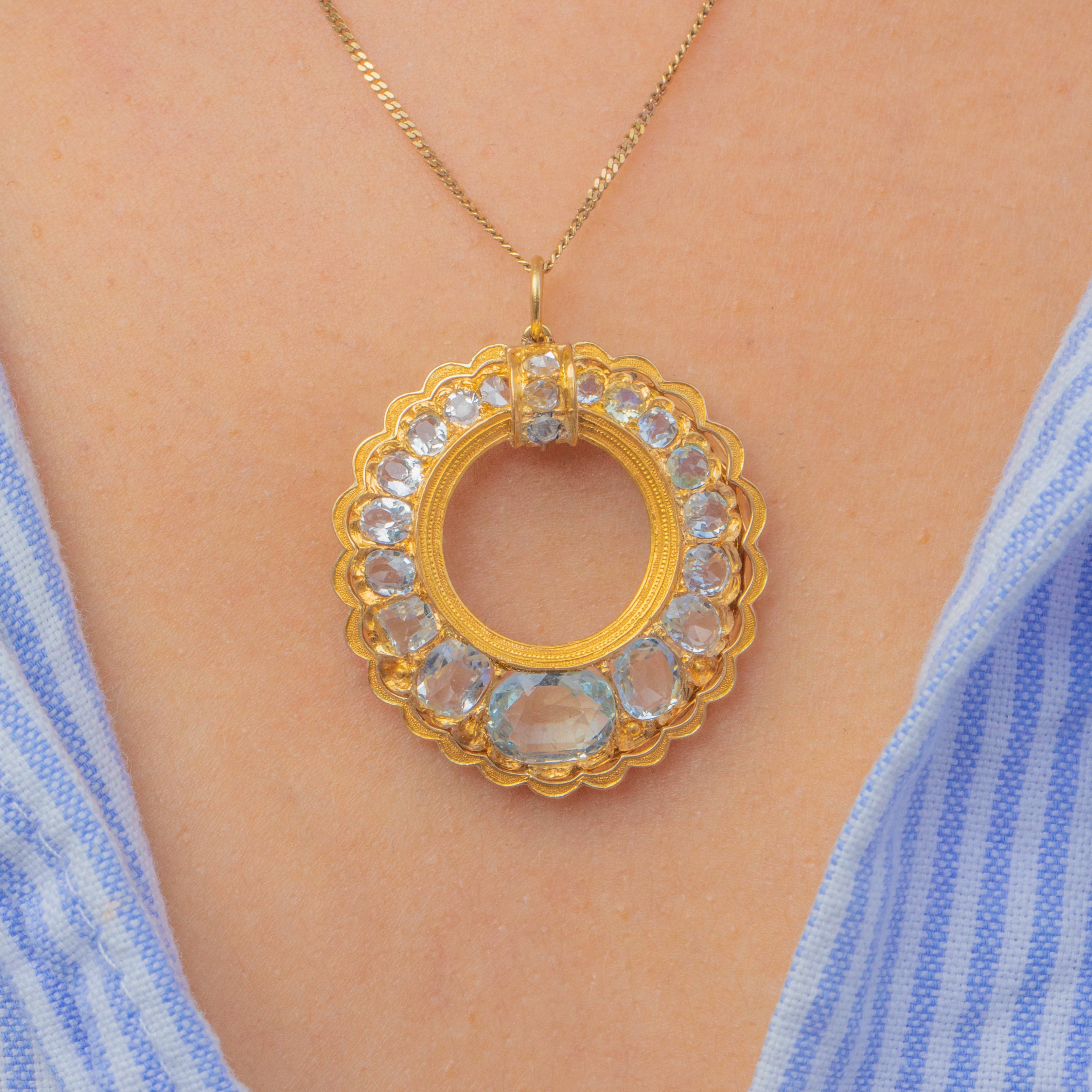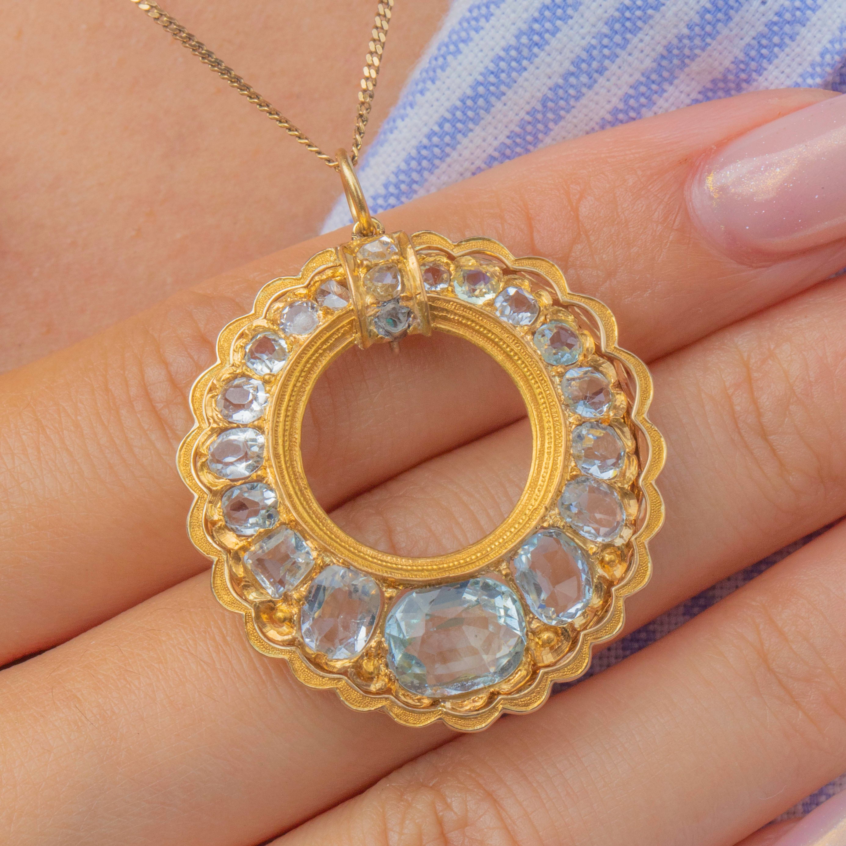 An exquisite antique pendant crafted in 18ct Gold, featuring a central Aquamarine surrounded by a selection of smaller graduating Aquamarines and sparkling Diamonds. The soft blue hues of the Aquamarines are beautifully complemented by the warm Gold setting, creating a delicate yet striking garland or buckle-inspired design.