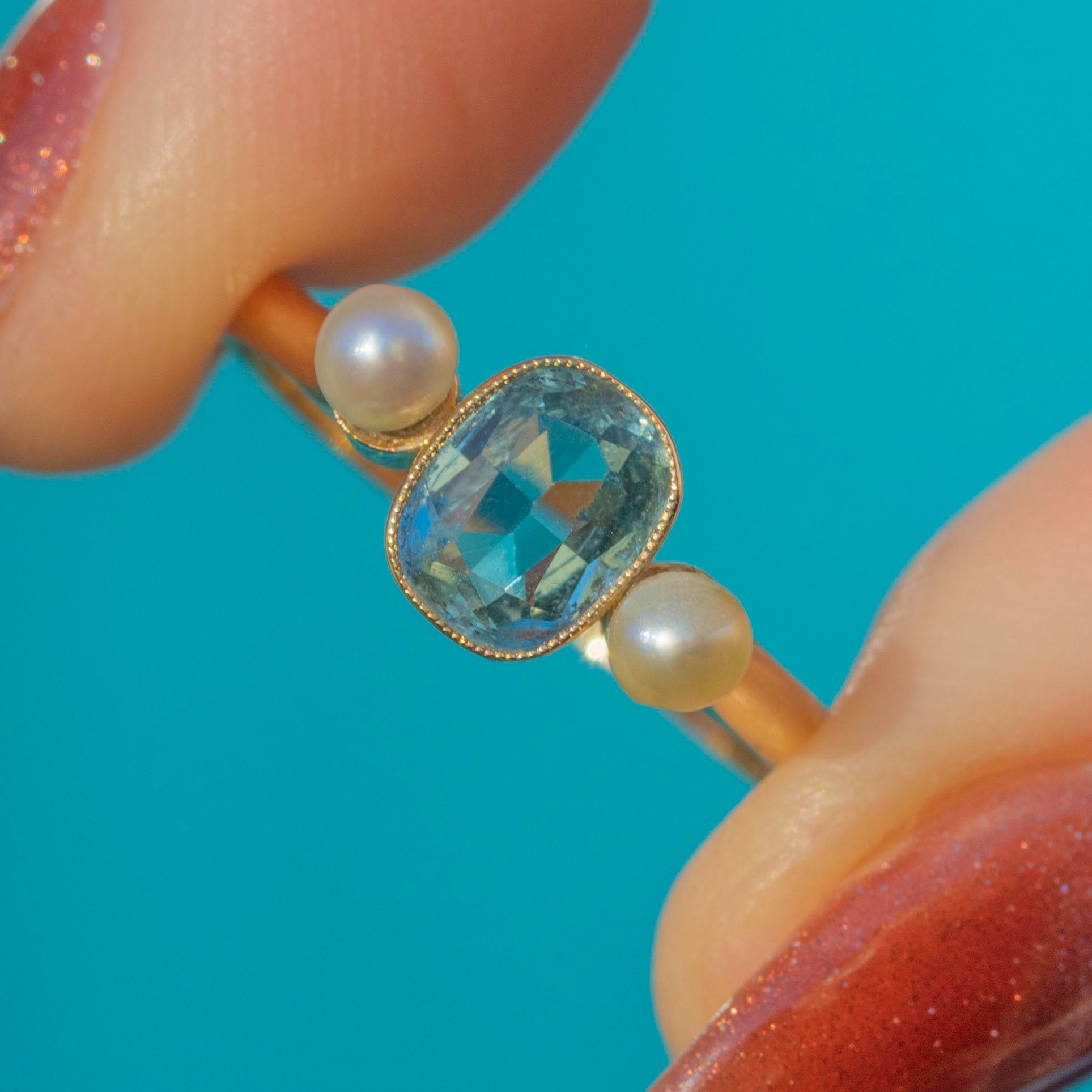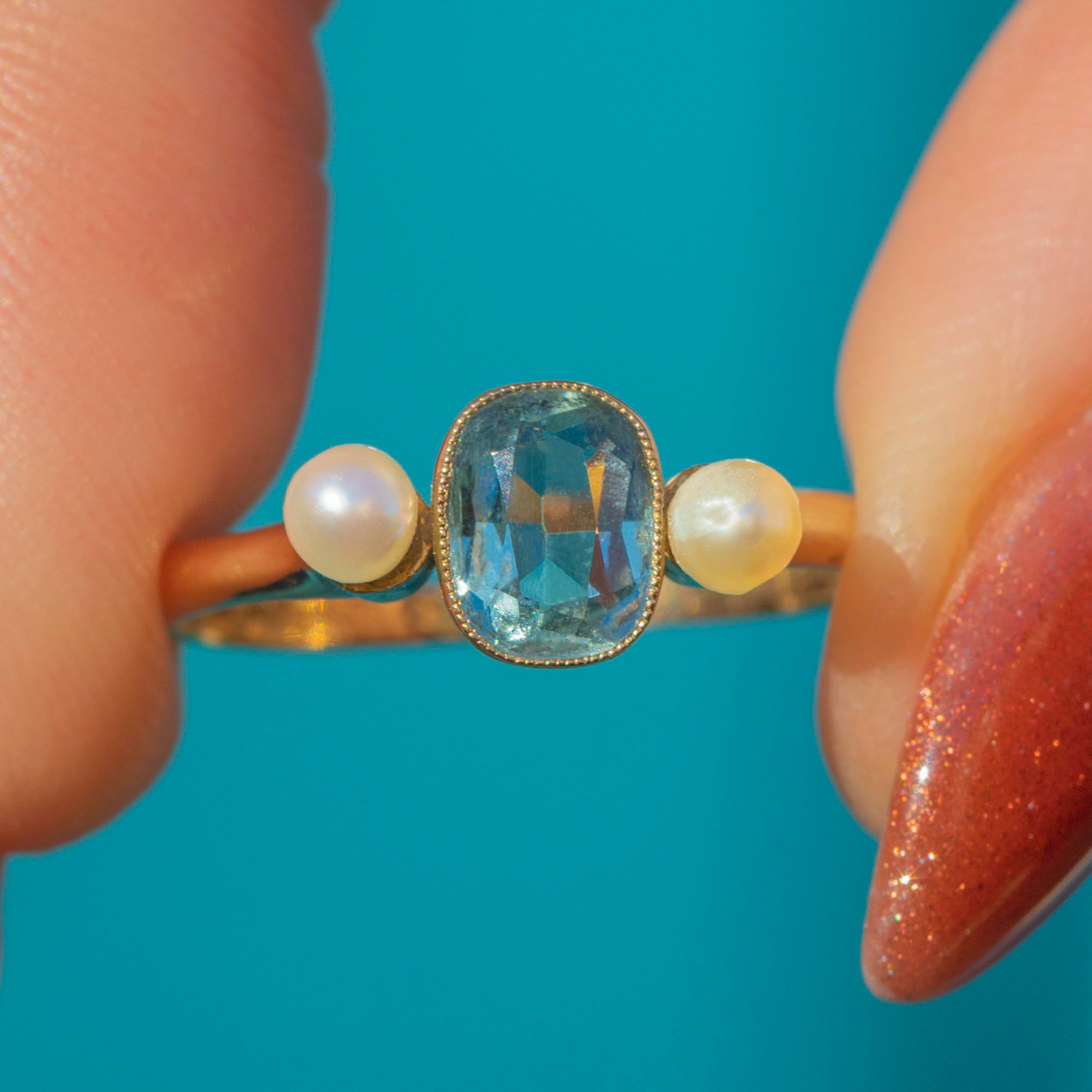 VERY GOOD. This antique 18ct Gold Aquamarine and Pearl three stone ring is in very good condition. Each gemstone is beautiful and sits securely within its setting. One Pearl is slightly duller than the other, commensurate with age. There are some signs of wear on the inside of the band, but there is no evidence of resizing. Considering her age, she is in lovely condition and would make a superb addition to your collection!