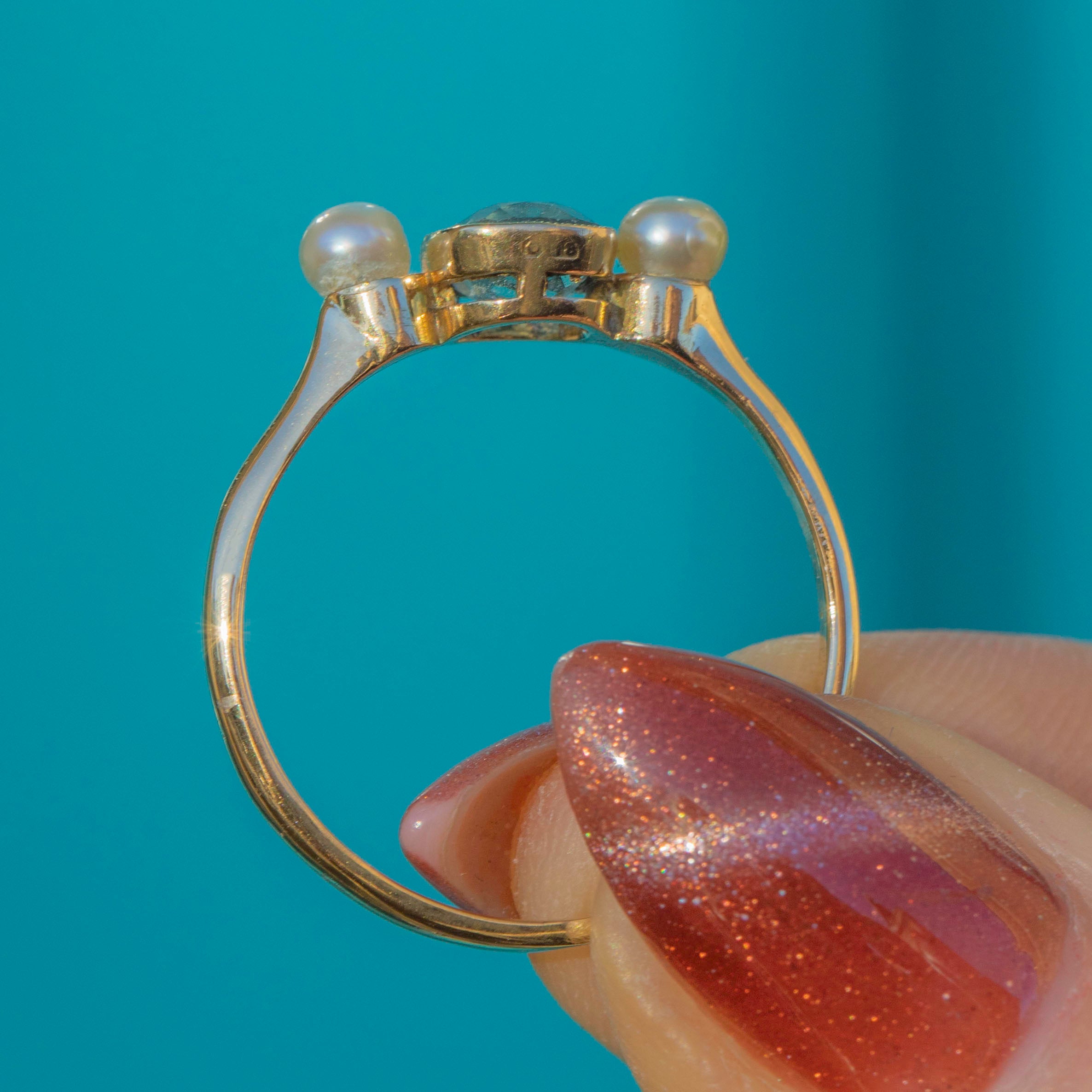This antique 18ct Gold Aquamarine Pearl three stone ring is simply stunning!