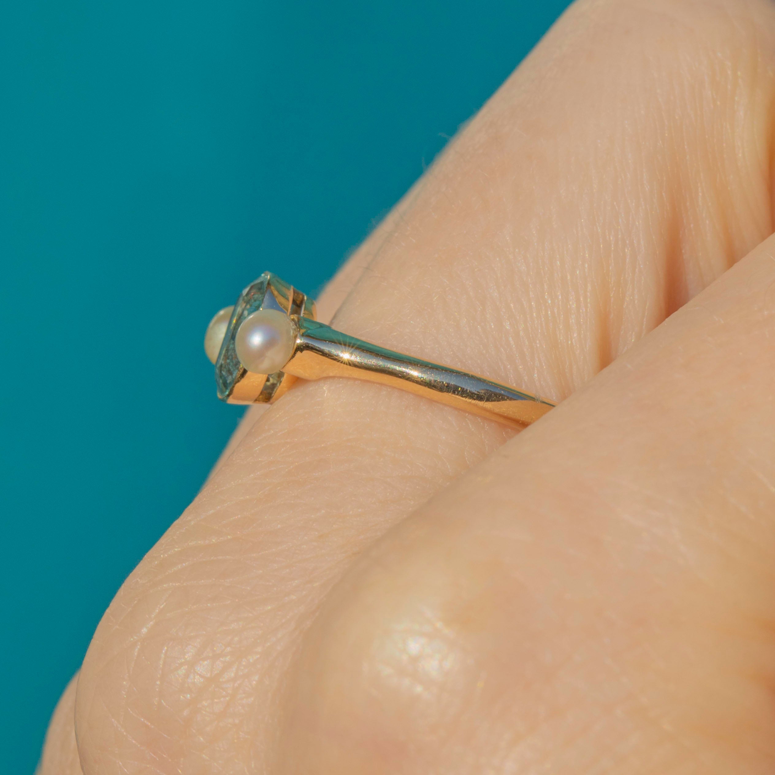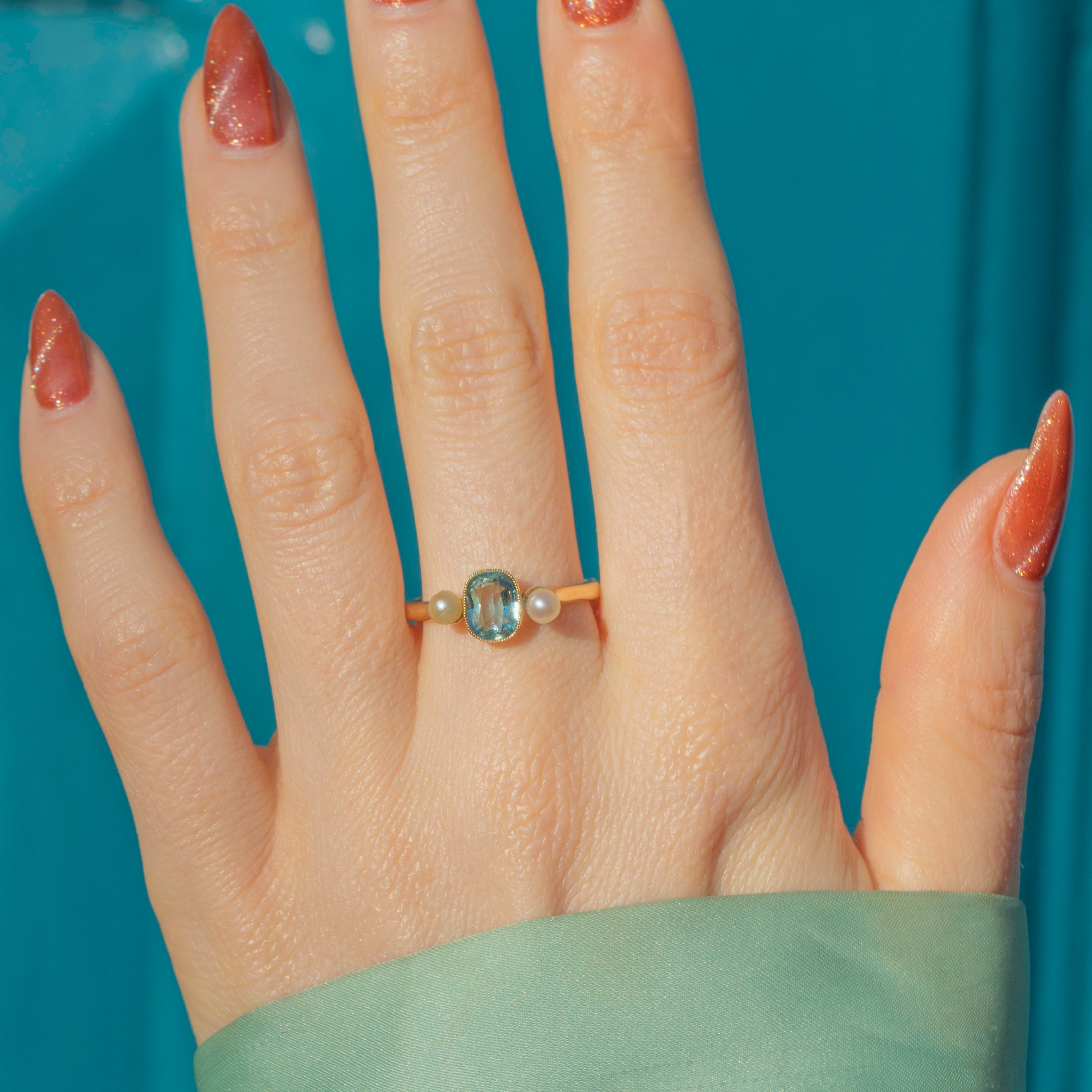 In her centre sits a 1.90ct icy blue Aquamarine, with soft hues akin to a spring morning sky. She is flanked by two iridescent Pearls, their creamy tones effortlessly complementing the Aquamarine. Each antique gemstone is married by the warmth of their buttery 18ct Gold bezels and shank, together forming an elegant and sophisticated piece.