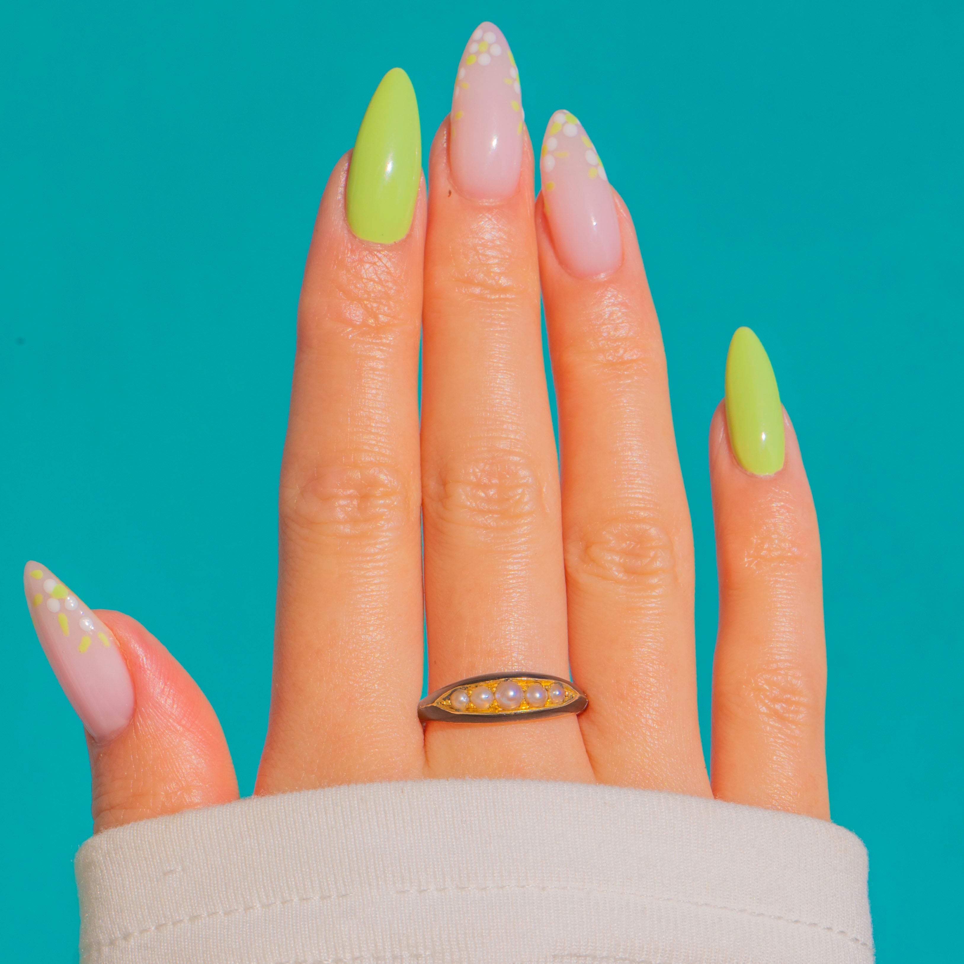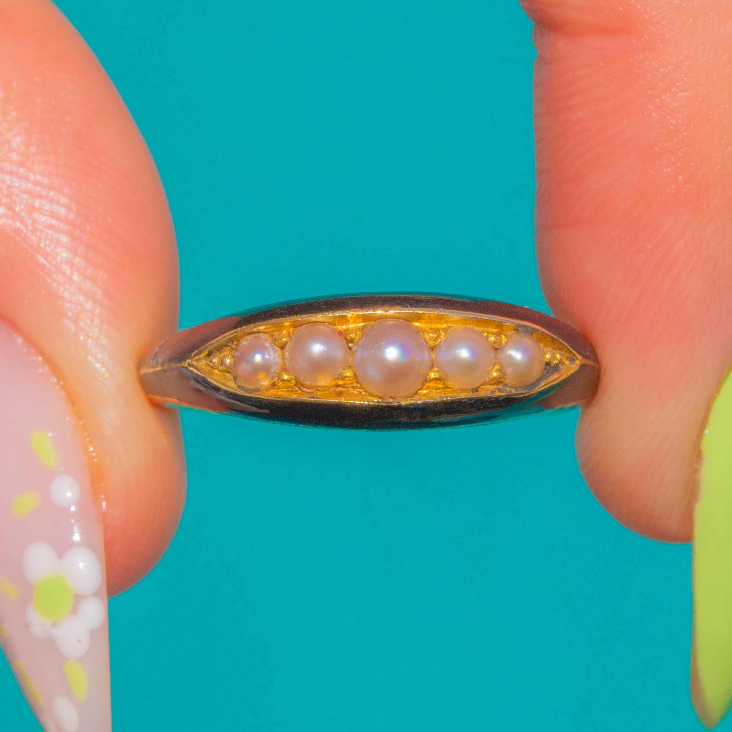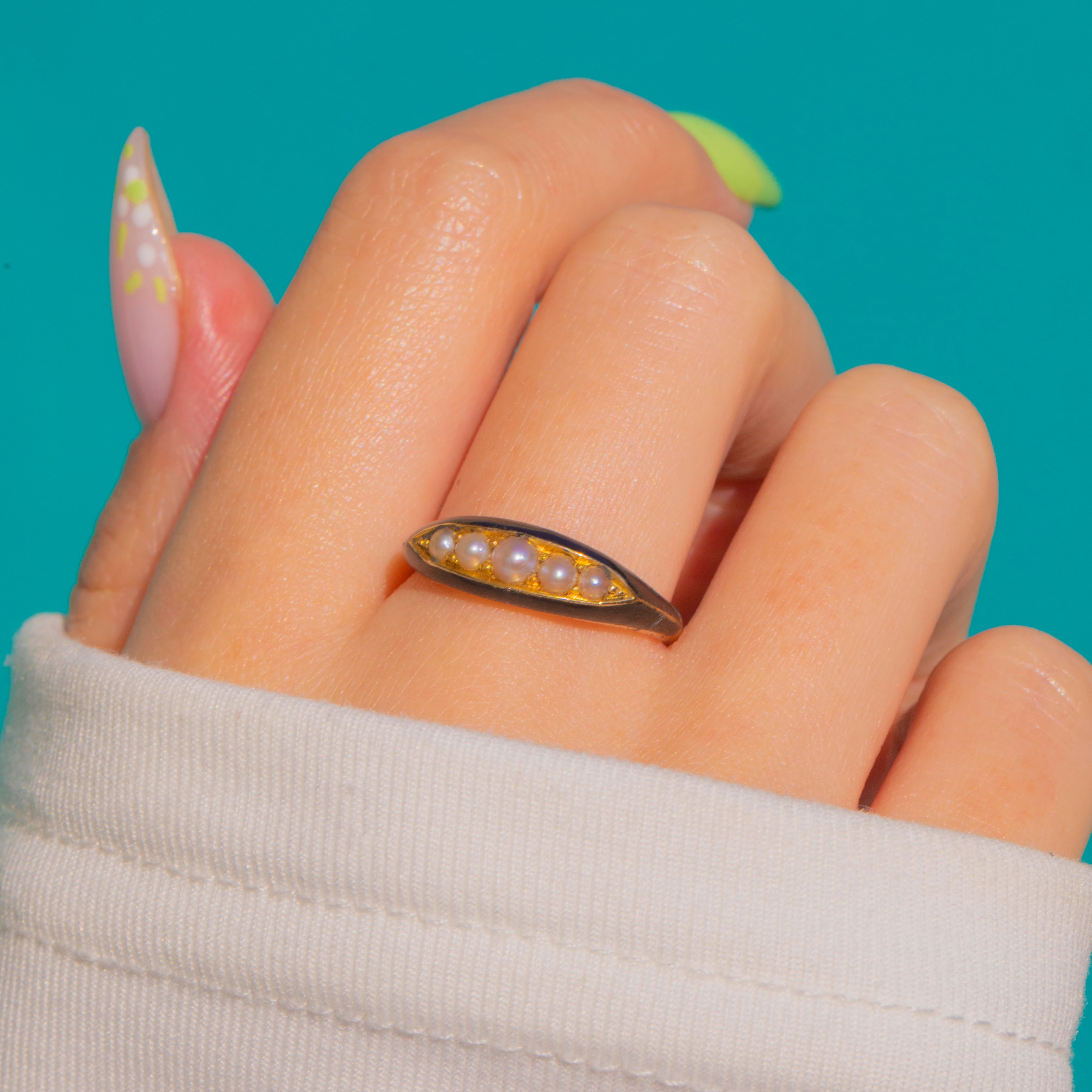 Sleek, softly romantic and unmistakably Victorian, this five-stone Pearl ring marries the glow of 18ct Gold with inky Black Enamel for a timeless navette silhouette. A recessed marquise panel hosts five creamy Seed Pearls in a gentle graduation, the central gem just a touch larger for a subtle focal point. The low-profile design feels refined and effortless, letting the Pearls’ delicate lustre take centre stage against the elegant dark enamel accents.