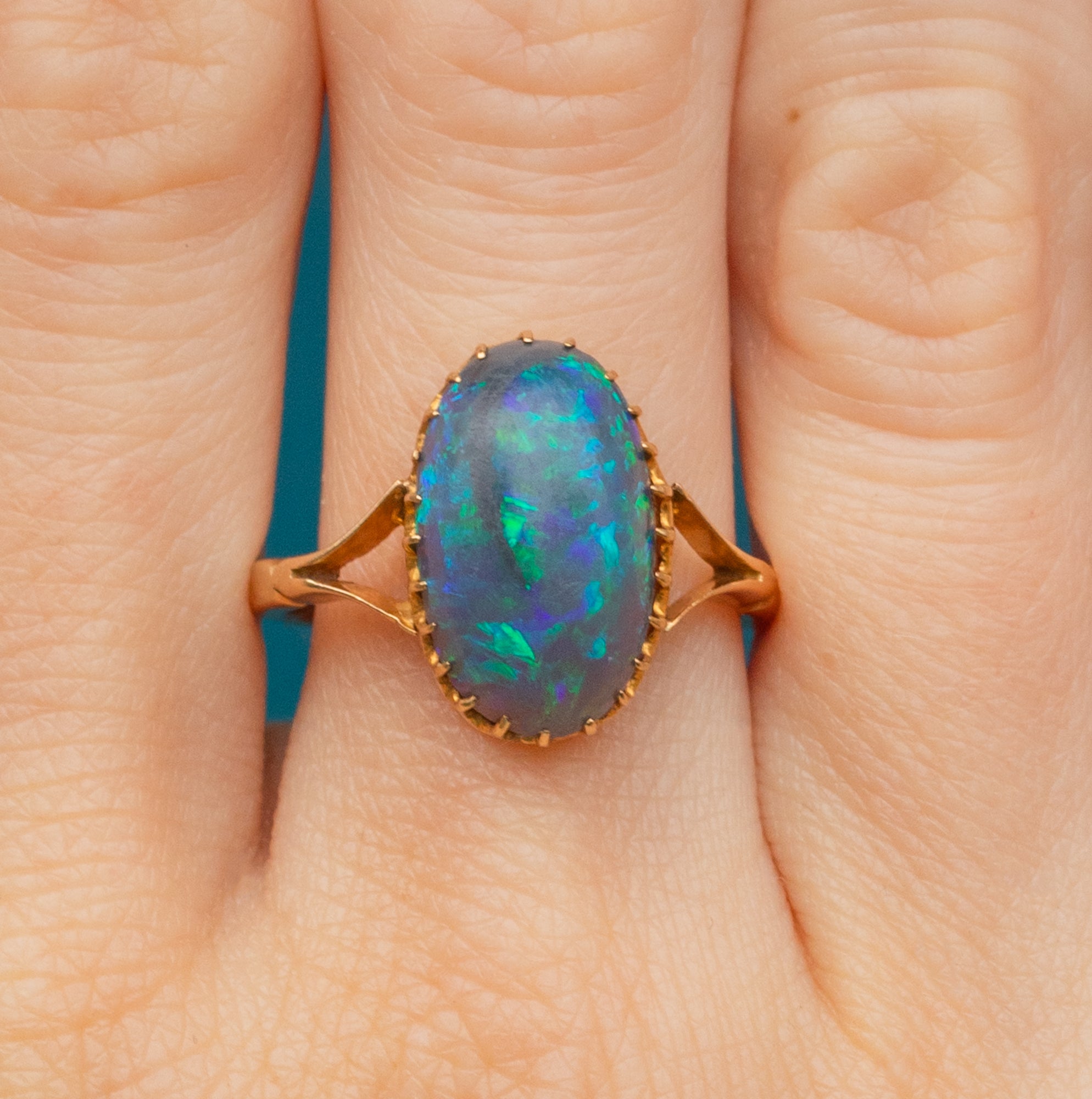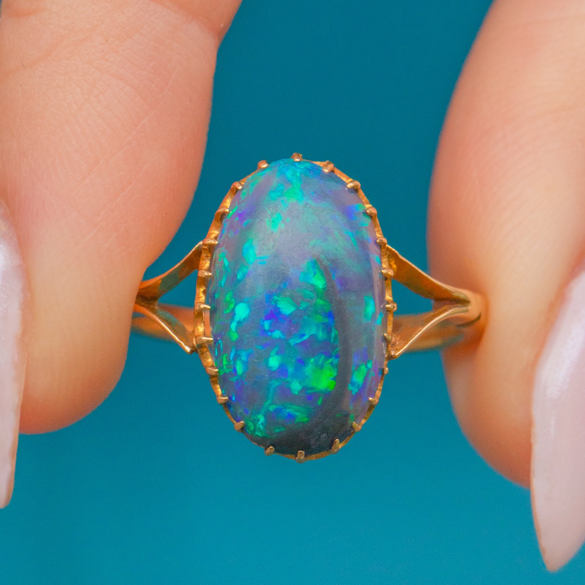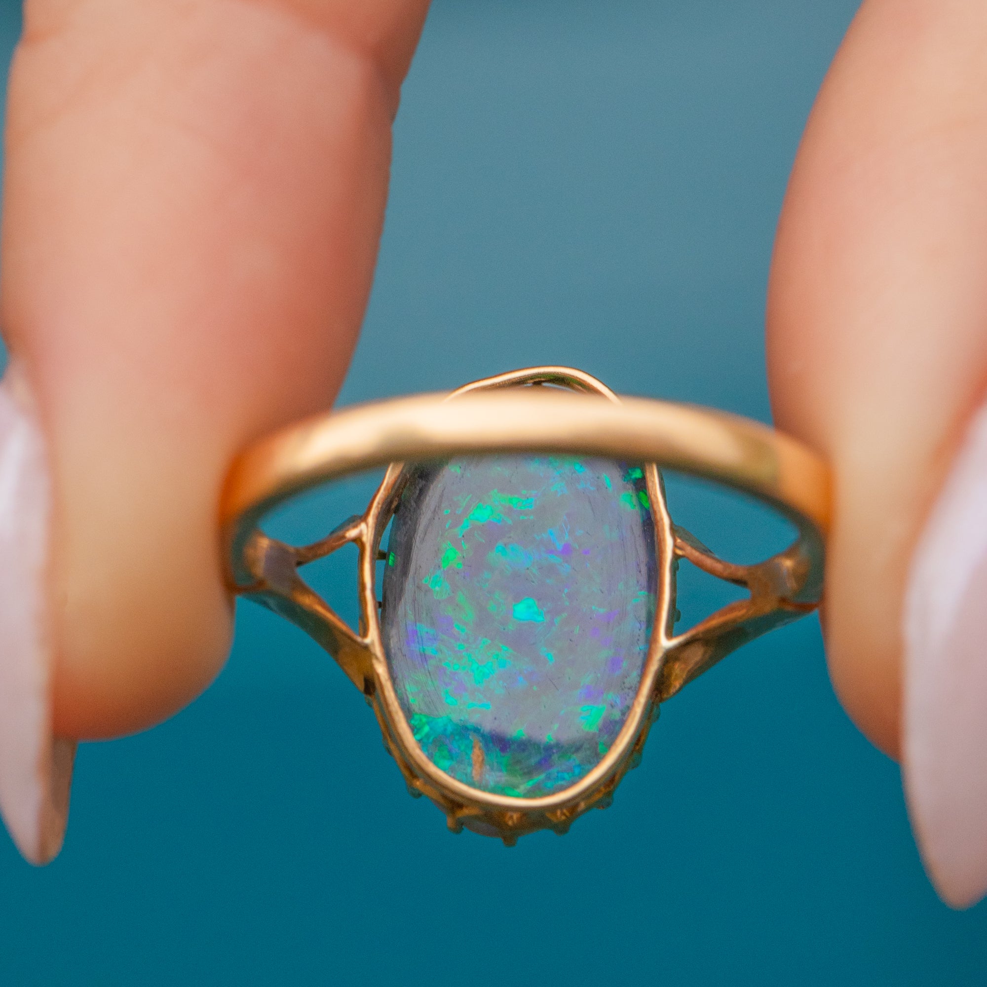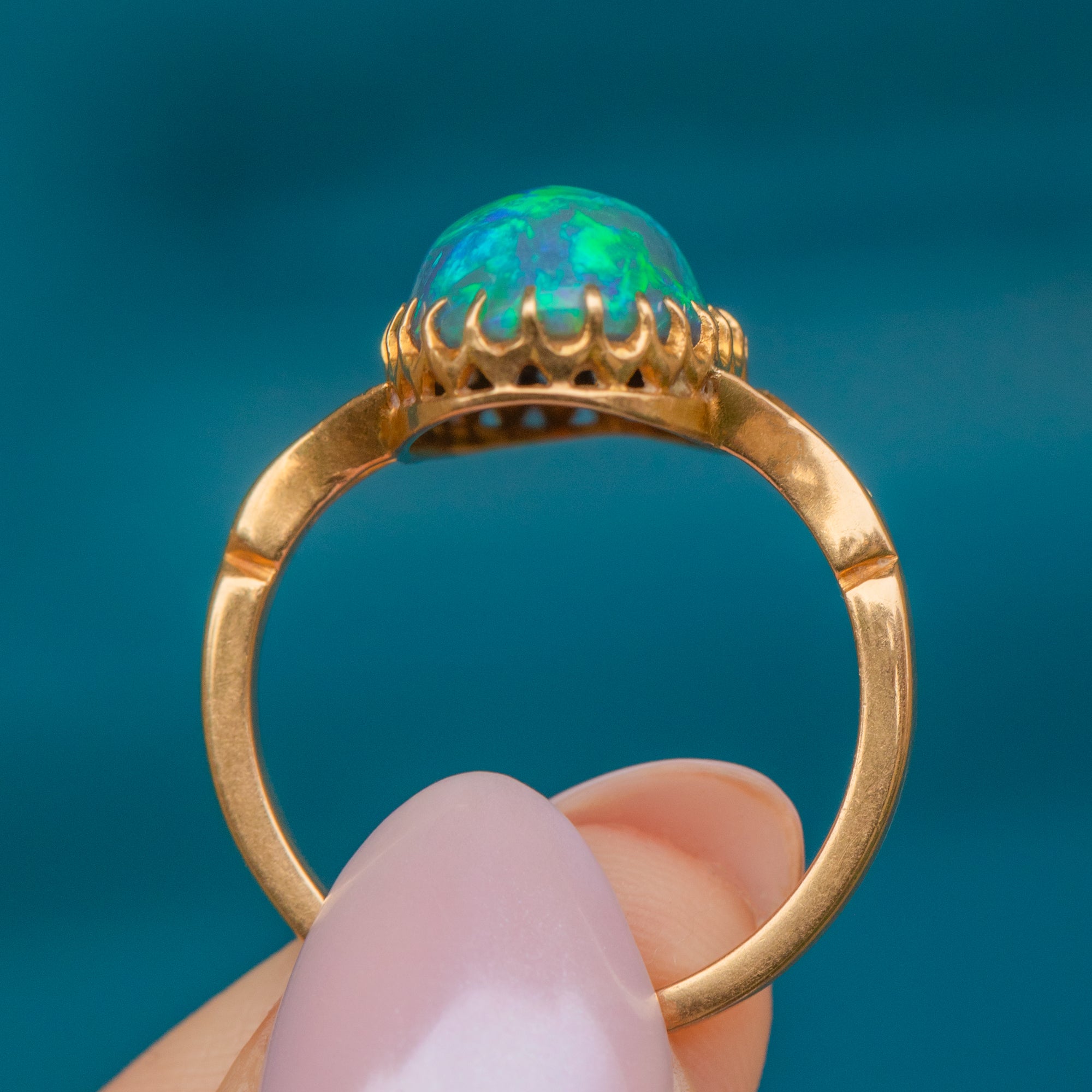Mined from Lightening Ridge in New South Wales, Australia, this rare Gemstone has travelled far and wide to be with us today. Embraced by dainty claw settings crafted entirely from buttery 18ct Gold, this antique Opal ring will make a striking and feminine addition to your collection!
