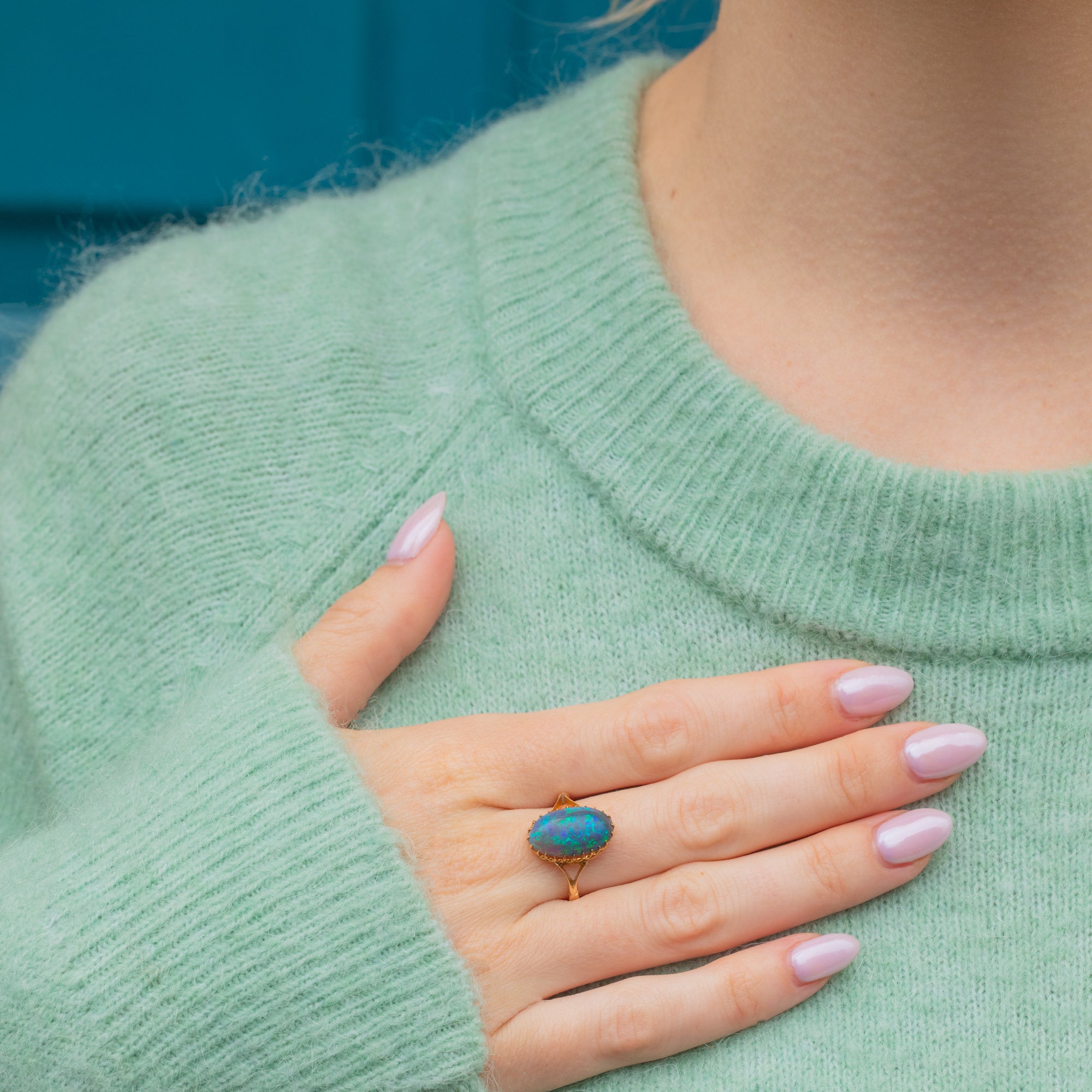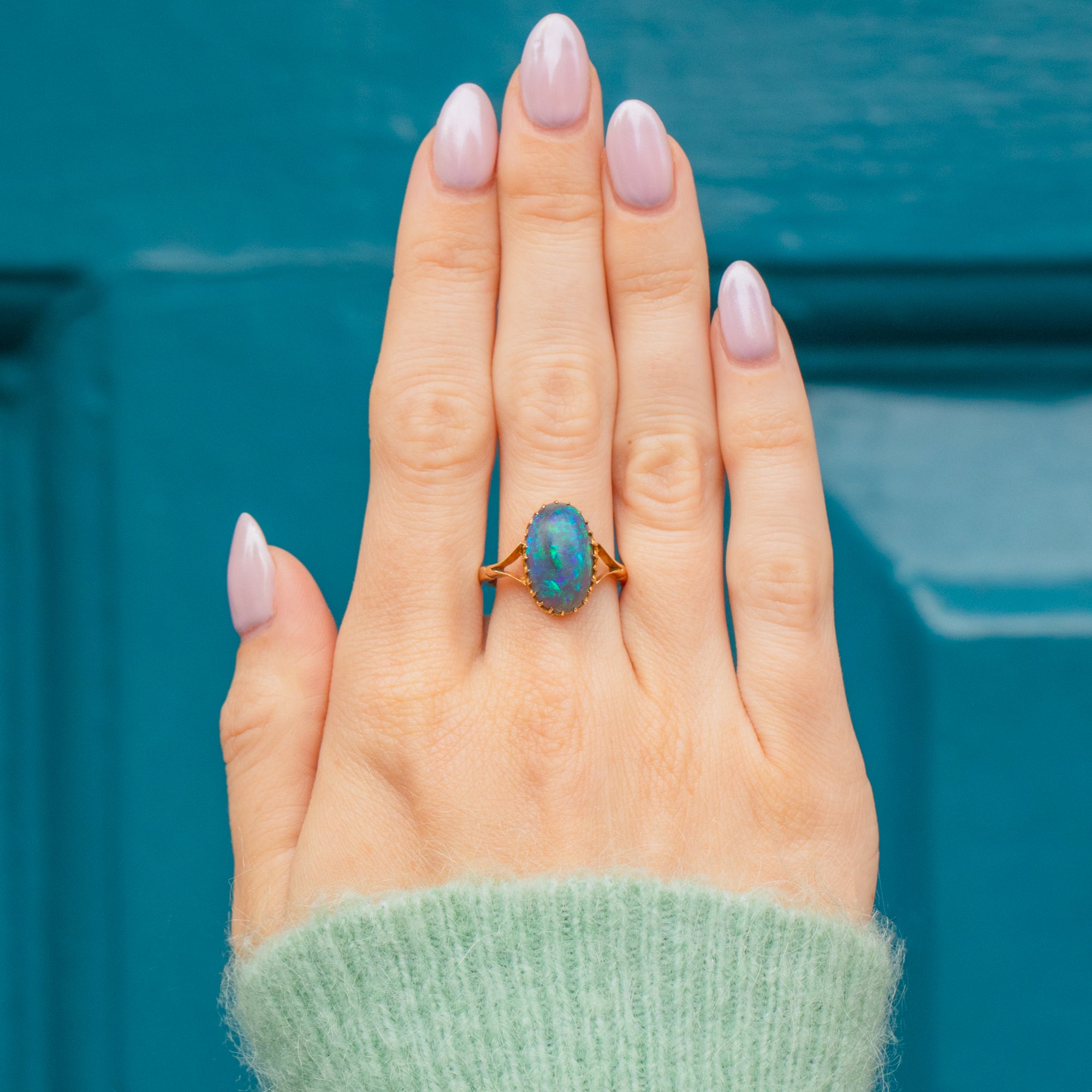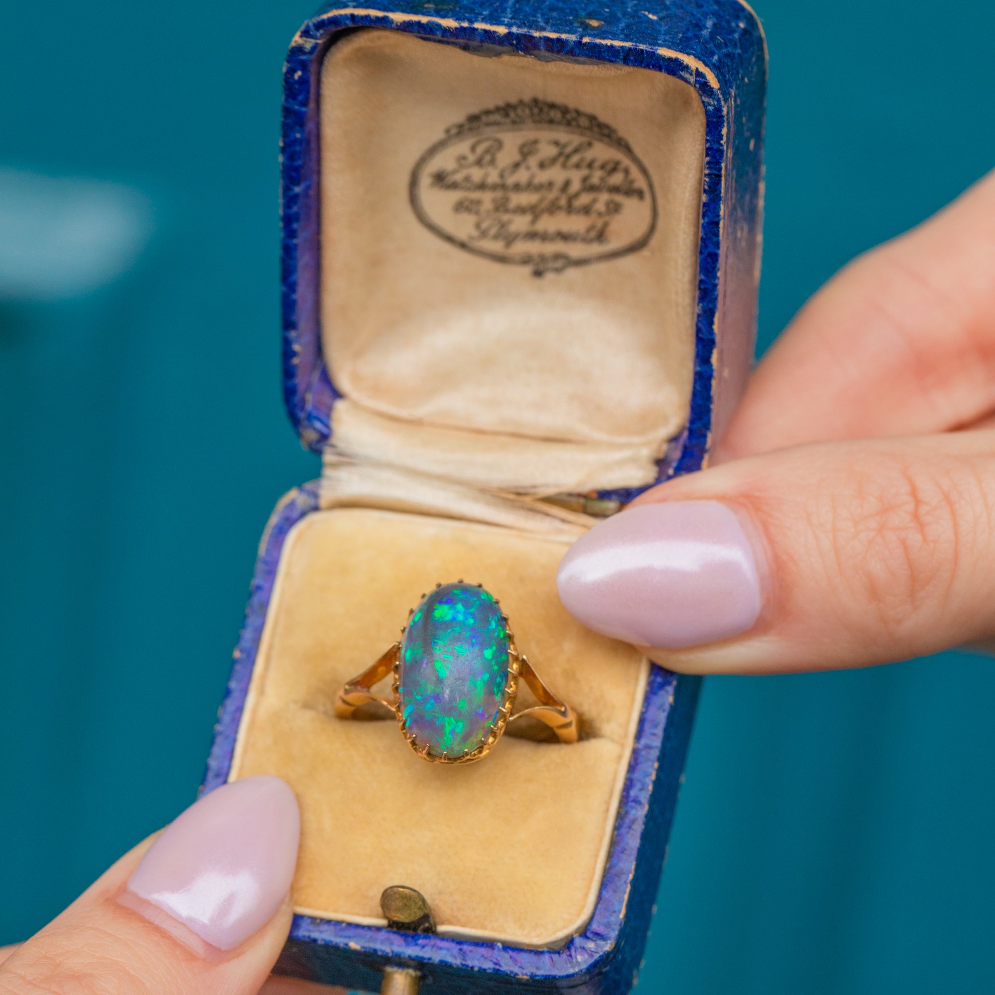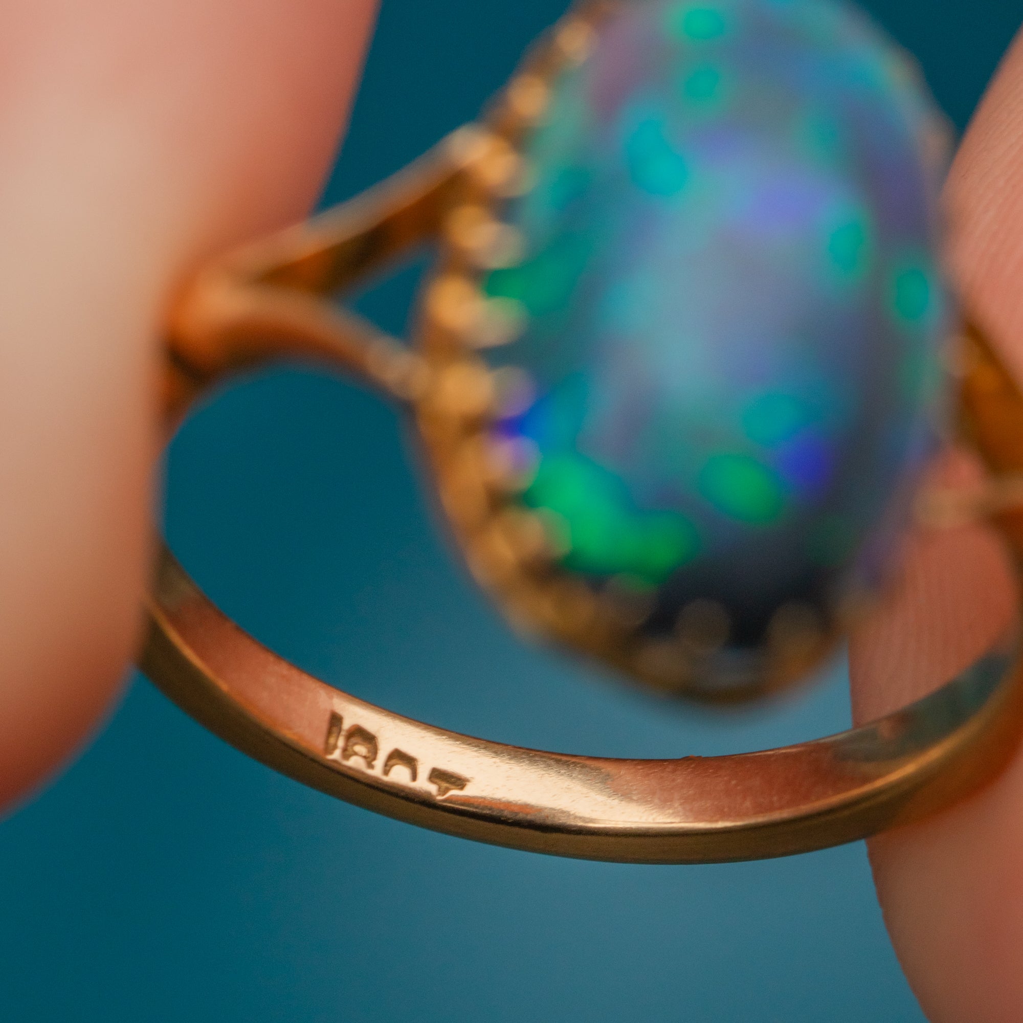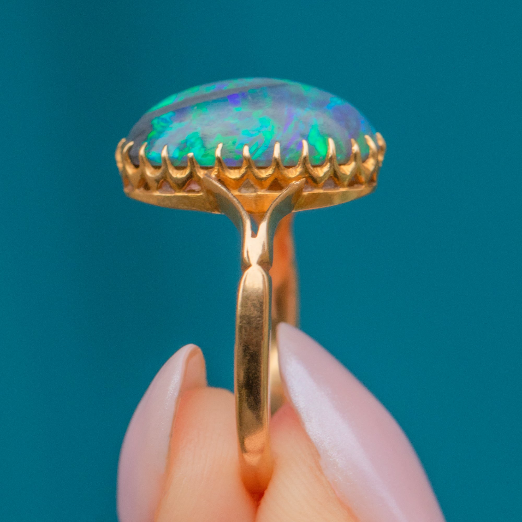 Mined from Lightening Ridge in New South Wales, Australia, this rare Gemstone has travelled far and wide to be with us today. Embraced by dainty claw settings crafted entirely from buttery 18ct Gold, this antique Opal ring will make a striking and feminine addition to your collection!