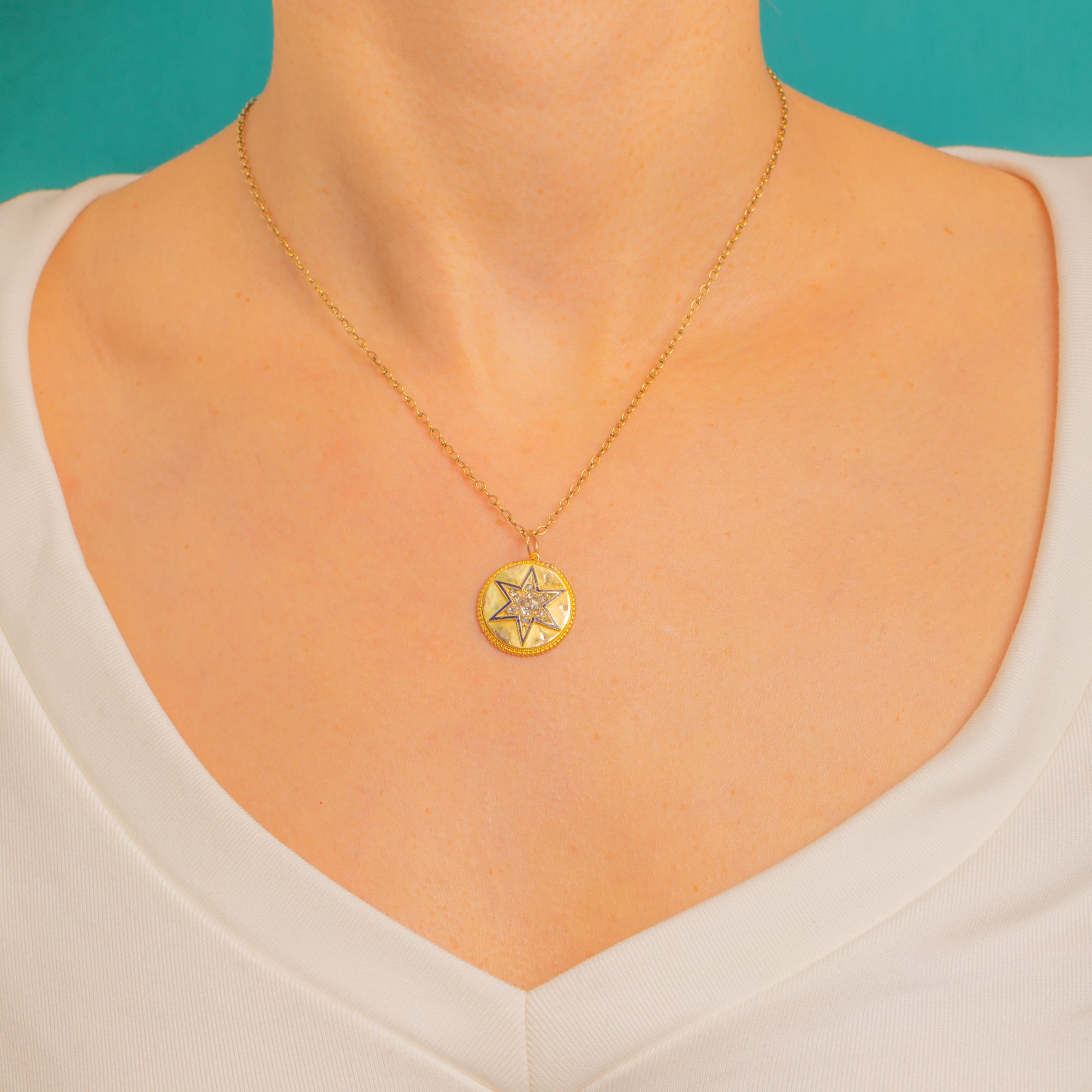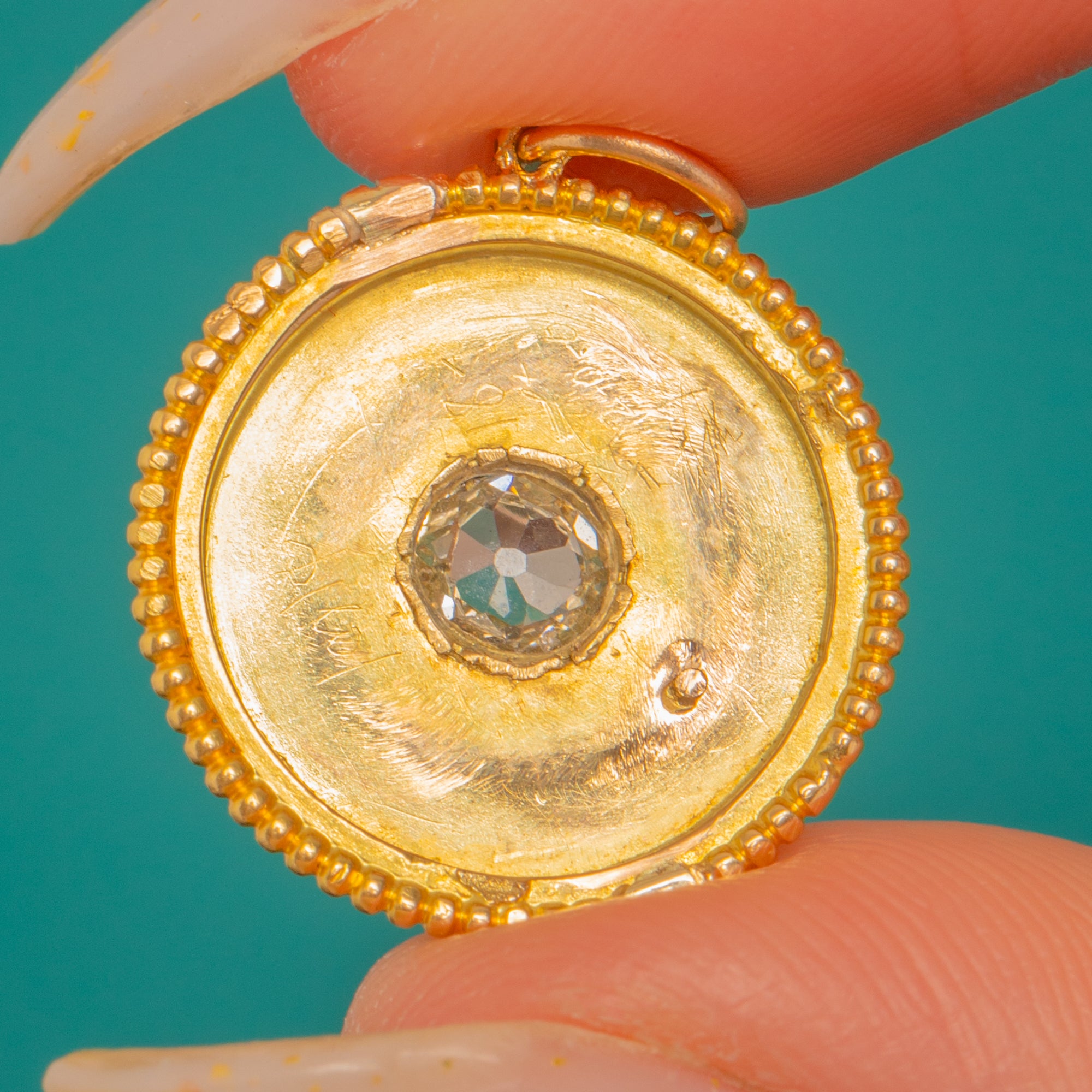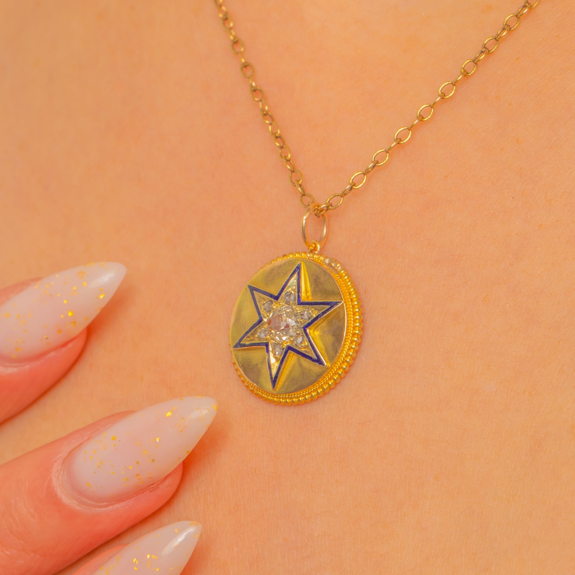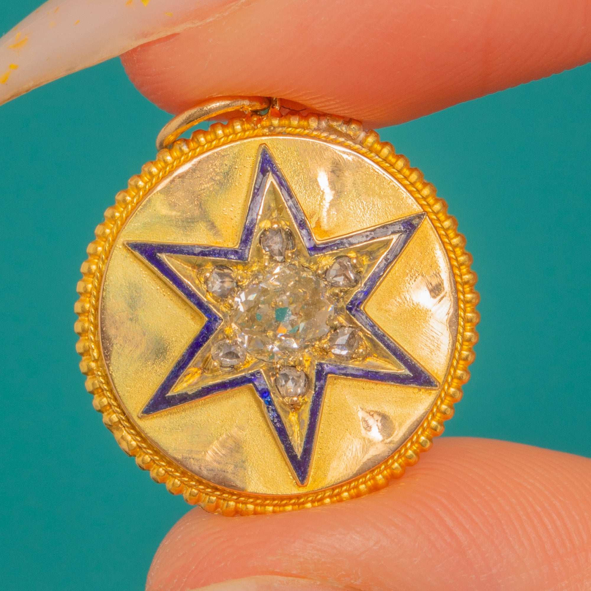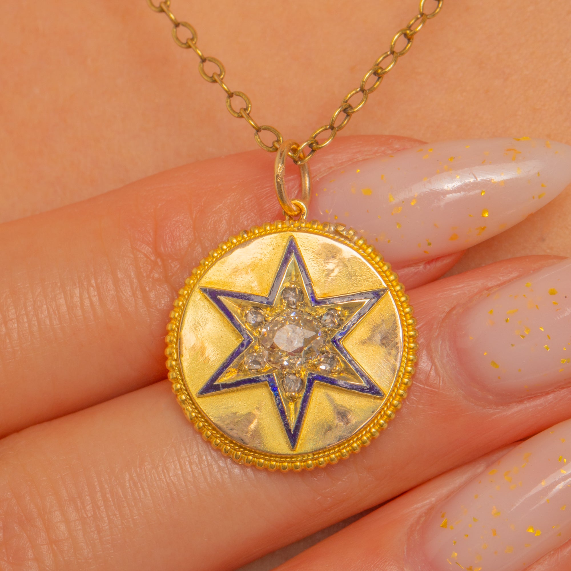 A luminous Victorian 18ct Gold disc pendant, its celestial starburst traced in rich Blue Enamel and framed by a refined beaded rim. At the heart glows an old mine-cut Diamond of approximately 0.17ct, with glinting rose-cut Diamonds forming the radiant “arms” of the star.