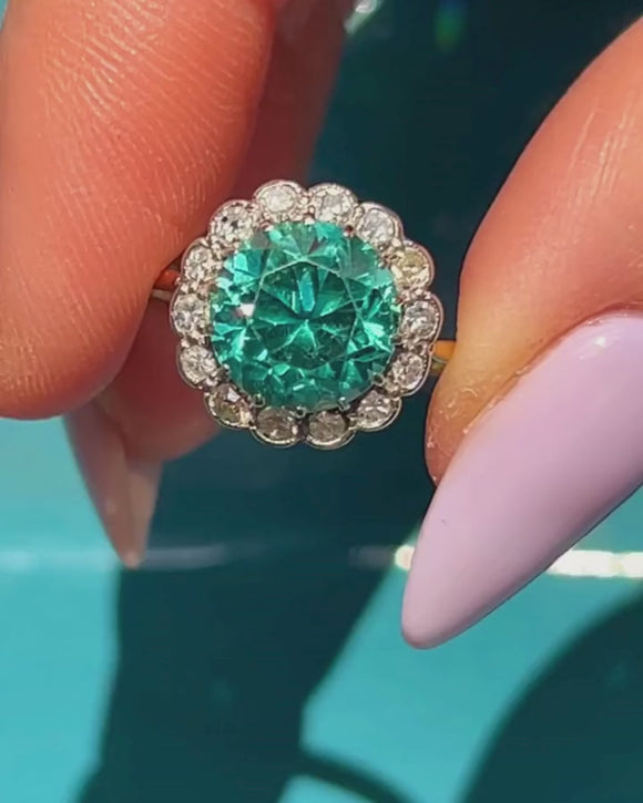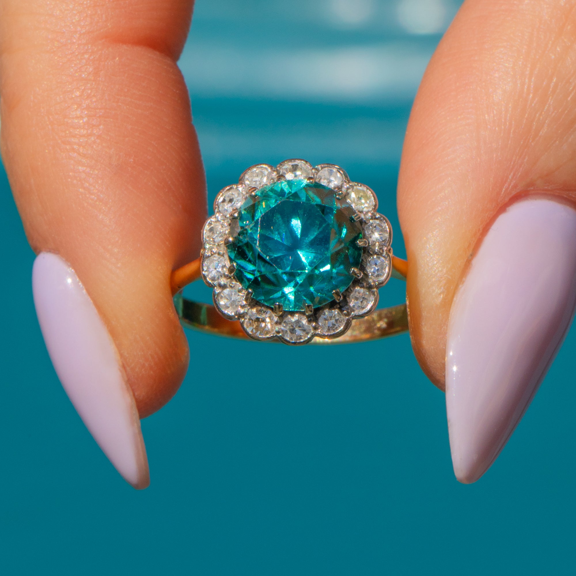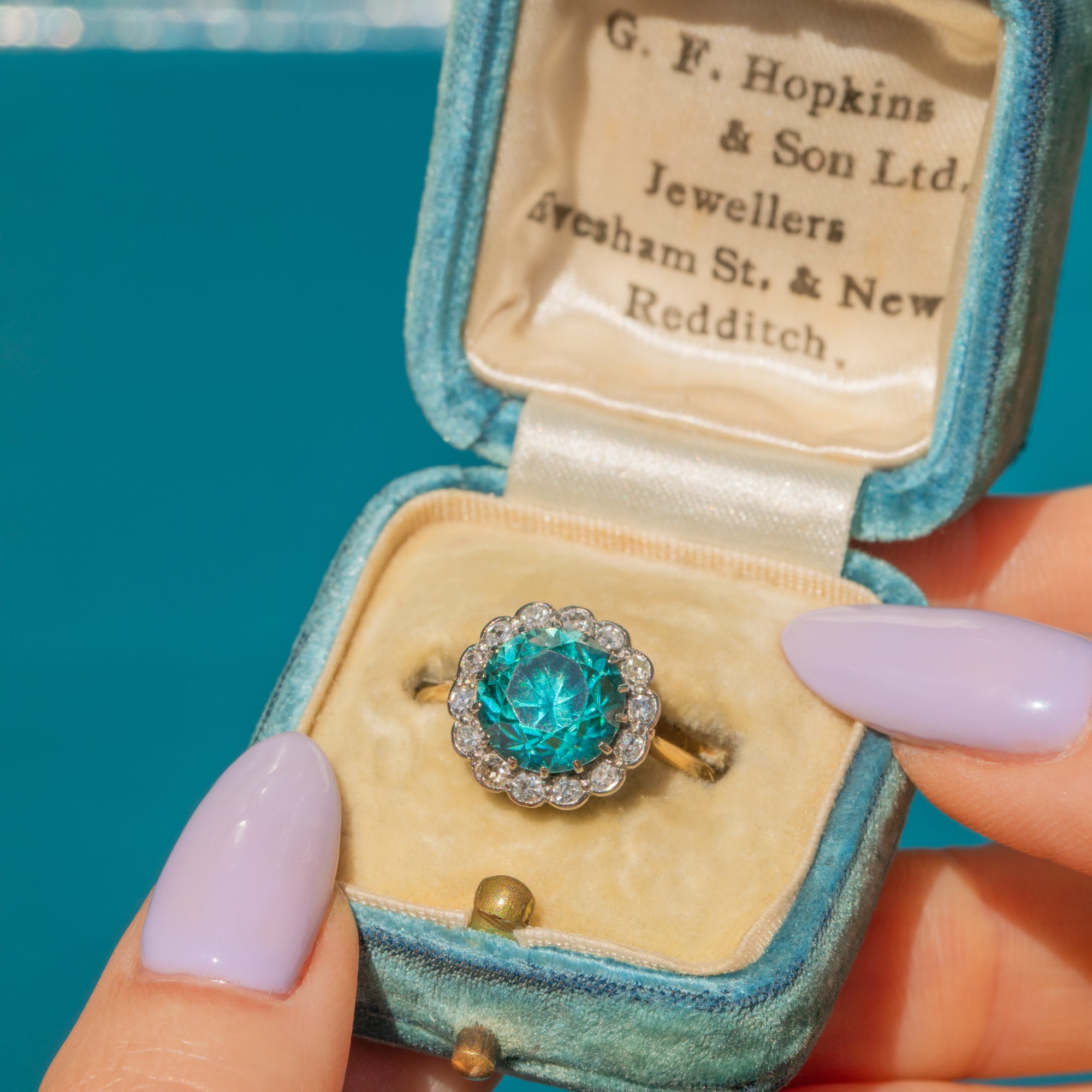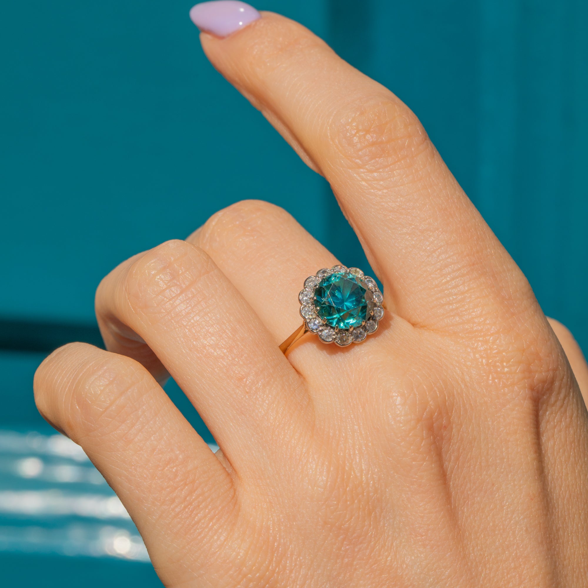 This is a striking antique 18ct Gold blue Zircon Diamond cluster ring! Home to a vivacious 4.00ct cerulean blue Zircon gemstone, this Edwardian ring is a timeless beauty that will impress wherever you take her.