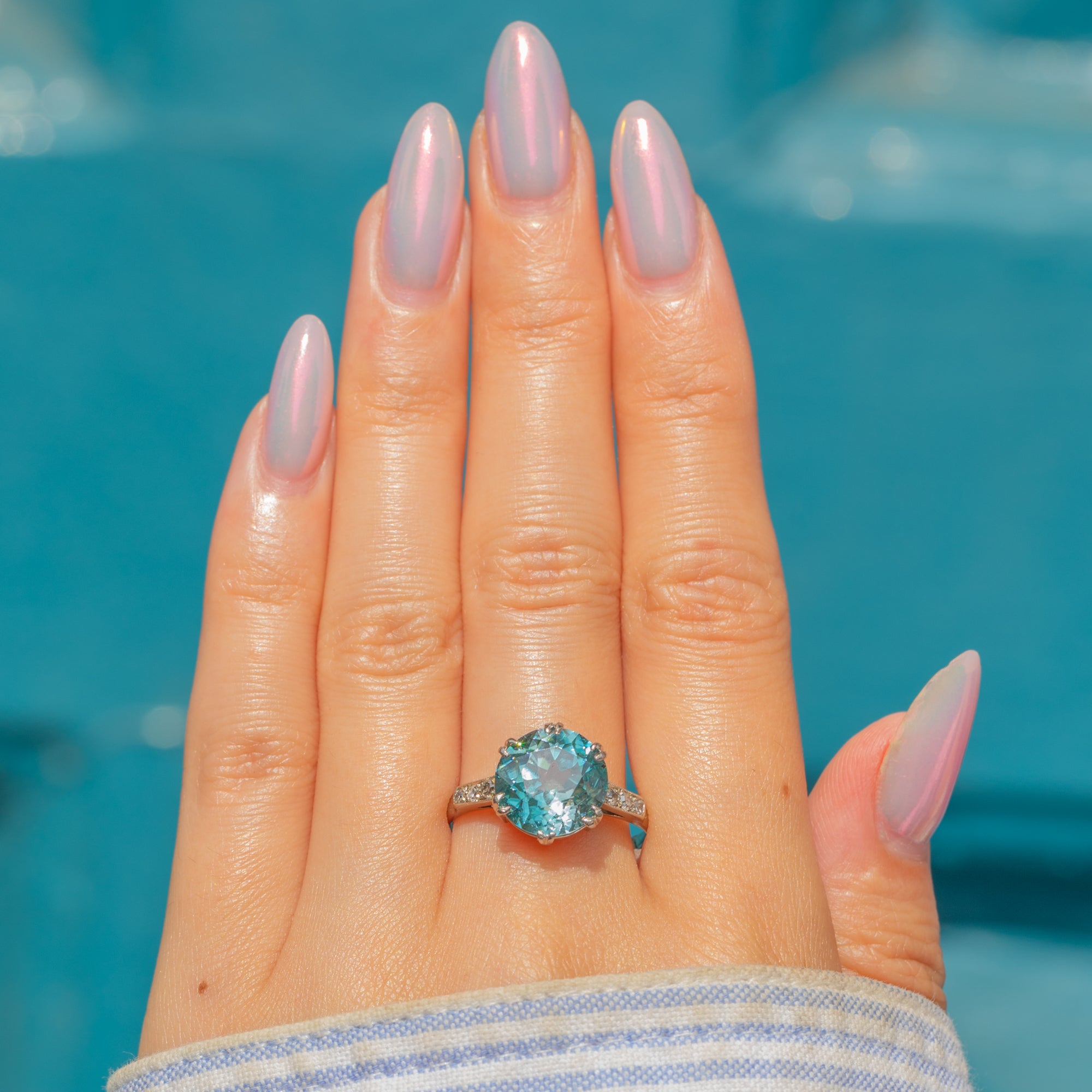 This Art Deco solitaire ring is super sparkly and full of fire! Crafted from 18ct White Gold with a 5.00ct icy blue Zircon gem, this ring will make a glittery addition to any antique or vintage jewellery collection.