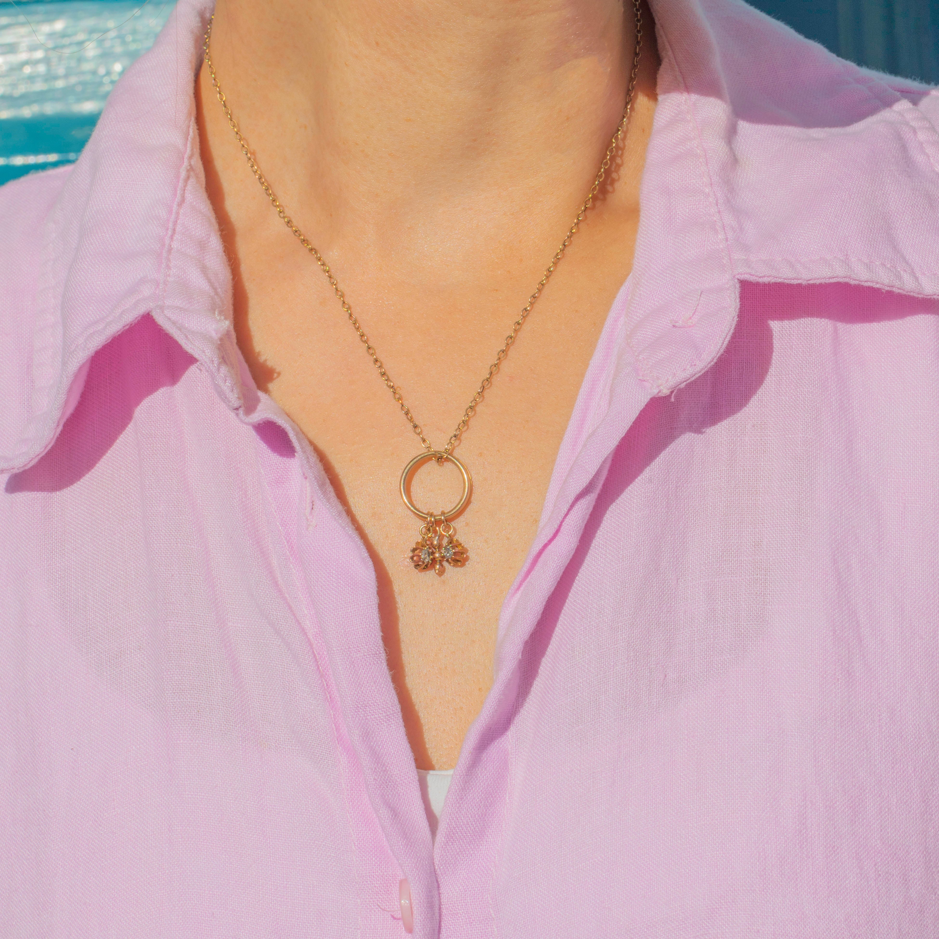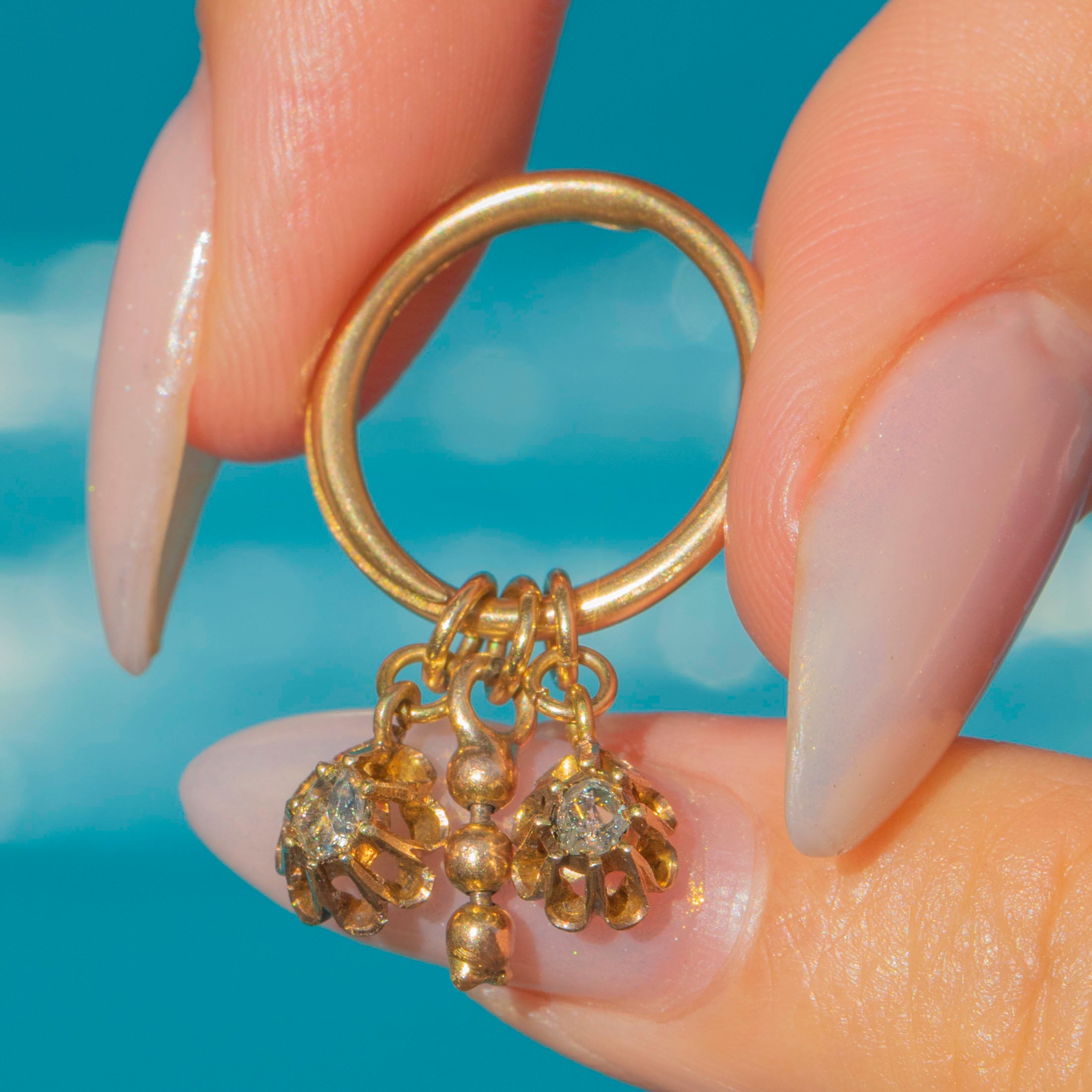 This charming antique trio pendant features an 18ct Gold split ring suspending two delicate rose cut Diamond charms alongside a beaded Gold charm. The split ring allows for the charms to move freely, creating a playful and tactile design with a lovely antique character. With two glittering rose cut Diamonds set in traditional crown collets, this piece is both elegant and versatile, perfect to wear on a chain as a pendant or to add to a charm bracelet.