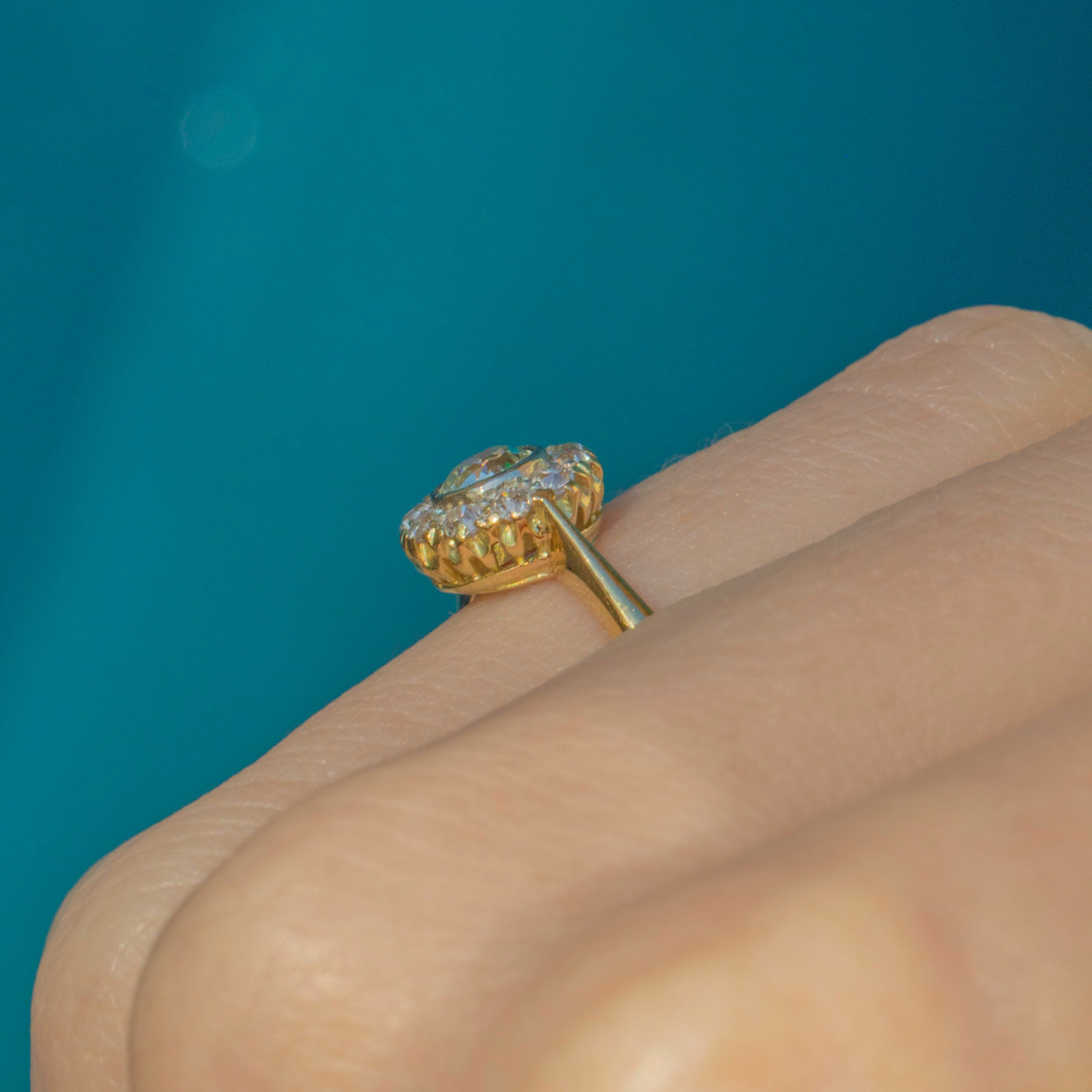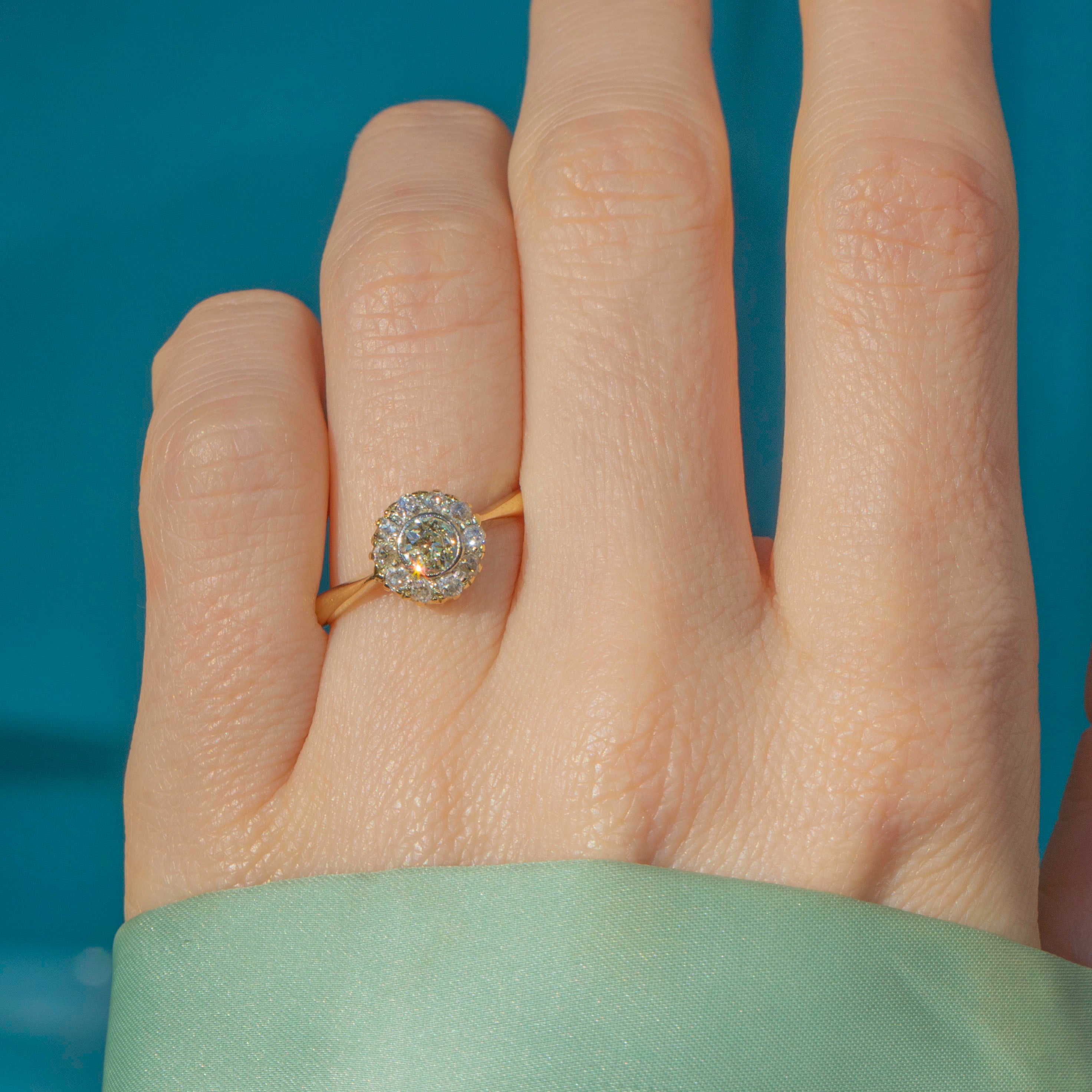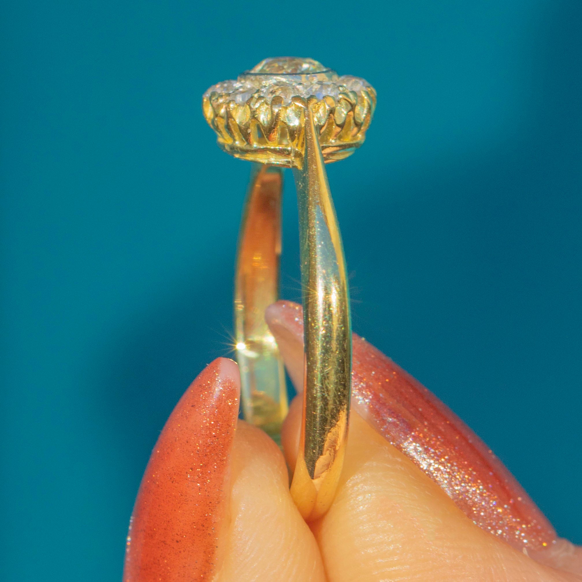 VERY GOOD-EXCELLENT. This antique 18ct Gold Diamond cluster ring is in wonderful condition. Each Diamond is securely set, and the 18ct Gold is brightly saturated. There is a nibble to the central Old-European cut Diamond and some wear to one of the Old-Mine cut Diamond settings, commensurate with age, and is only noticeable under close inspection. A beautiful antique ring, she is a must-have!
