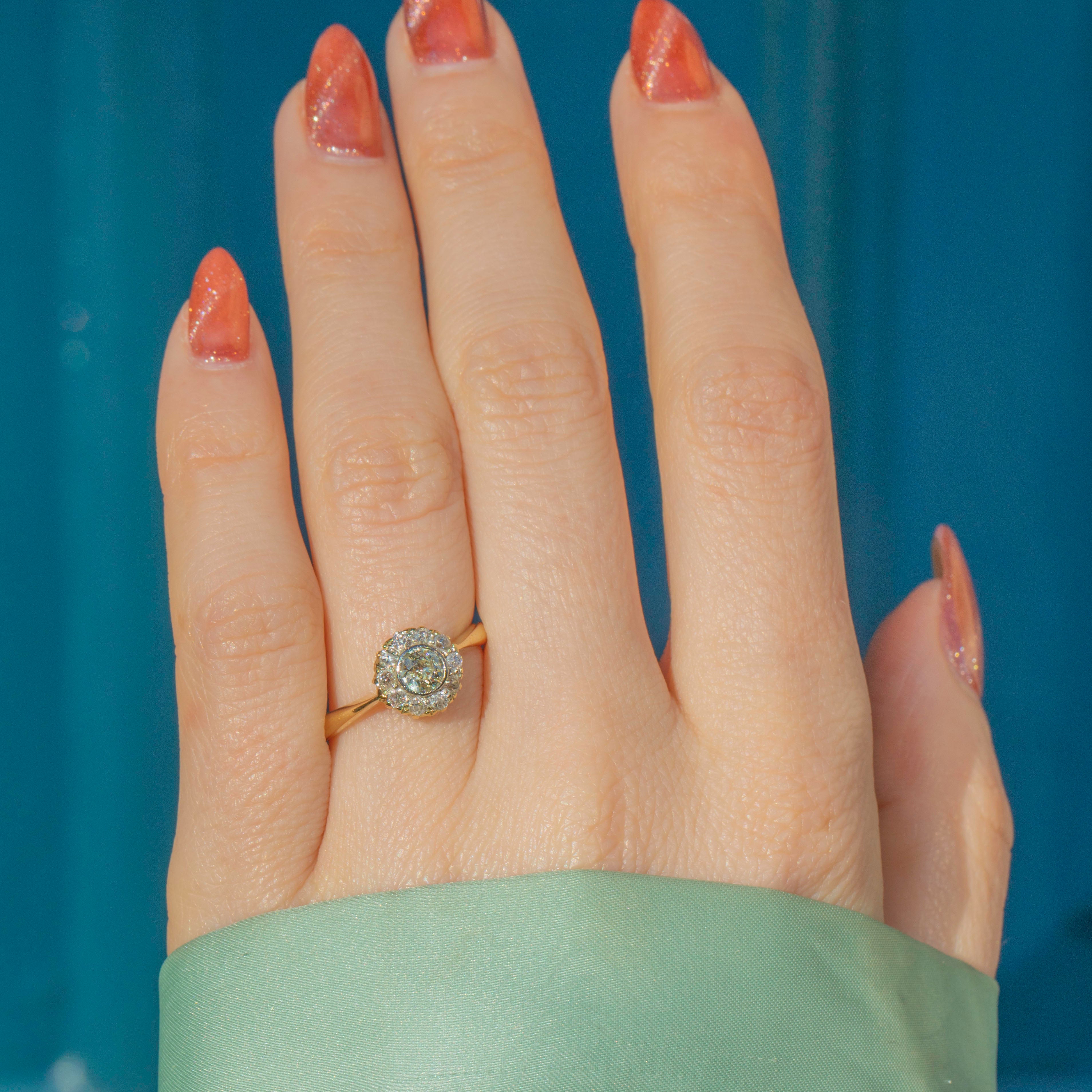 The central 0.25ct old-European-cut Diamond is mesmerising, with crisp facets that dance in the light. It is further enhanced by a halo of scintillating old-mine-cut Diamonds, each with a distinctive twinkle.