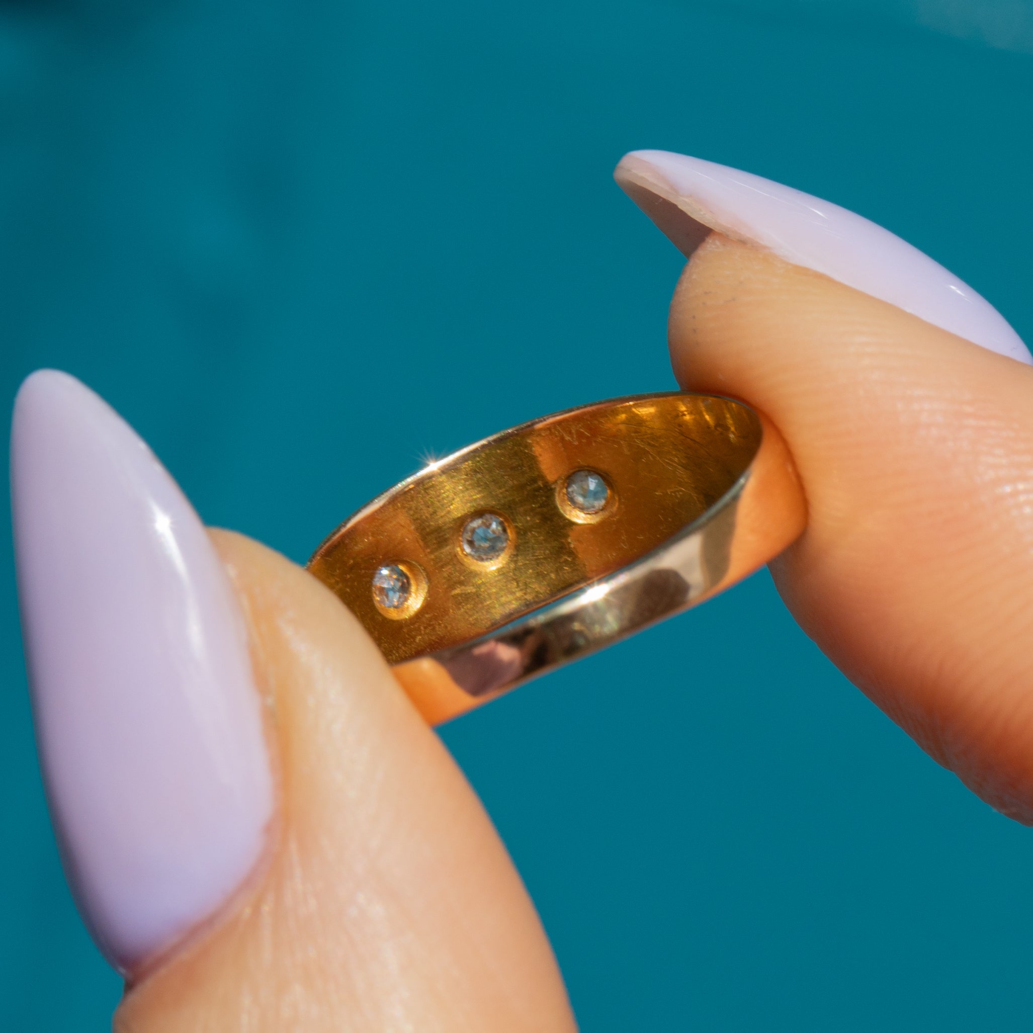 This post-Edwardian 18ct Gold gypsy ring features three old-mine cut Diamonds in star settings, giving it a celestial ambiance that will add a touch of elegance to any ring stack!