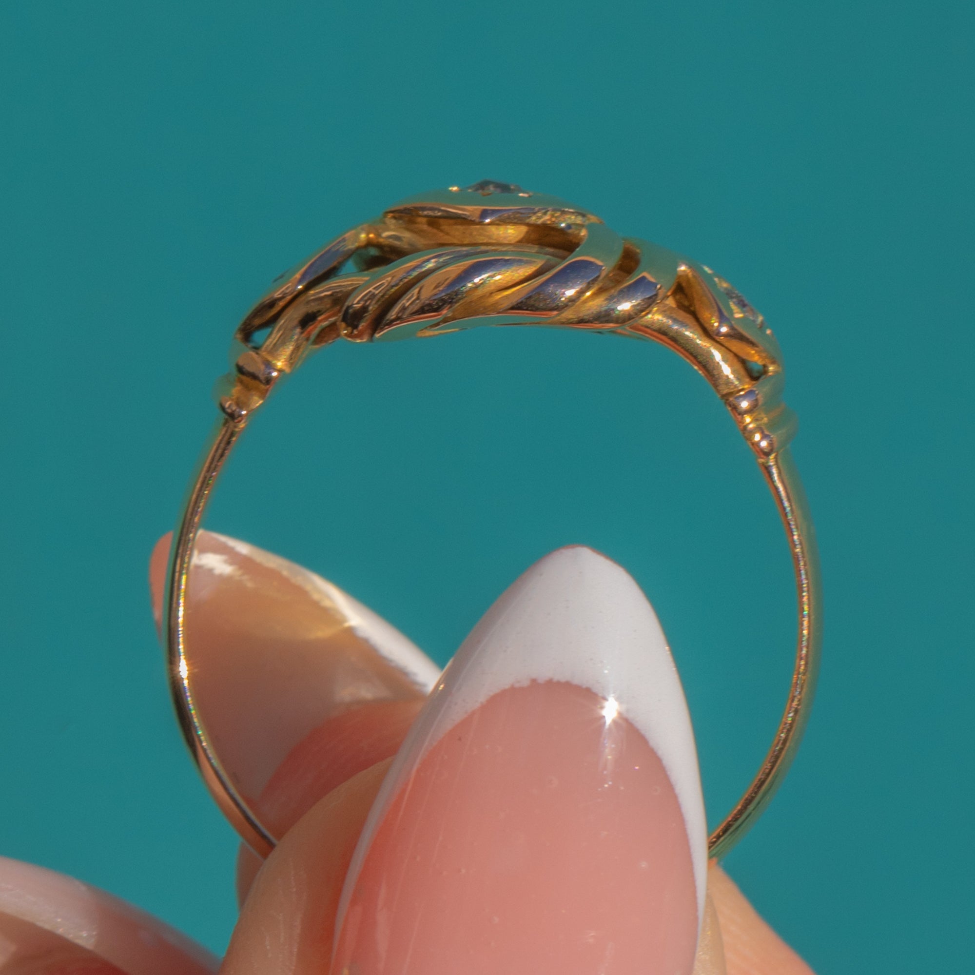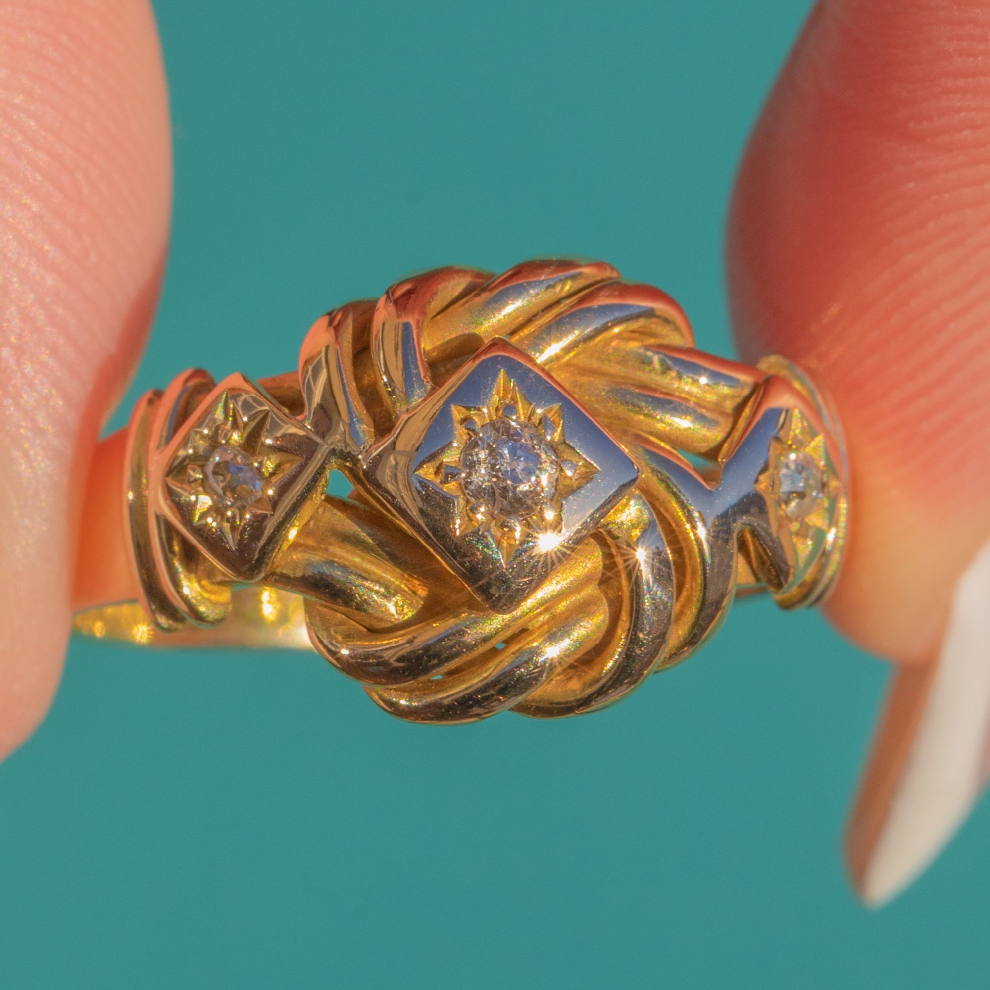 This Antique 18ct Gold Diamond Knot Ring is a wonderfully romantic Chester piece, crafted in 1911. The knot motif is richly modelled in flowing, interlaced Gold, symbolising eternal love and commitment, while sparkling old mine cut Diamonds are star-set into angular panels for a crisp, celestial touch.