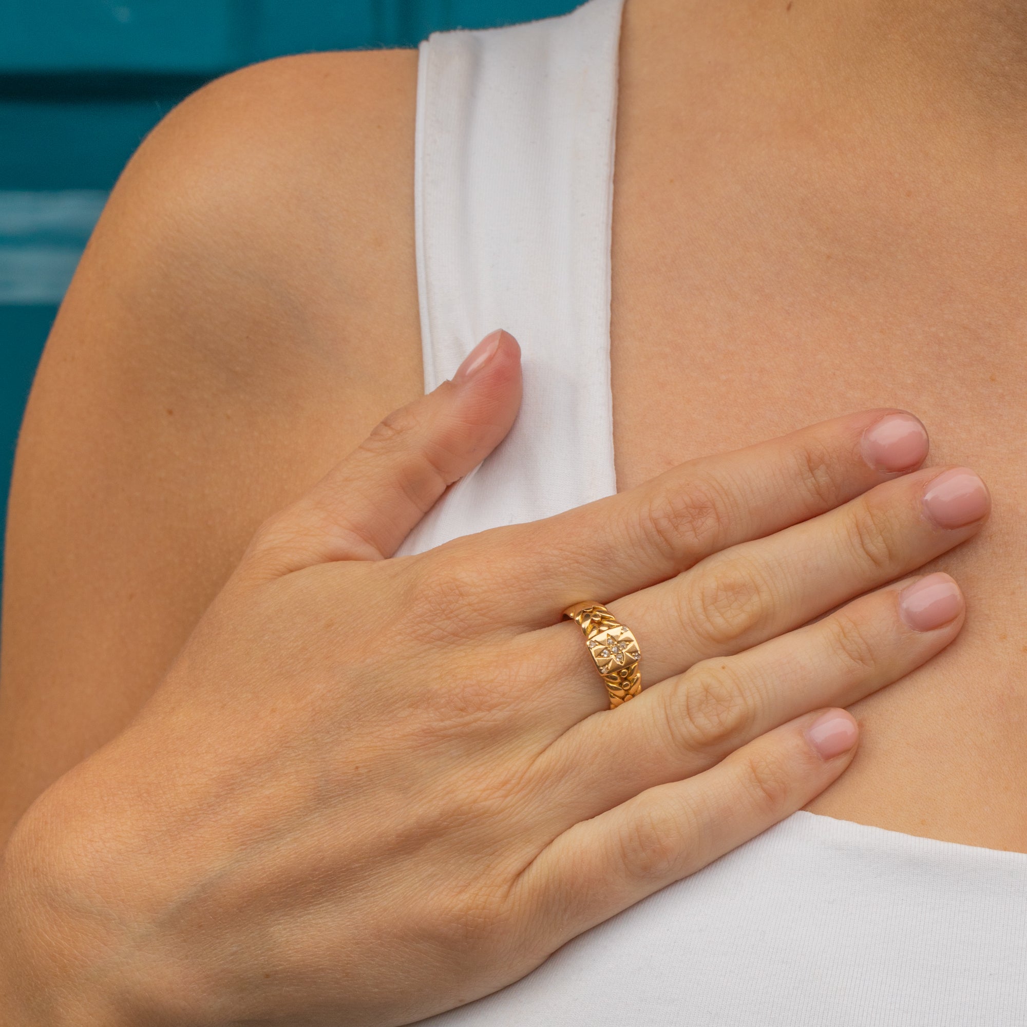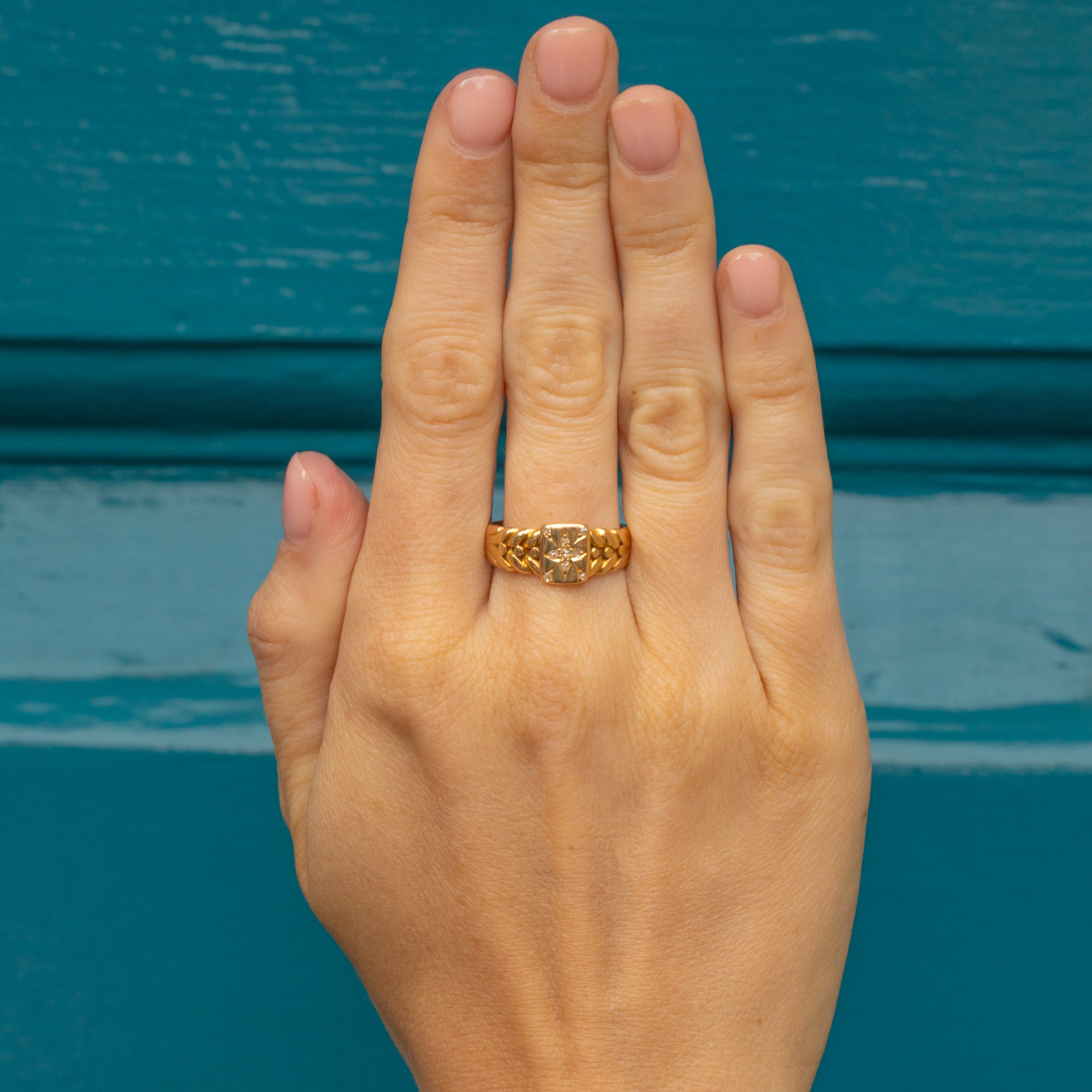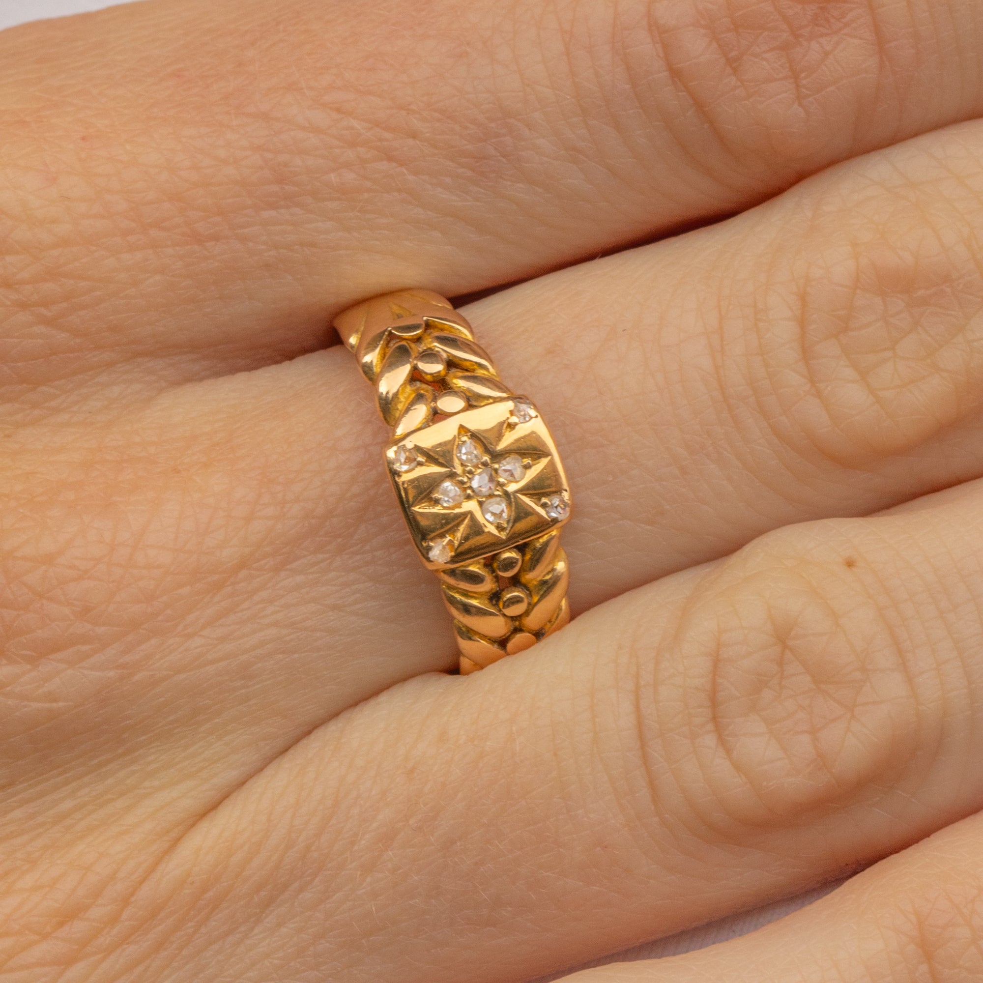 Add a touch of Victorian charm to your ring stack with this exquisite antique 18ct Gold Diamond star keeper ring! Crafted from sumptuous 18ct Gold and displaying a twinkling Diamond at her centre, this Victorian ring features woven details on the shoulders that were so typical of keeper rings.