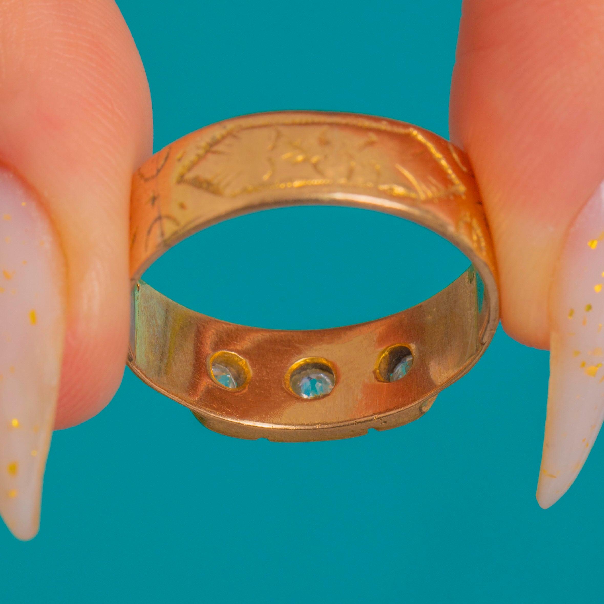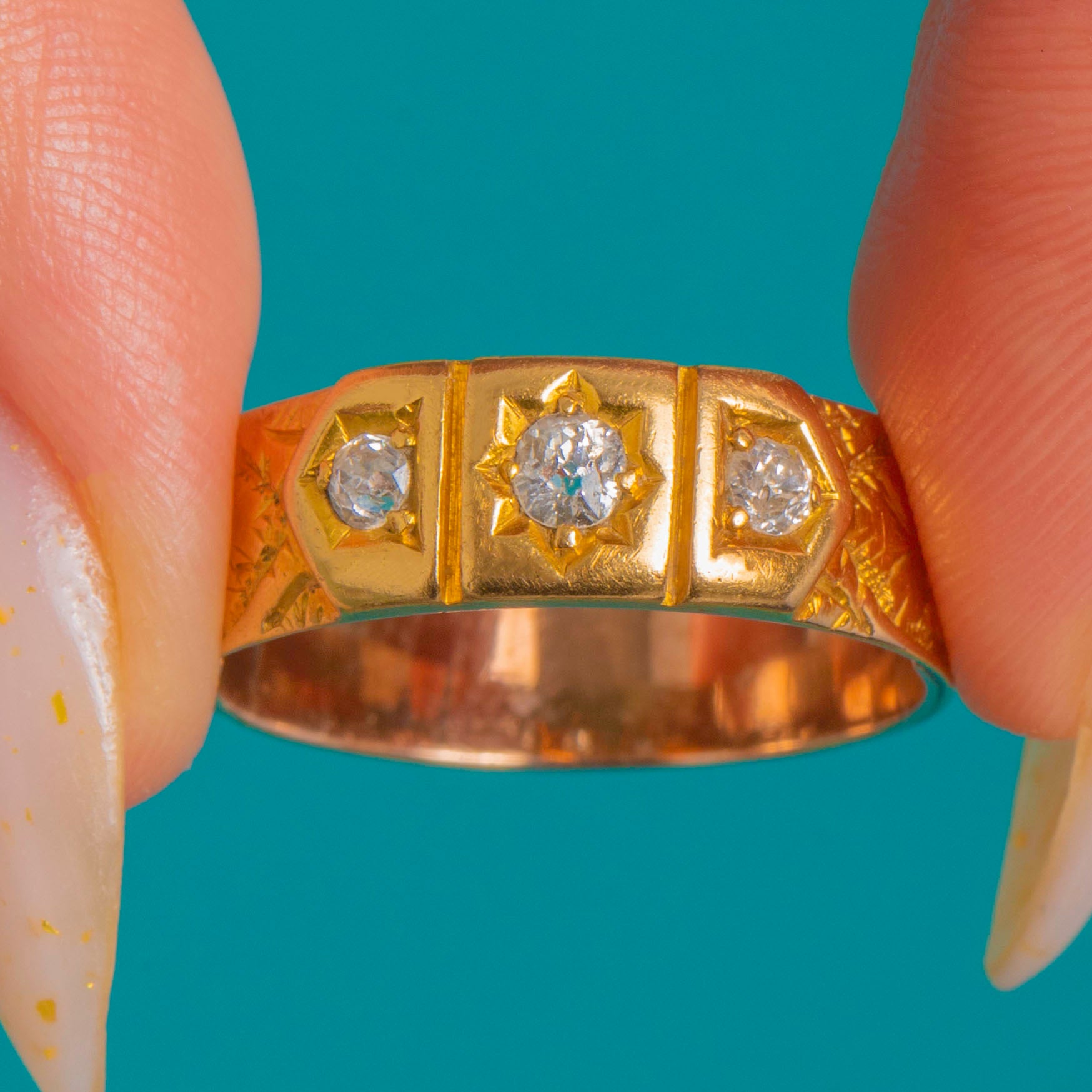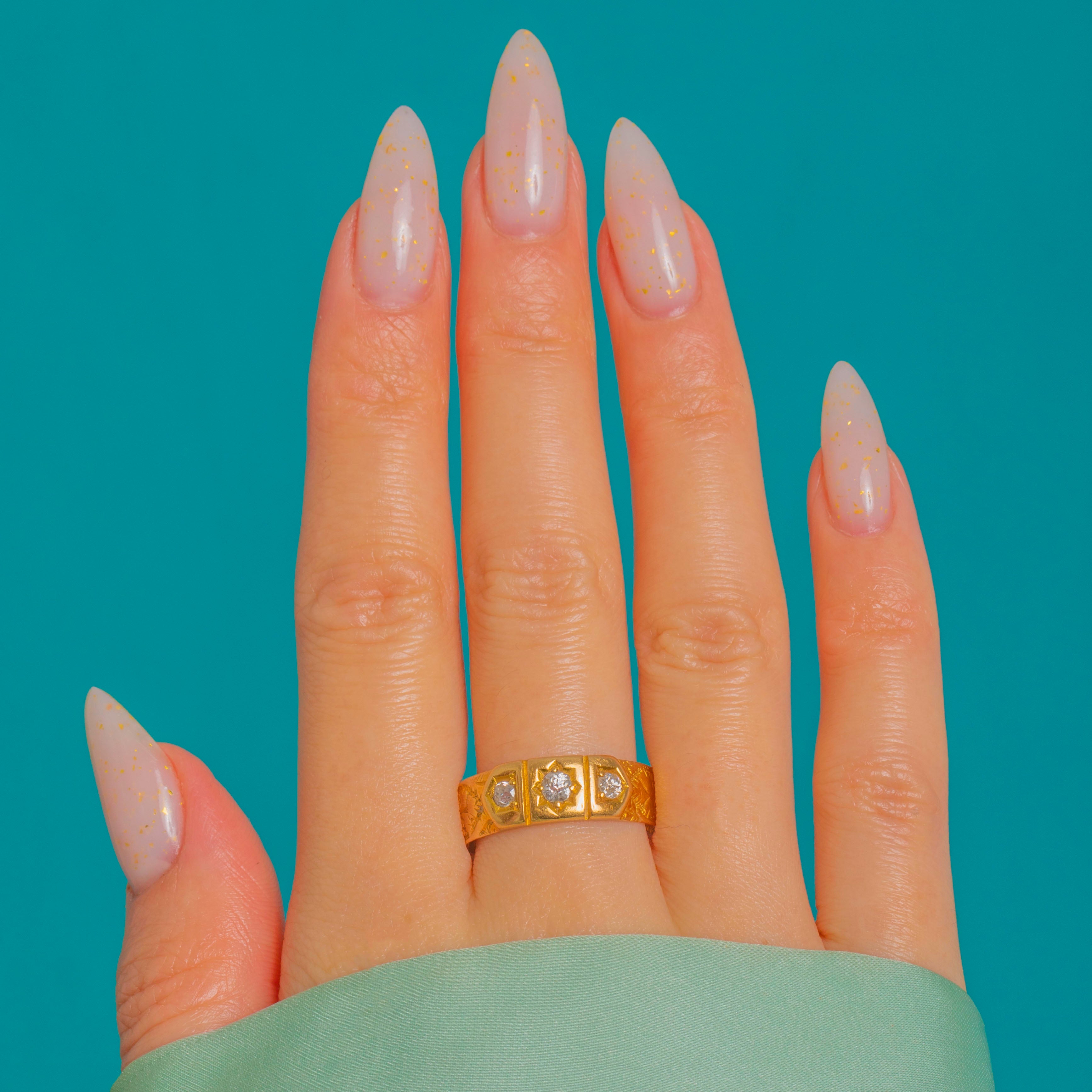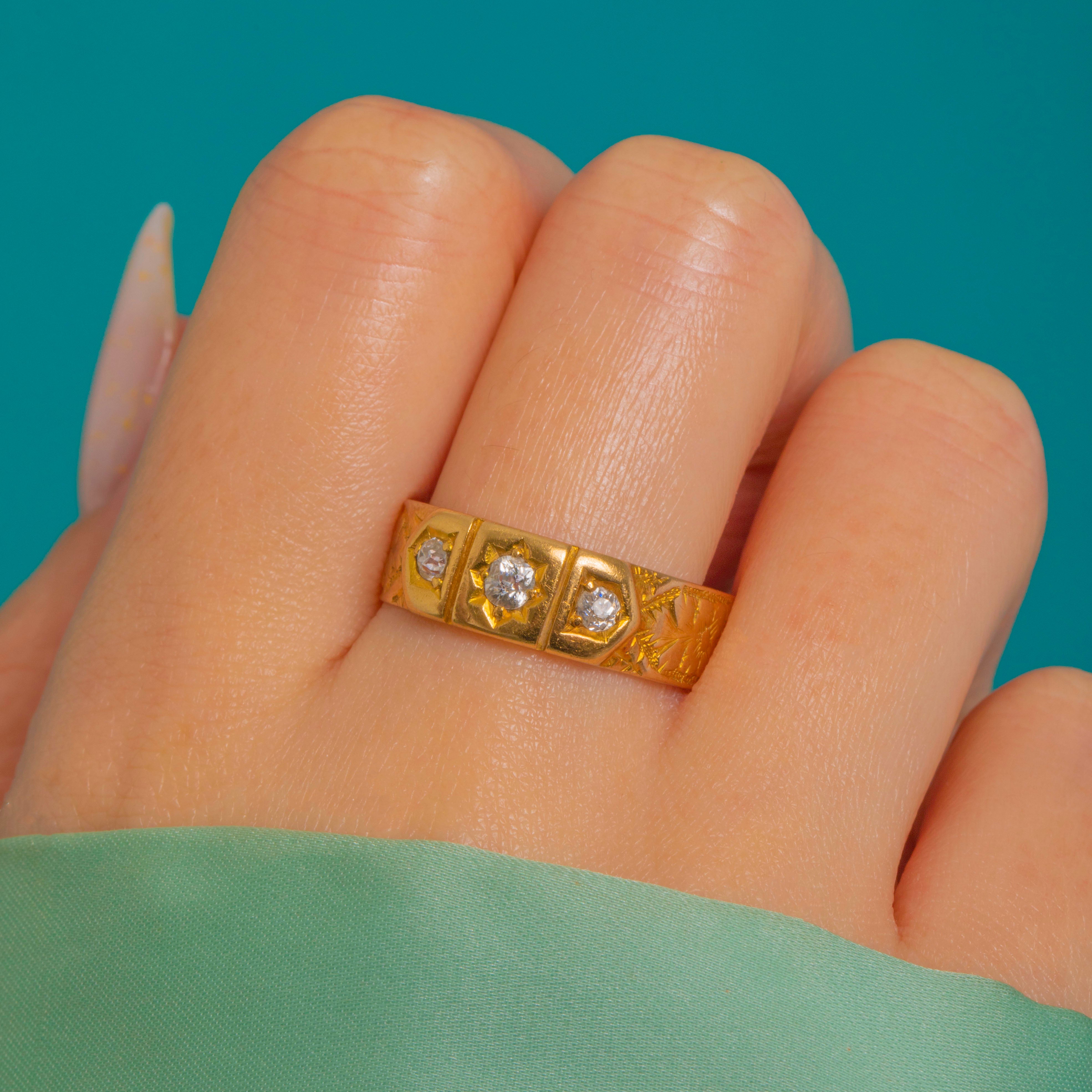 A classic Victorian trilogy gypsy ring in rich 18ct Gold, star-set with a larger central Diamond flanked by two smaller stones. The low, flat head is arranged in three rectangular cartouches divided by slim ribs, giving a refined, architectural feel. Beautiful foliate and scroll engraving flows down the shoulders, with crisp bright-cut details that catch the light.