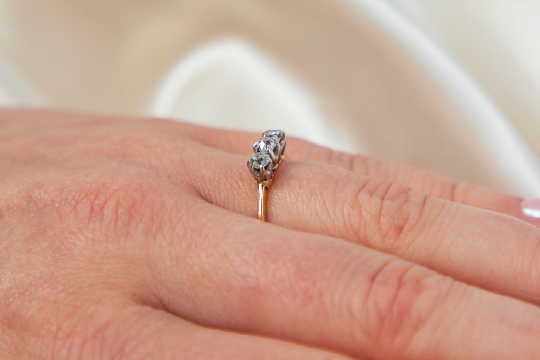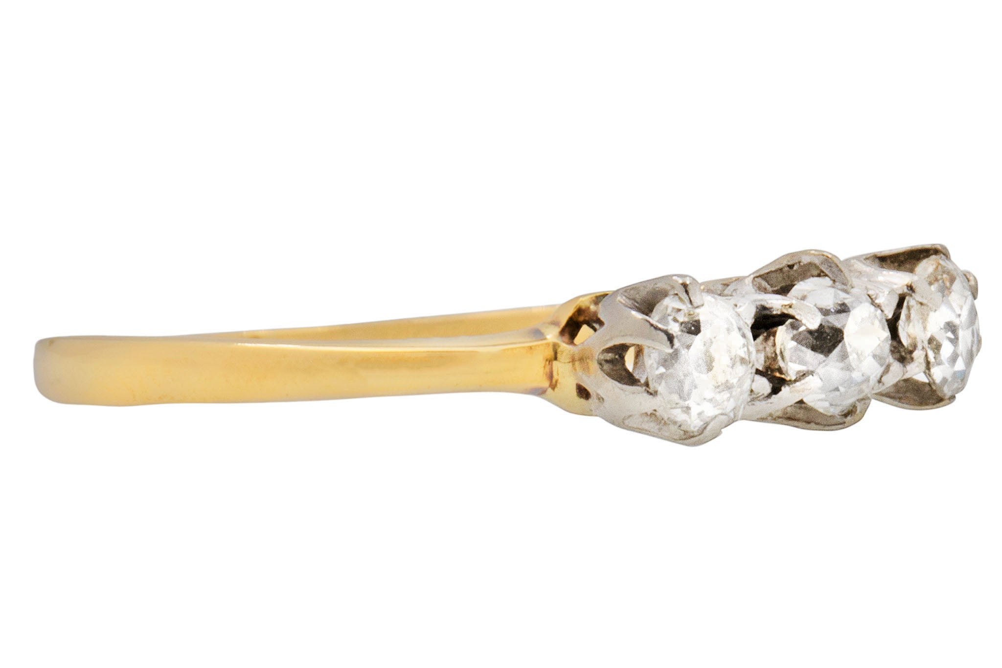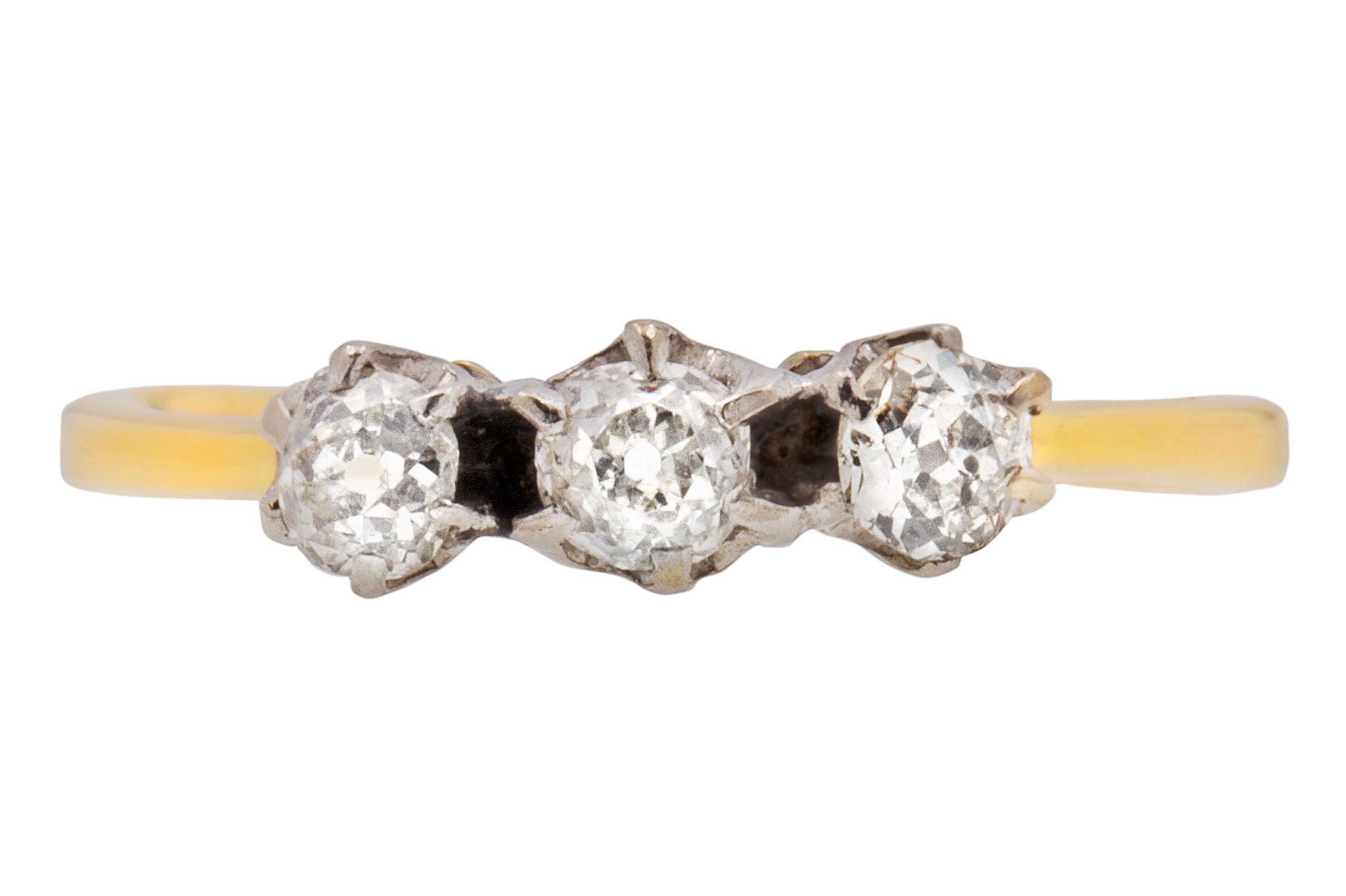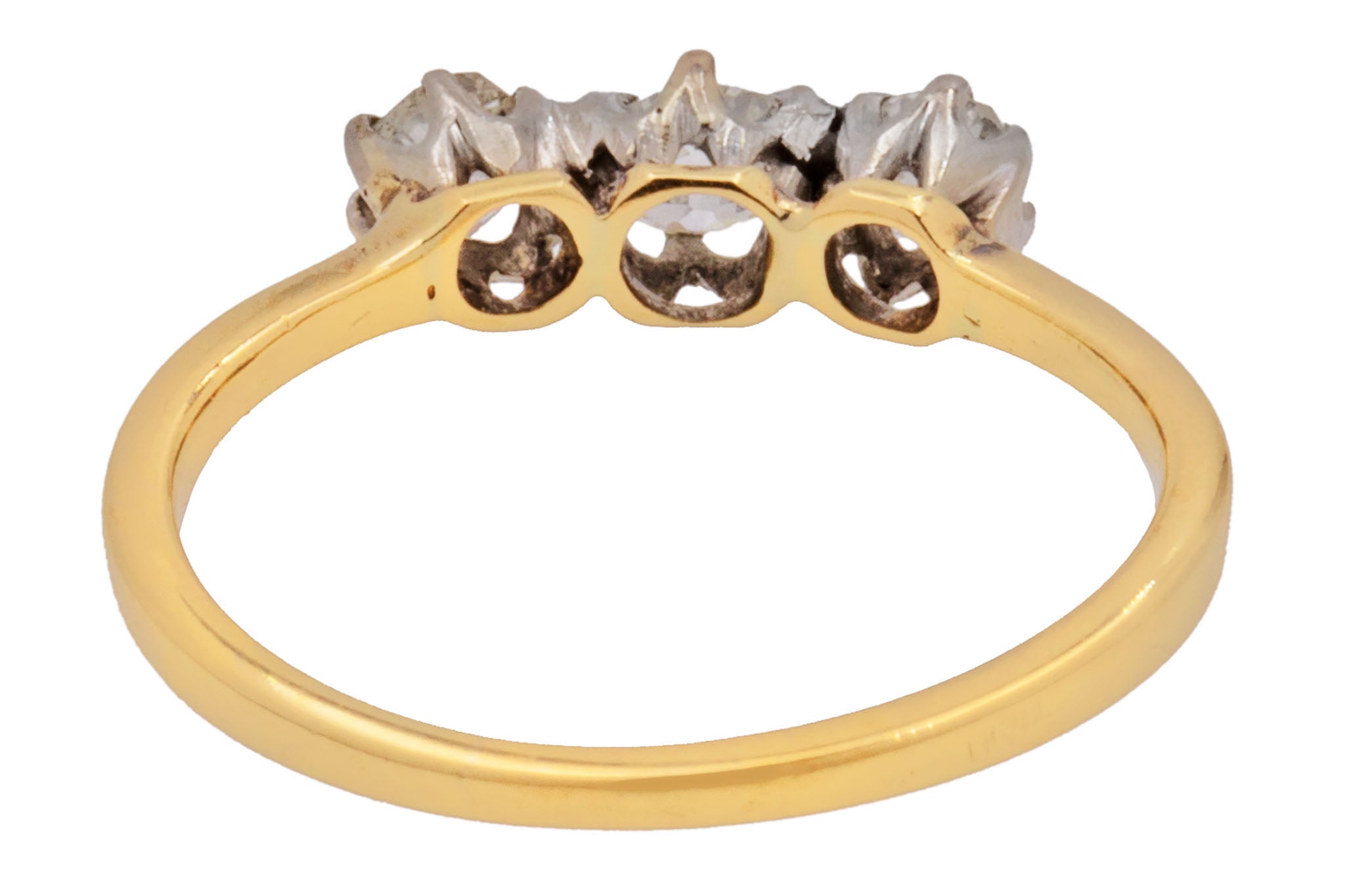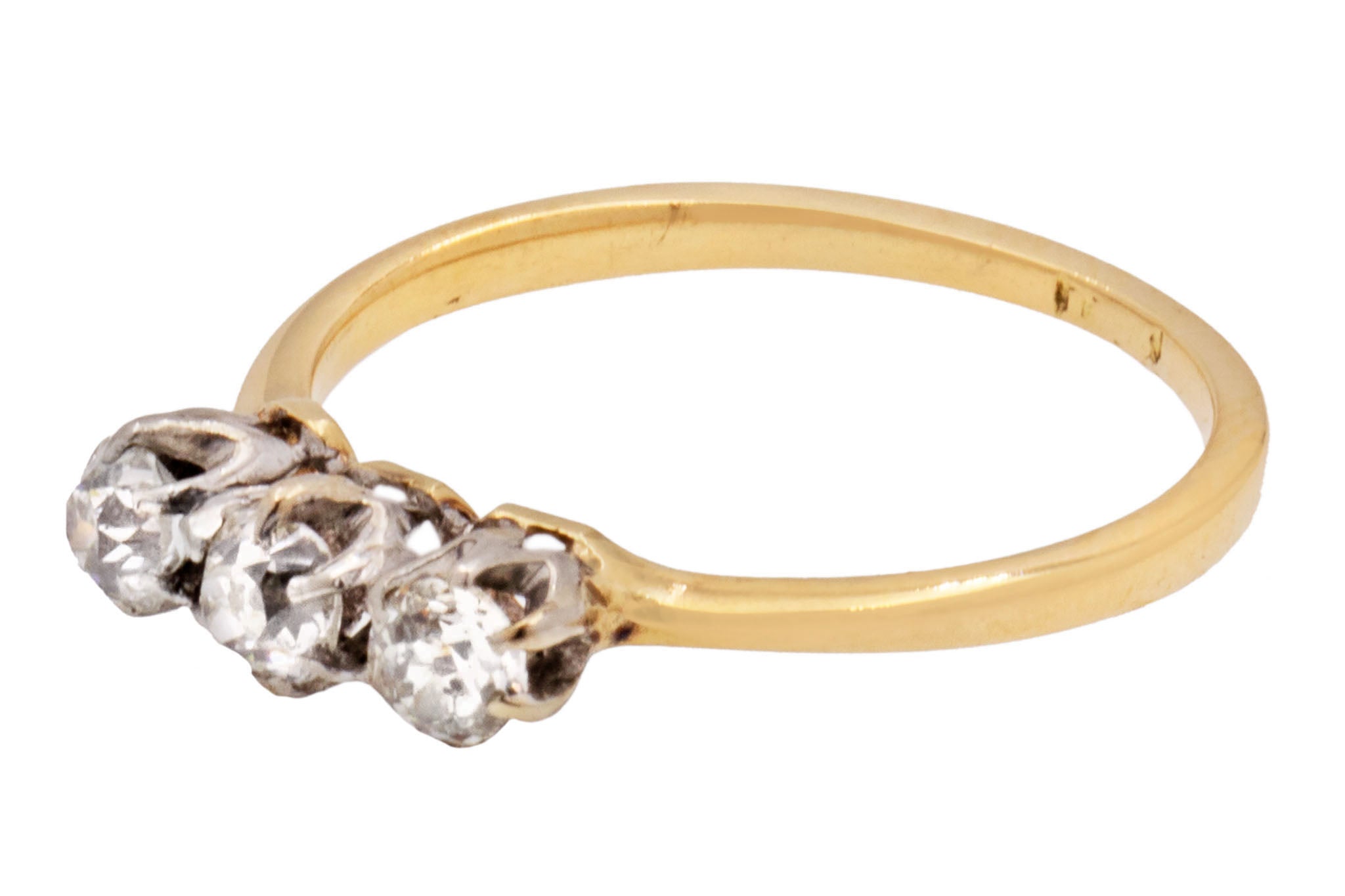 VERY GOOD. This antique 18ct Gold Diamond trilogy ring is in very good condition throughout. All of the Diamonds are secure within their settings, with no discernable signs of wear to their facets or their domes. The hallmarks inside the band have worn due to wear over time, but there is no damage to the band on the outside. What a romantic way to propose to your fiance-to-be!
