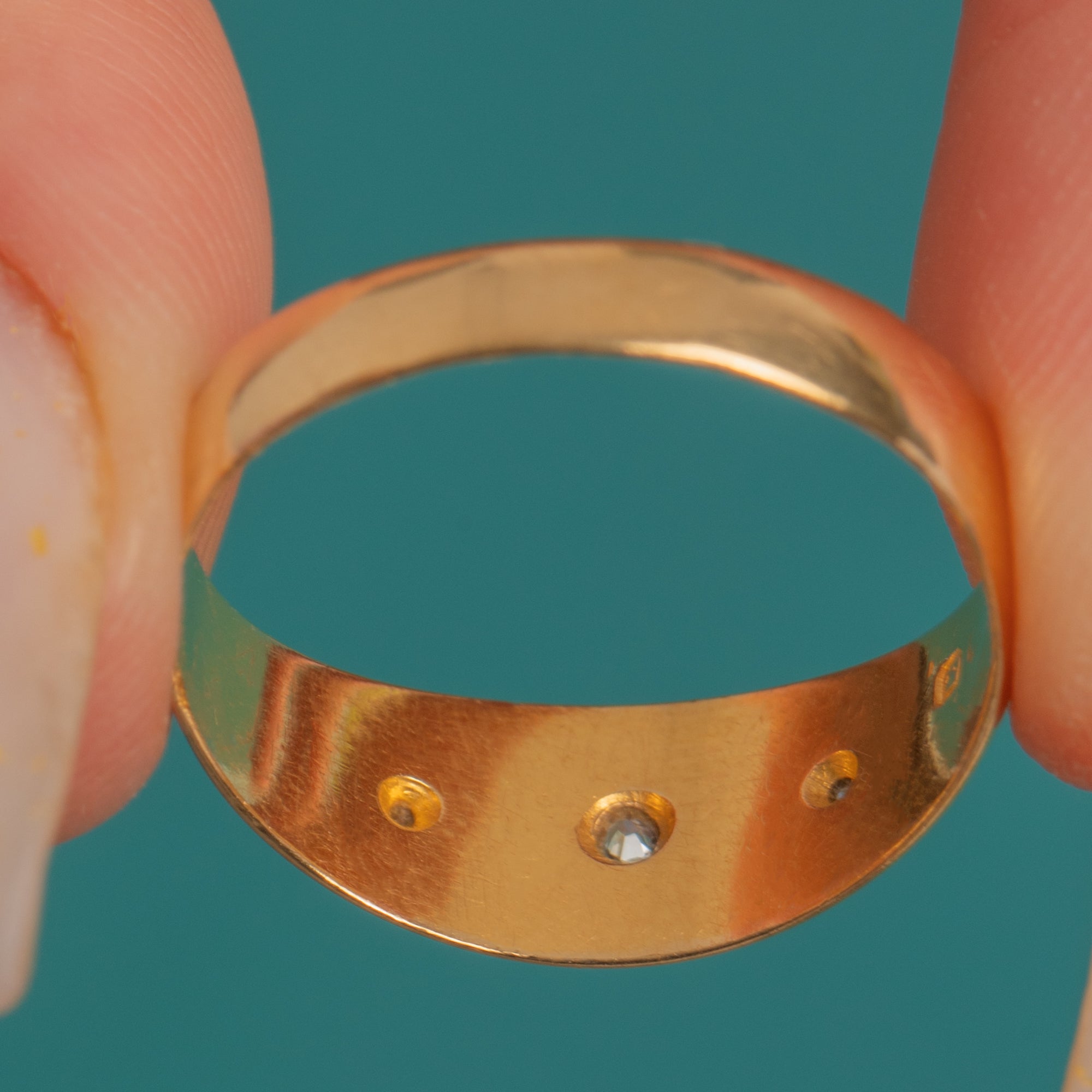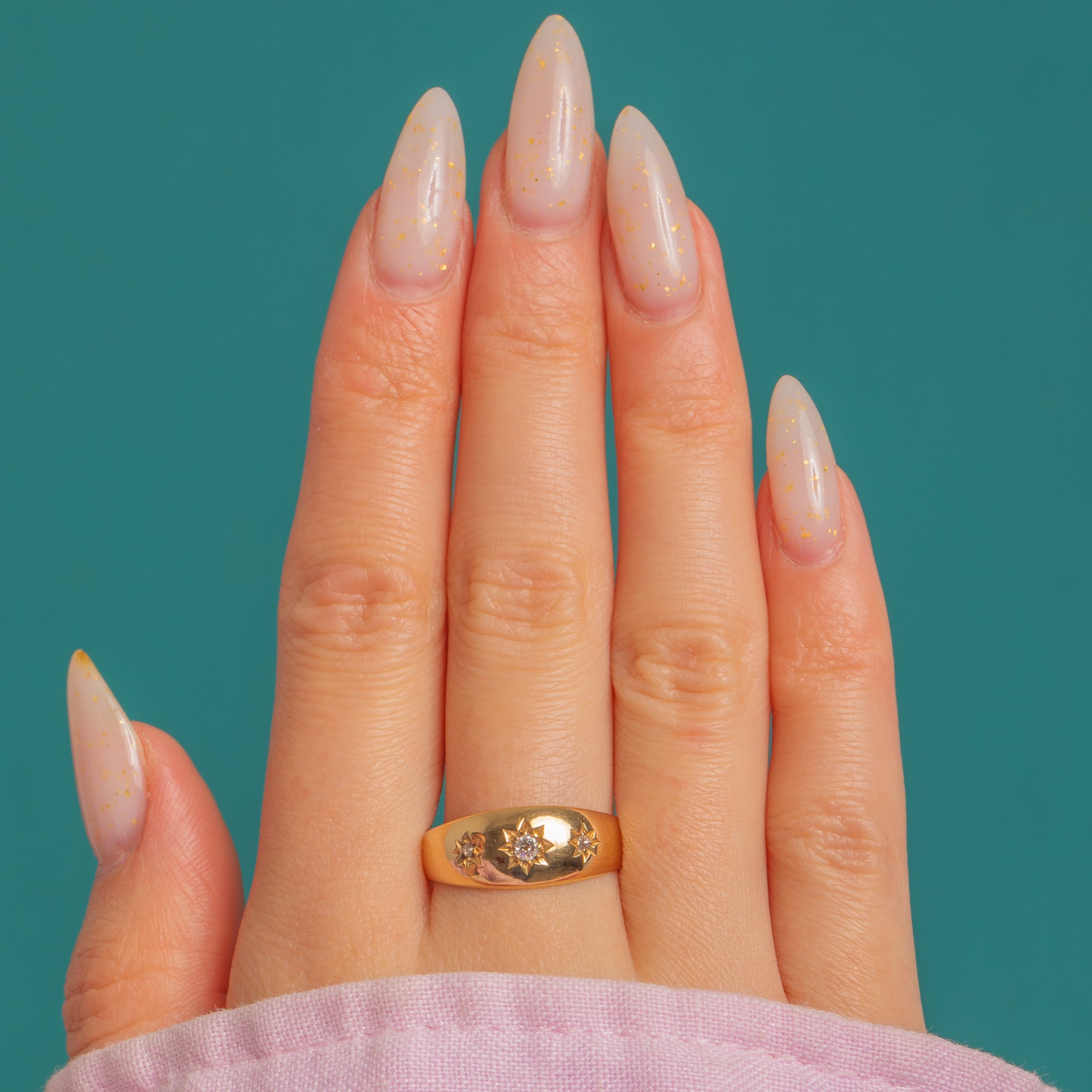 A luminous Late Victorian gypsy ring in rich 18ct Gold, set with a sparkling trilogy of Diamonds in crisp, hand-engraved star settings. The domed half-hoop profile and elegantly tapering shank give this piece its smooth, tactile feel, while the graduated layout—slightly larger centre stone flanked by matched sides—adds refined balance and fire.