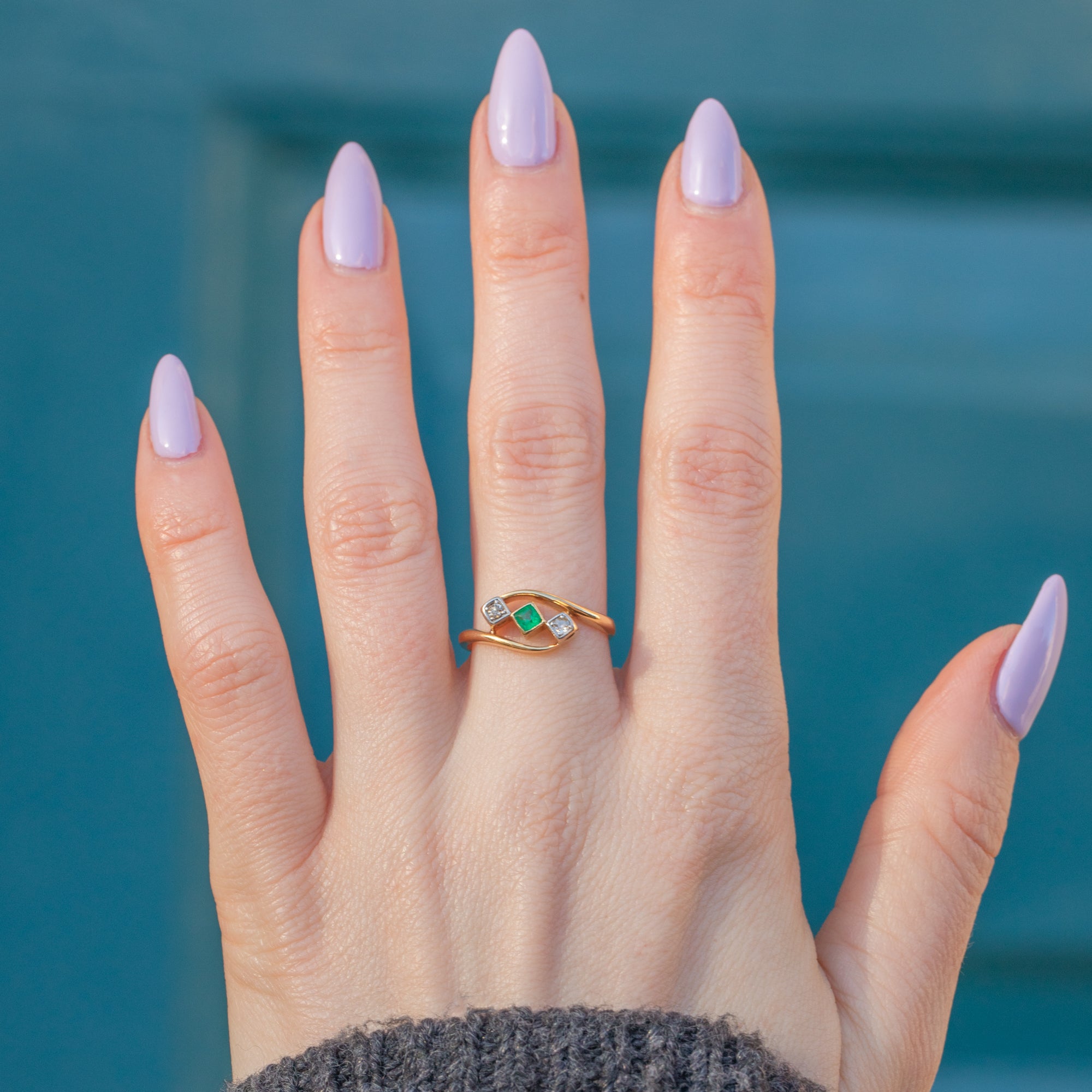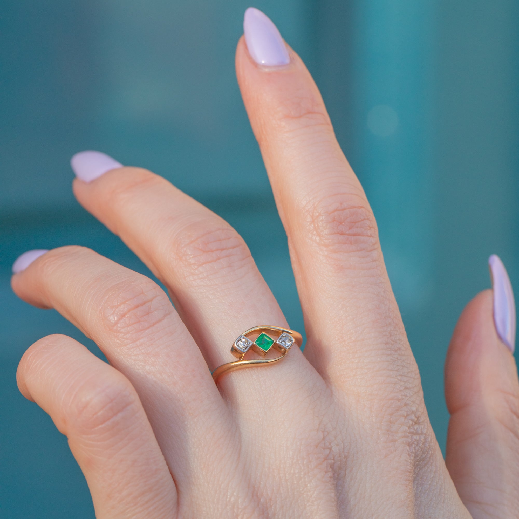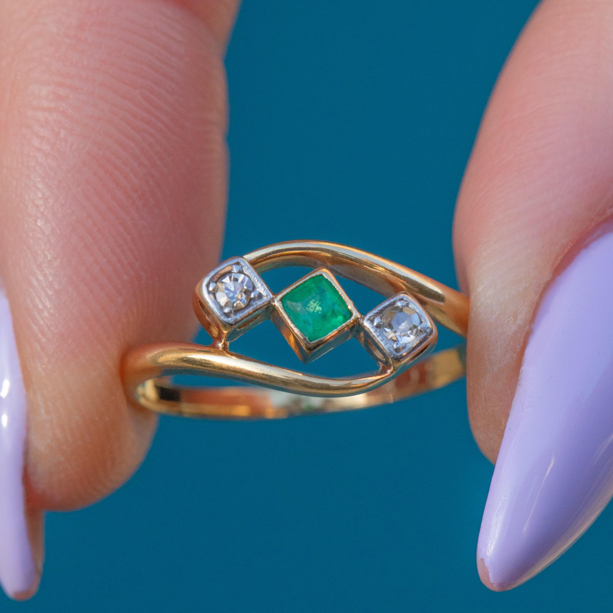 This antique 18ct Gold Emerald Diamond bypass ring would make an elegant choice for a unique engagement ring! The sumptuous 18ct Gold band wraps around the finger with undeniable luxury, curving around the gemstone trilogy in a classic bypass design.