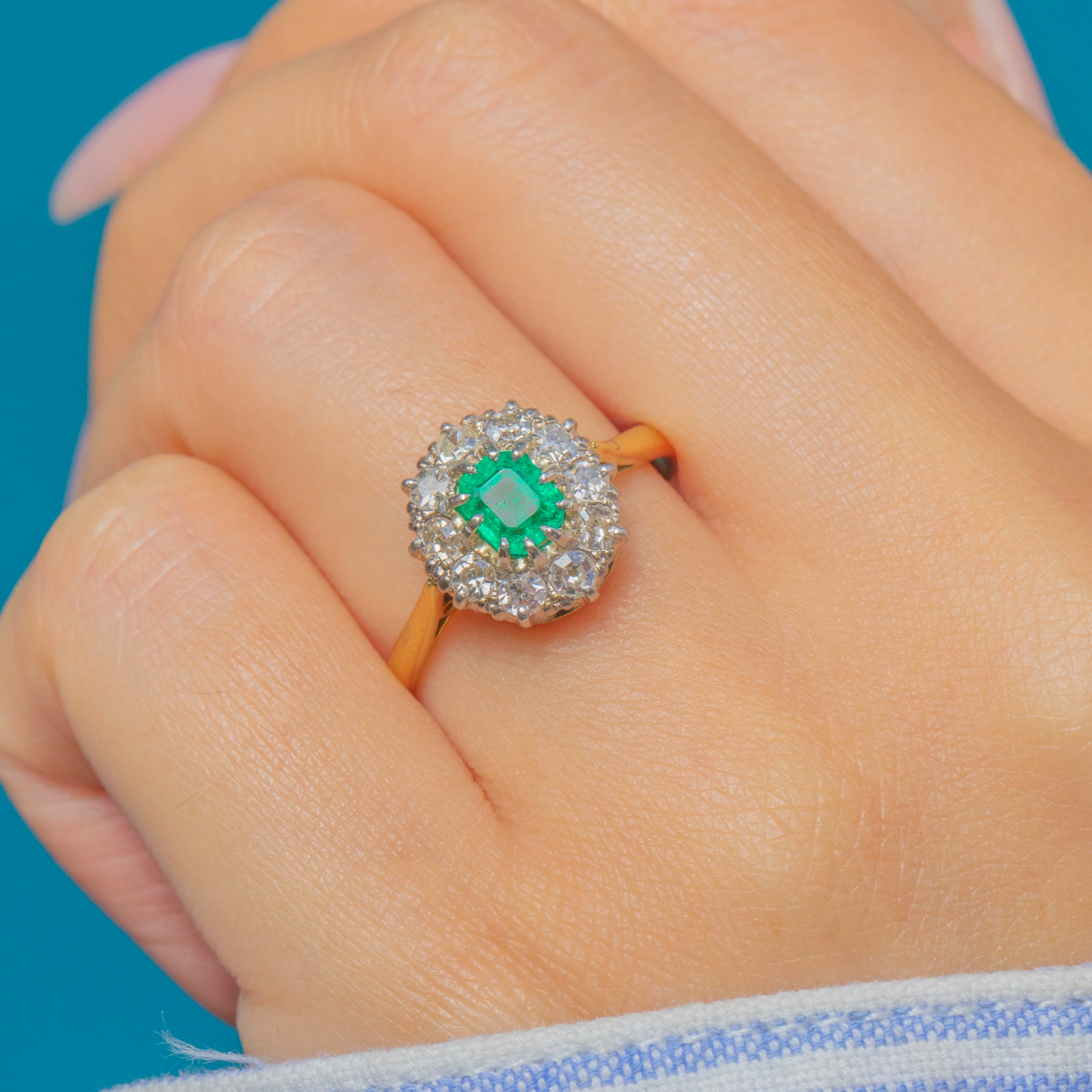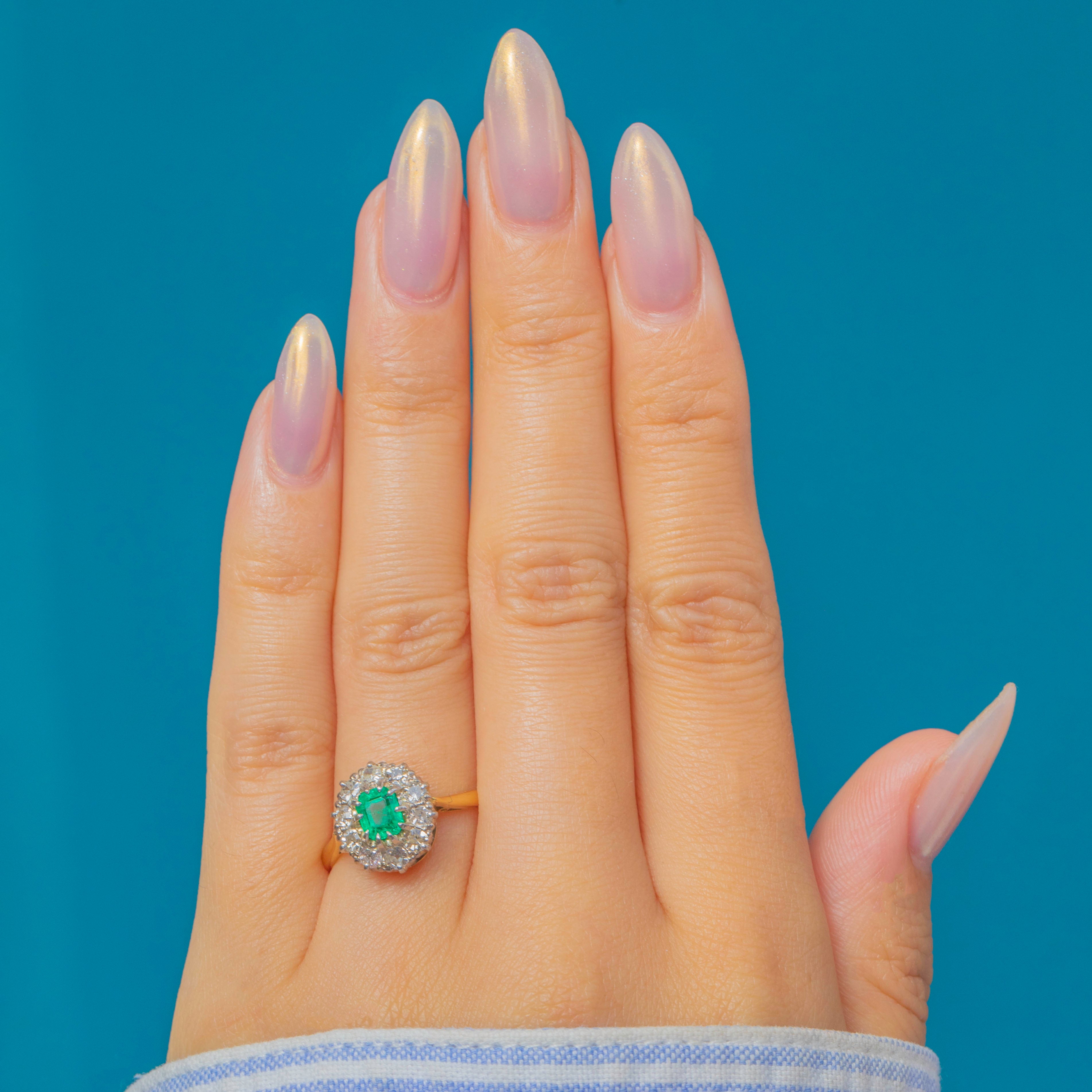 This early 20th-century cluster is pure elegance: a saturated grass-green Emerald at centre, encircled by a halo of lively old-cut Diamonds. Crisp Platinum claws keep the gems bright and defined against a warm 18ct Gold band—timeless, romantic, and endlessly wearable.
