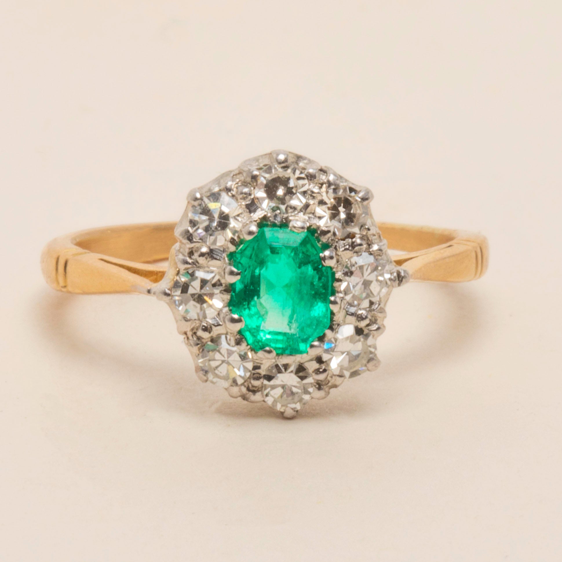 VERY GOOD. This antique 18ct Gold Emerald and Diamond cluster ring is in very good condition. The Emerald has a crisp set of facets and sits neatly inside a claw setting. A previous resize has caused some porosity on the back of the band, however, the Gold is still smooth and can be worn comfortably. The Diamonds are all secure, free from chips or abrasions, and look pretty in their Platinum settings. A classic addition that will instantly elevate your jewellery collection!