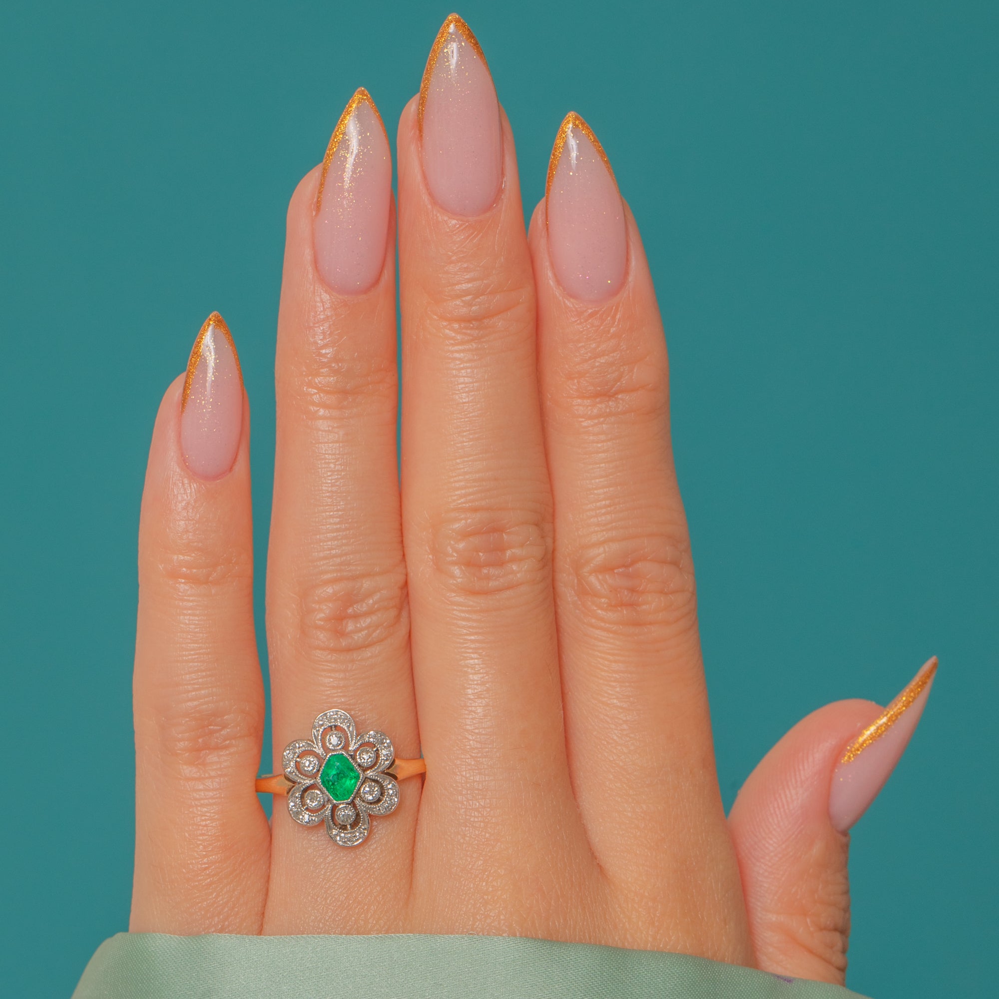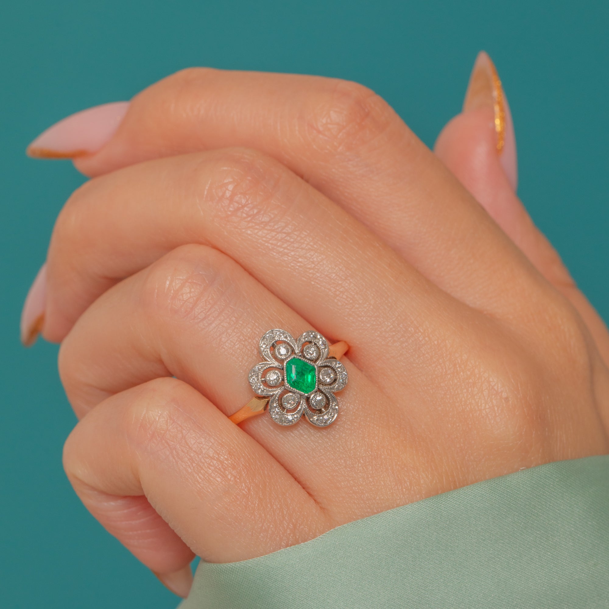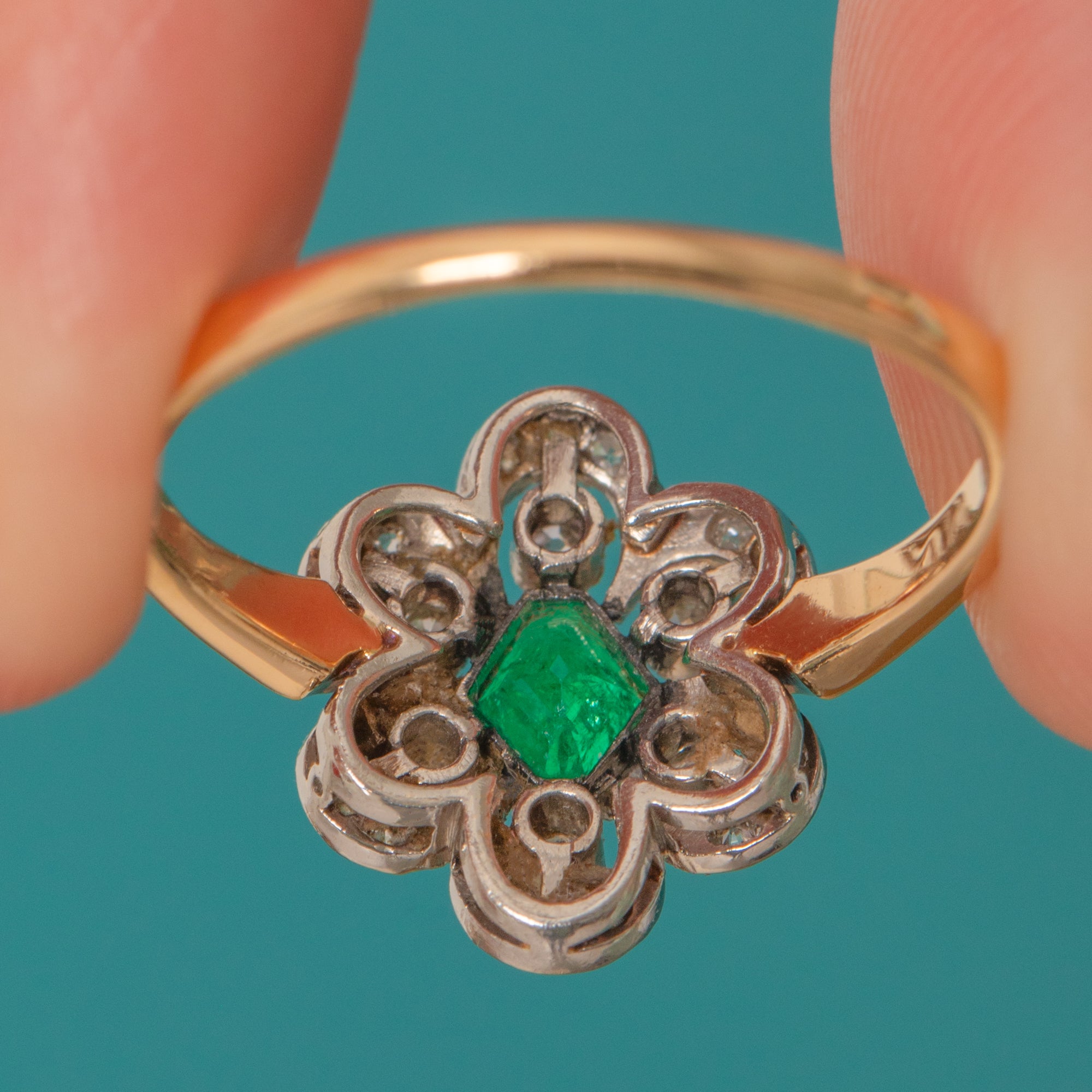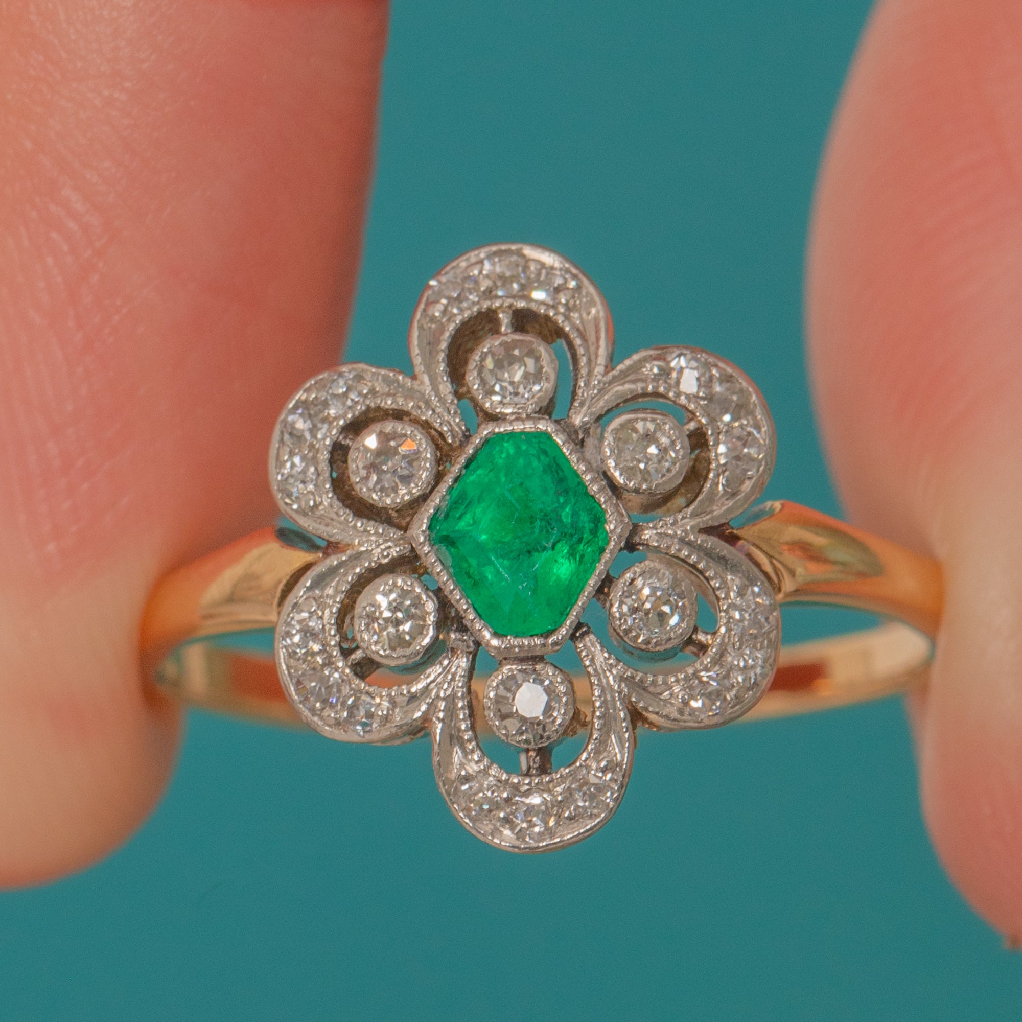 This charming antique 18ct Gold Emerald and Diamond ring dates to around 1910, at the very end of the Edwardian era, and she simply oozes grace and elegance! With her chic hexagonal Emerald centre and beautifully set petals of shimmering antique Diamonds, this ring is truly one-of-a-kind.