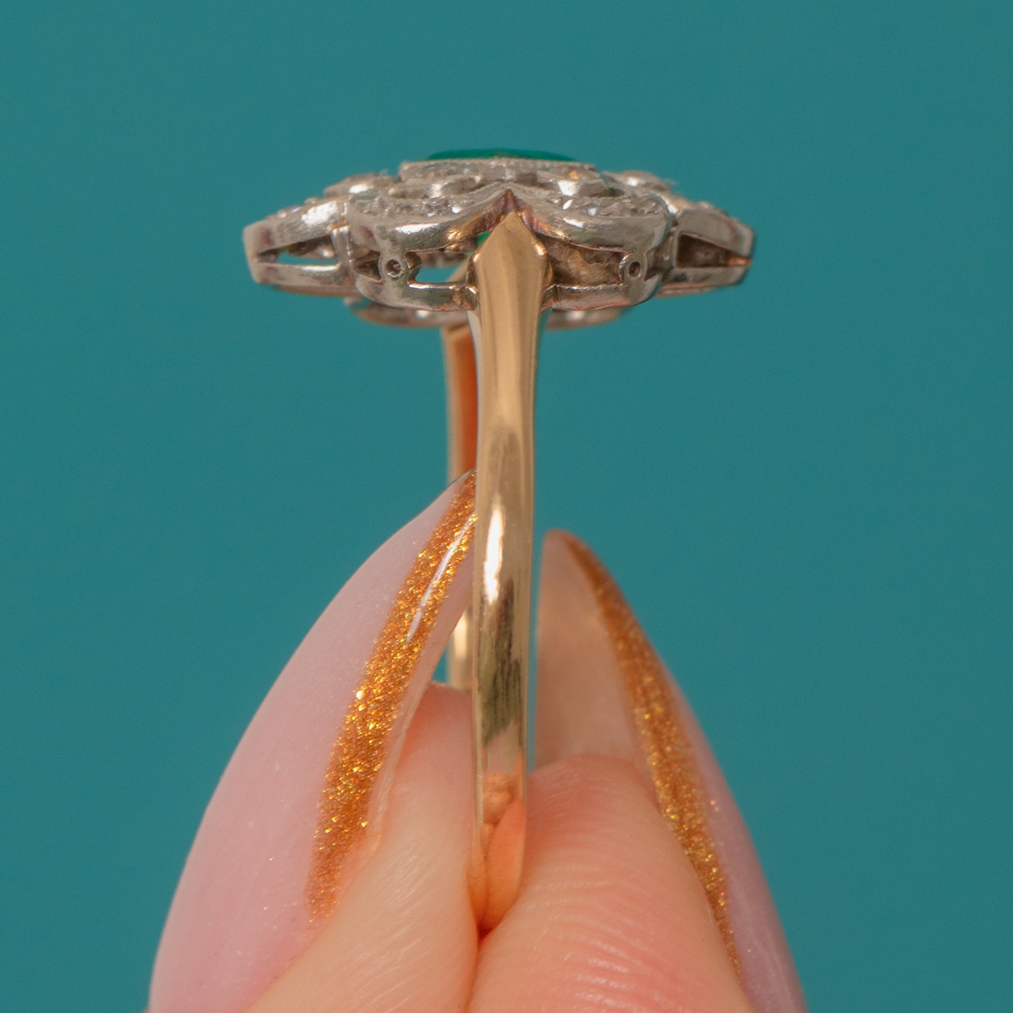 Crafted in rich 18ct Gold with refined Platinum millegrain settings, she has all the feminine delicacy we so love from the Edwardian to early Art Deco era — a gorgeous choice for an antique engagement ring or treasured heirloom.