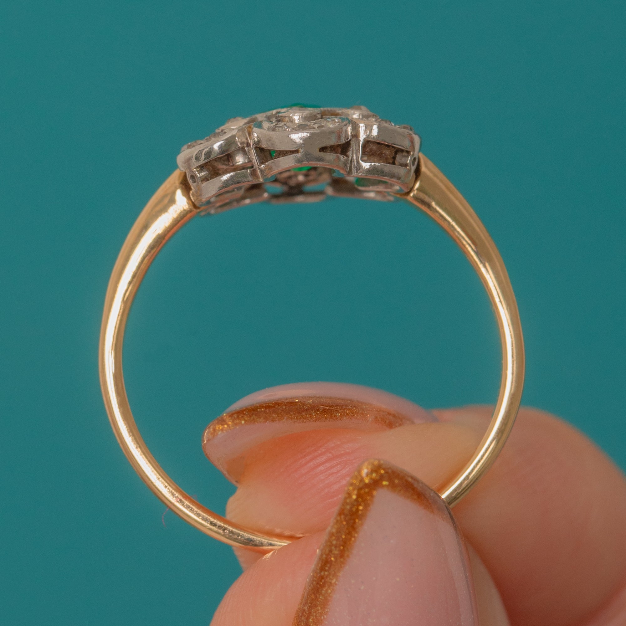 EXCELLENT: The Emerald is bright and vibrant with minor natural inclusions. The antique Diamonds are clean, well-matched and full of sparkle. Platinum settings are crisp and secure, and the 18ct Gold band remains strong with minimal surface wear — beautifully preserved for its age.