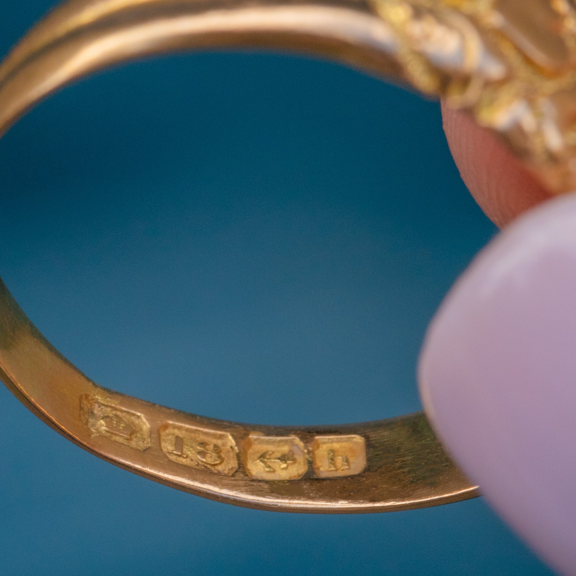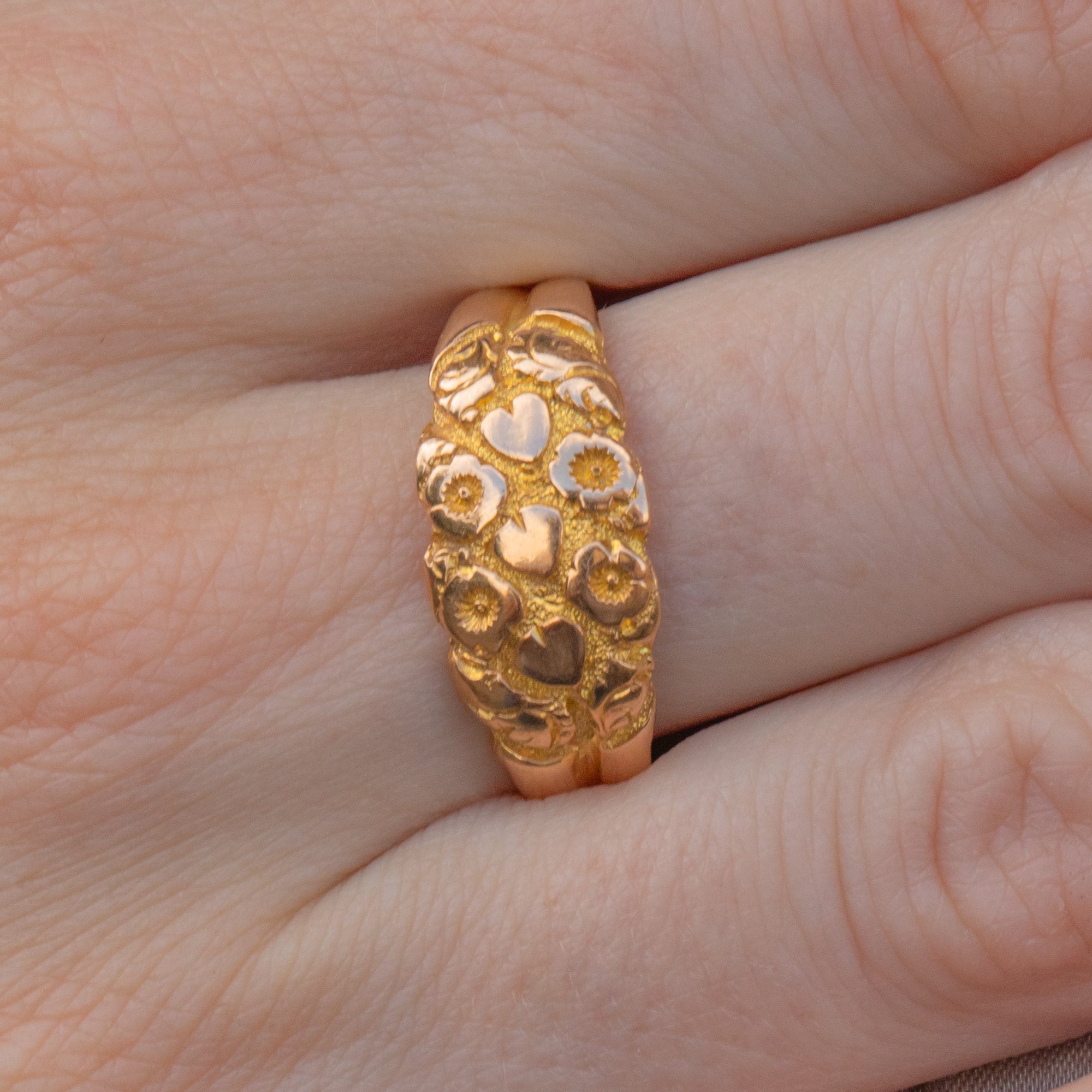 Flaunting a flourish of forget me not flowers, this antique 18ct Gold engraved flower ring will bring happiness to your repertoire. Her glossy flowers are illuminated by her stippled background, crafted entirely from honey hued 18ct Gold.