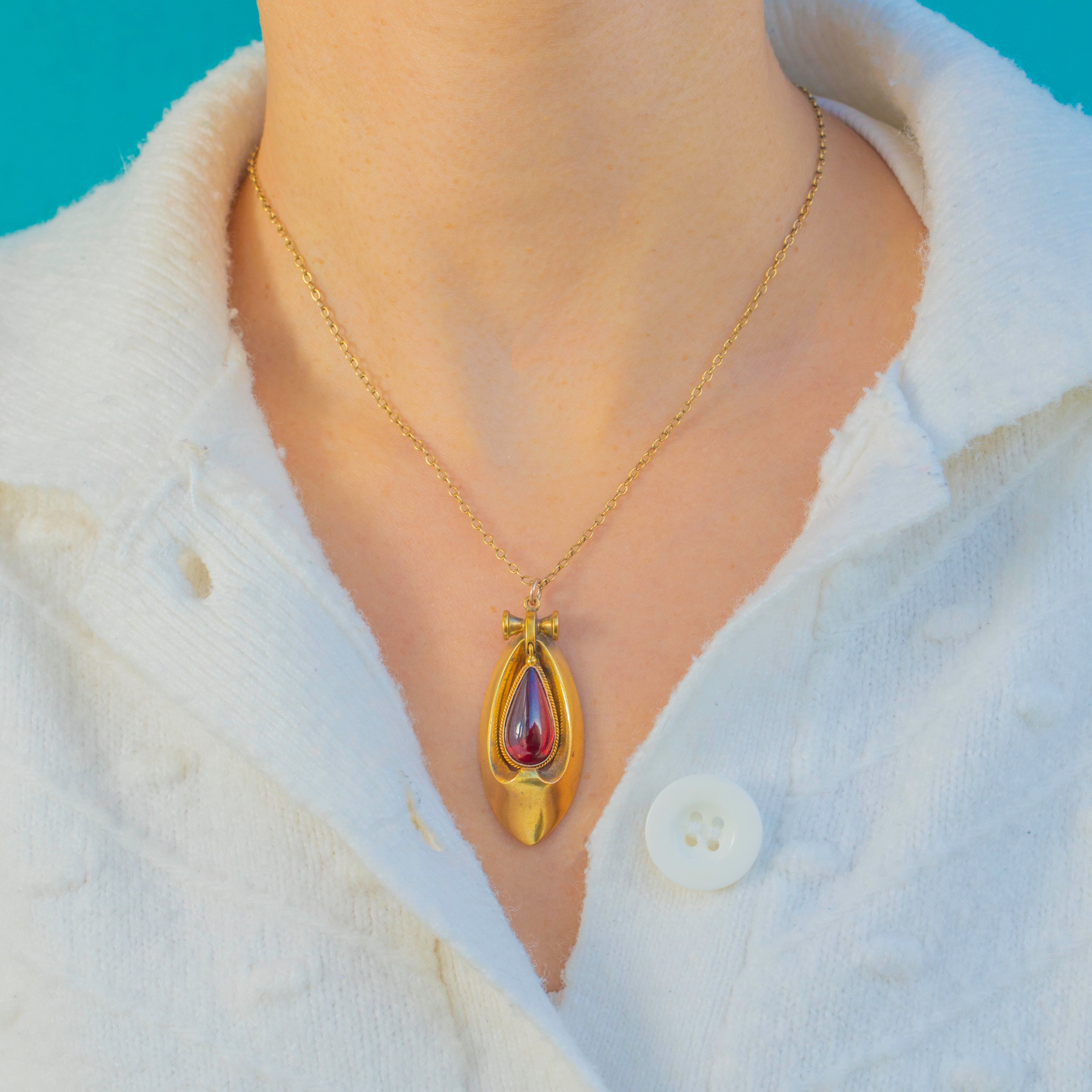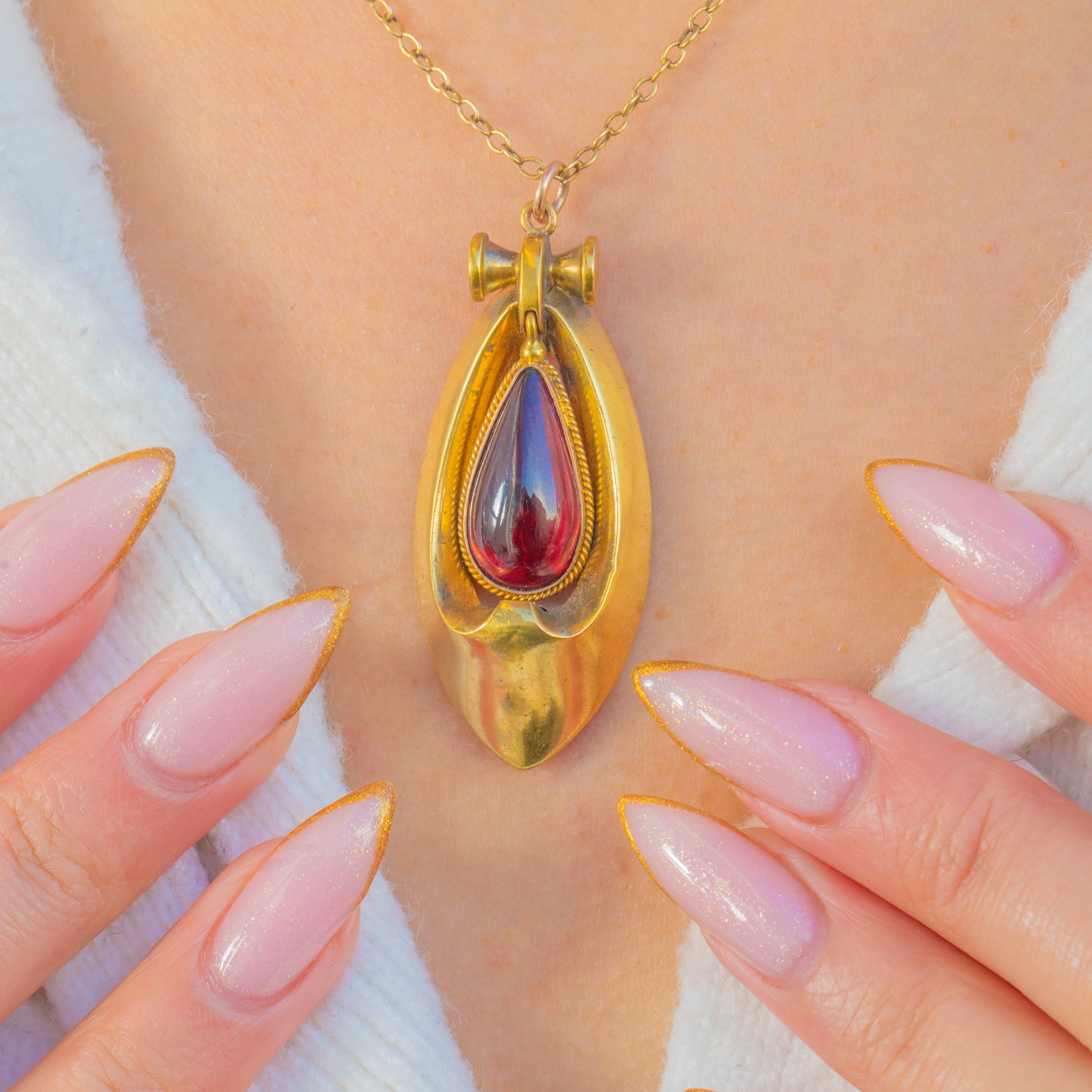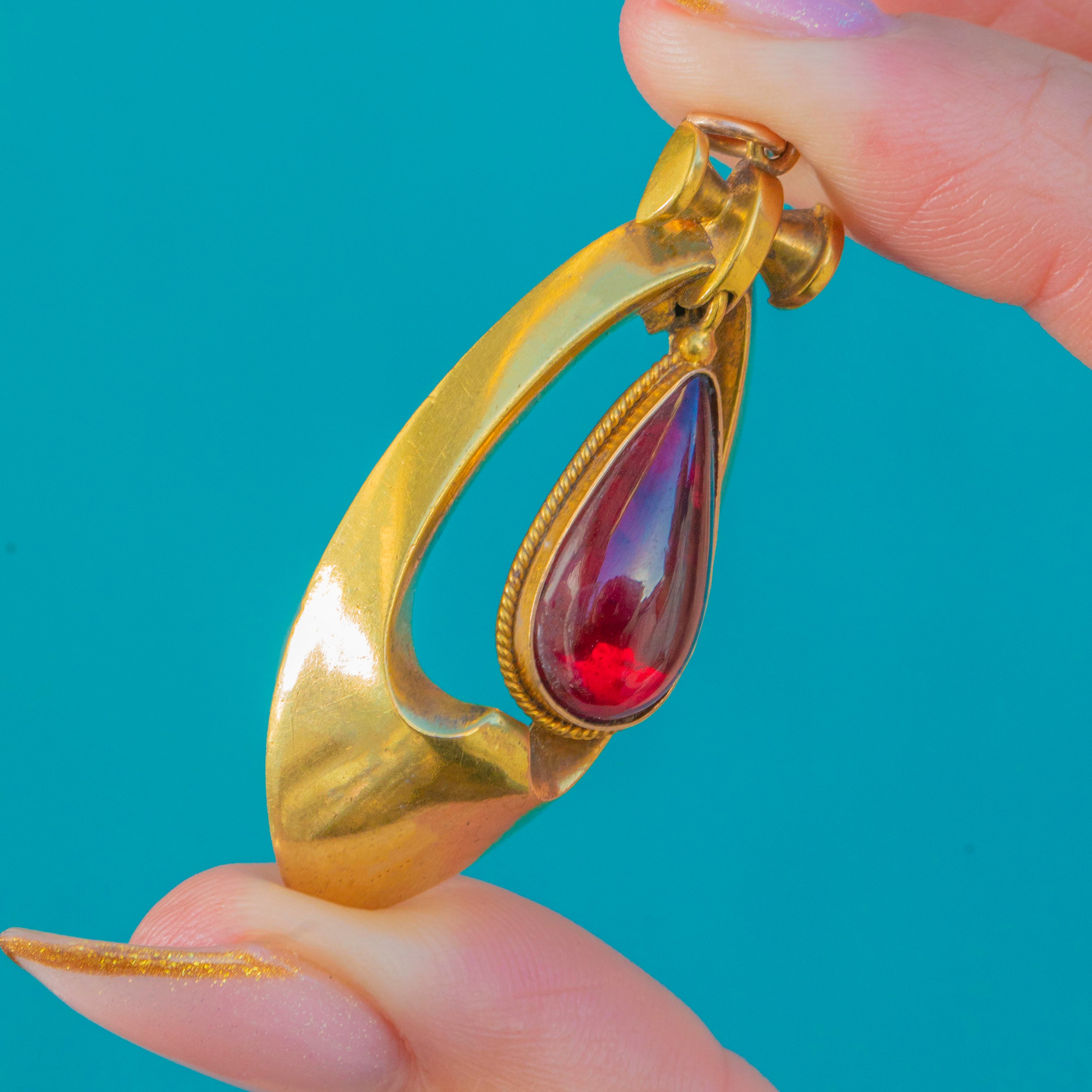This magnificent Victorian Etruscan Revival pendant is an exceptional example of late 19th-century craftsmanship, set with a breathtaking pear-shaped Garnet cabochon of deep, blood-red intensity. Glossy, domed and full of inner fire, the Garnet sits within an elegant sculptural gold frame that captures the movement and curves so iconic to the Etruscan Revival style.