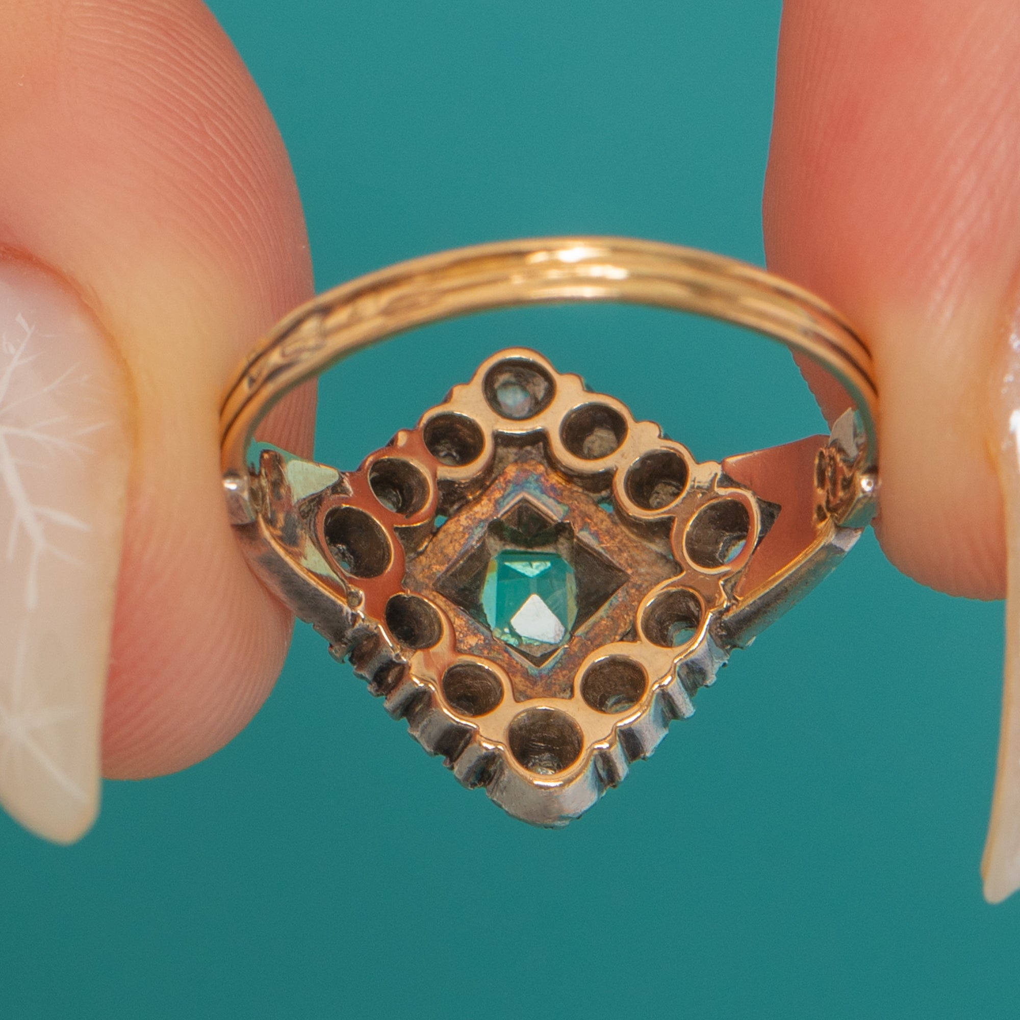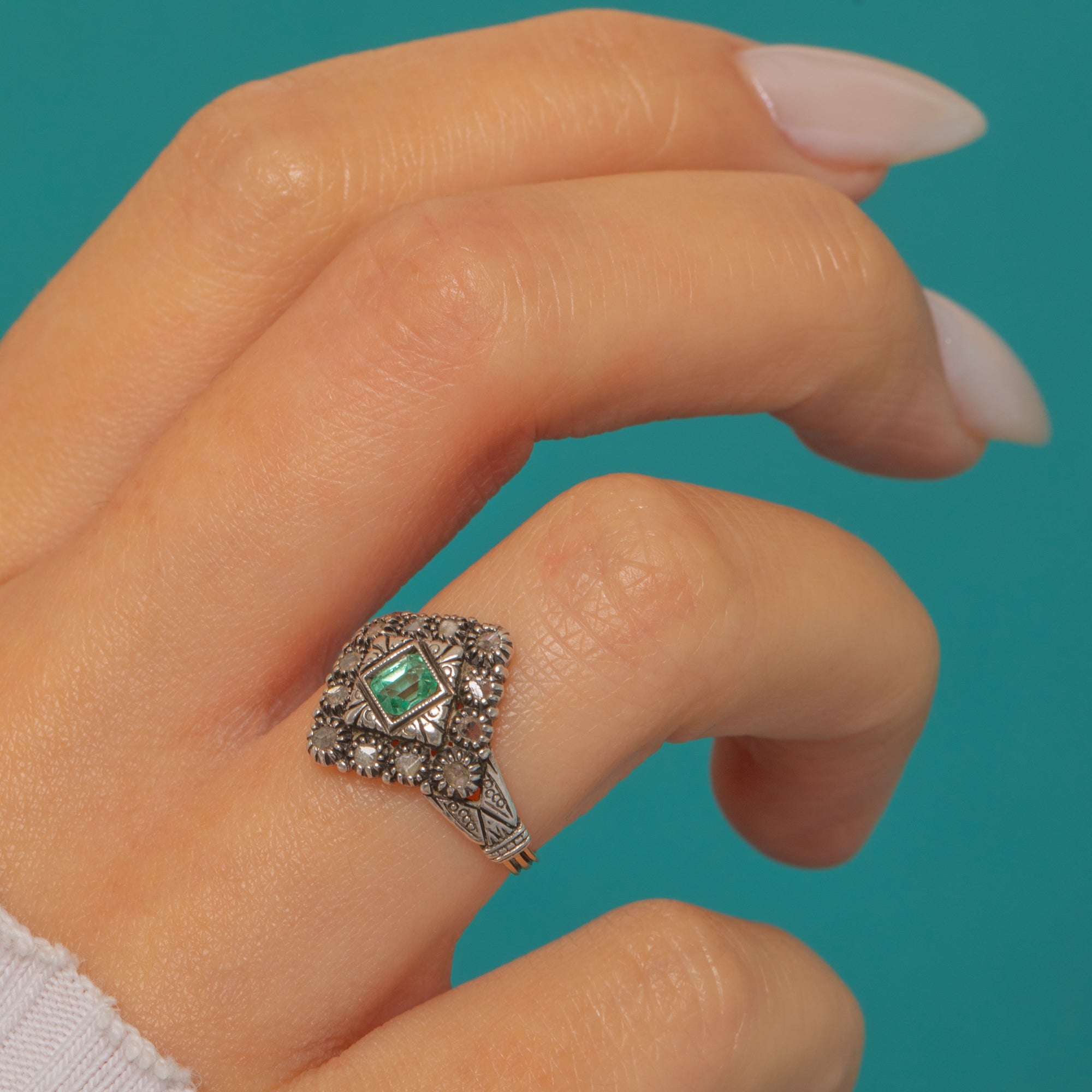 A refined French Victorian cluster ring with a geometric silhouette, crowned by a bright square step-cut Emerald framed in fine milgrain. A halo of petite Diamonds encircles the centre, lending delicate sparkle and definition to the diamond-shaped head. The face presents a Silver finish that contrasts elegantly with the warm Gold shank, creating that timeless two-tone allure.