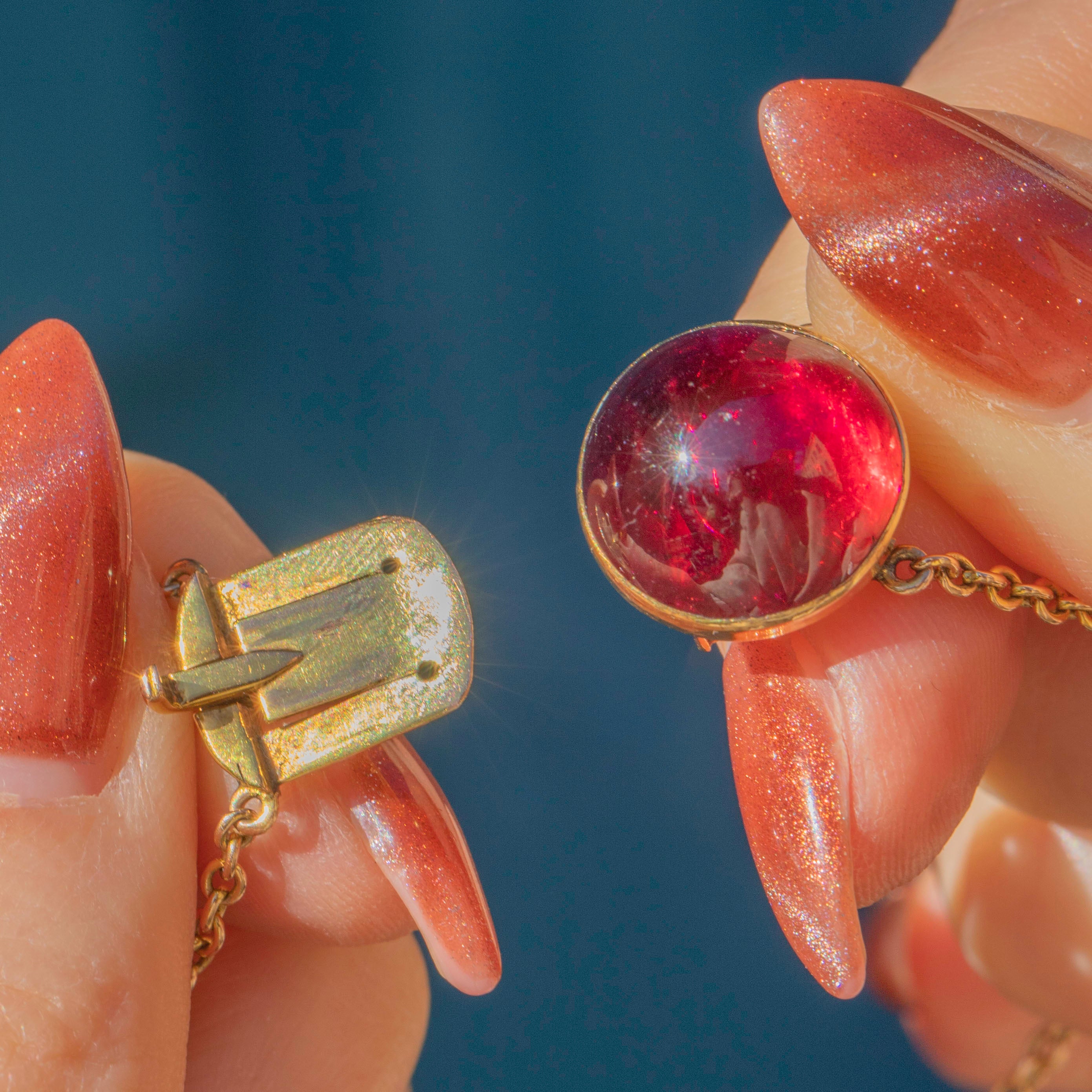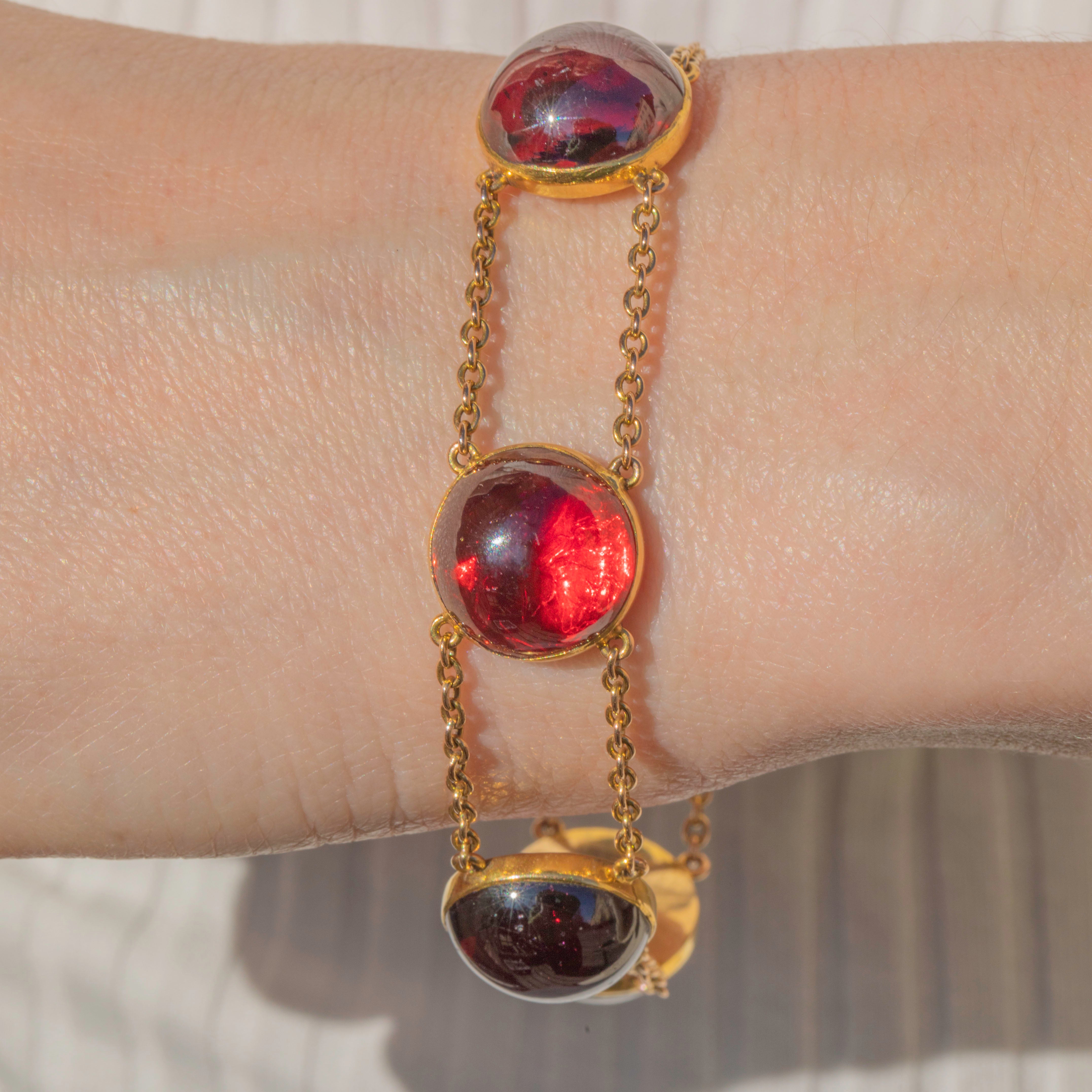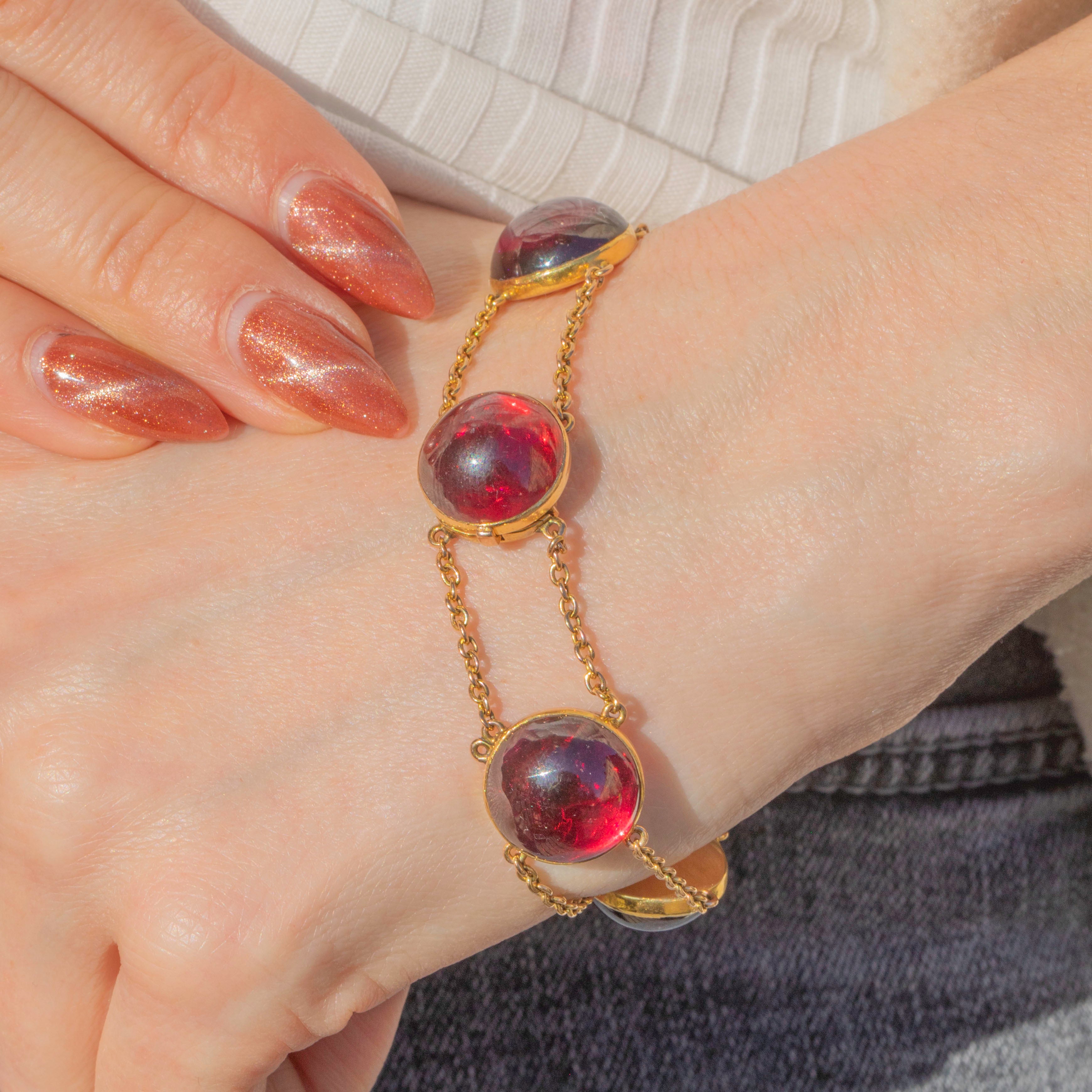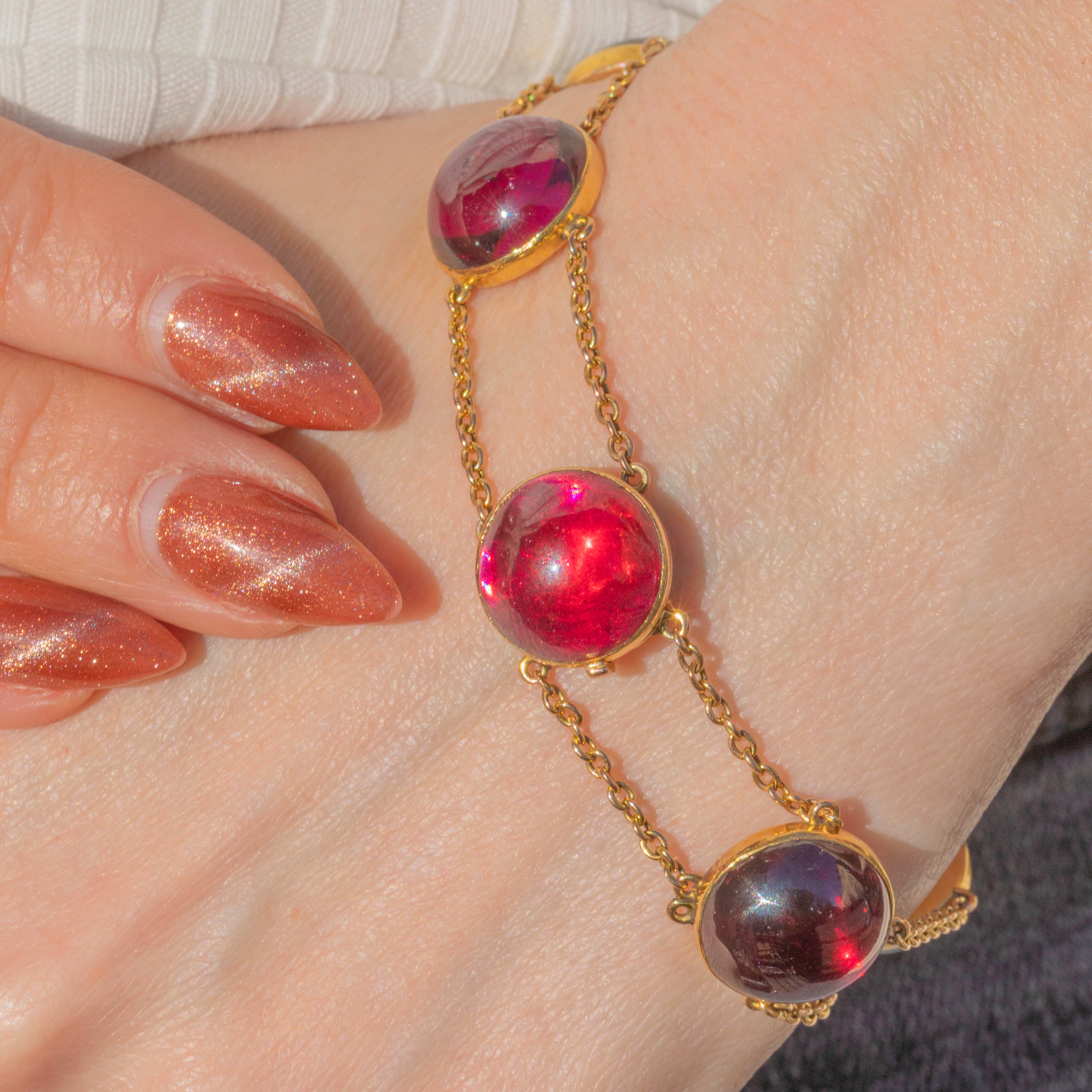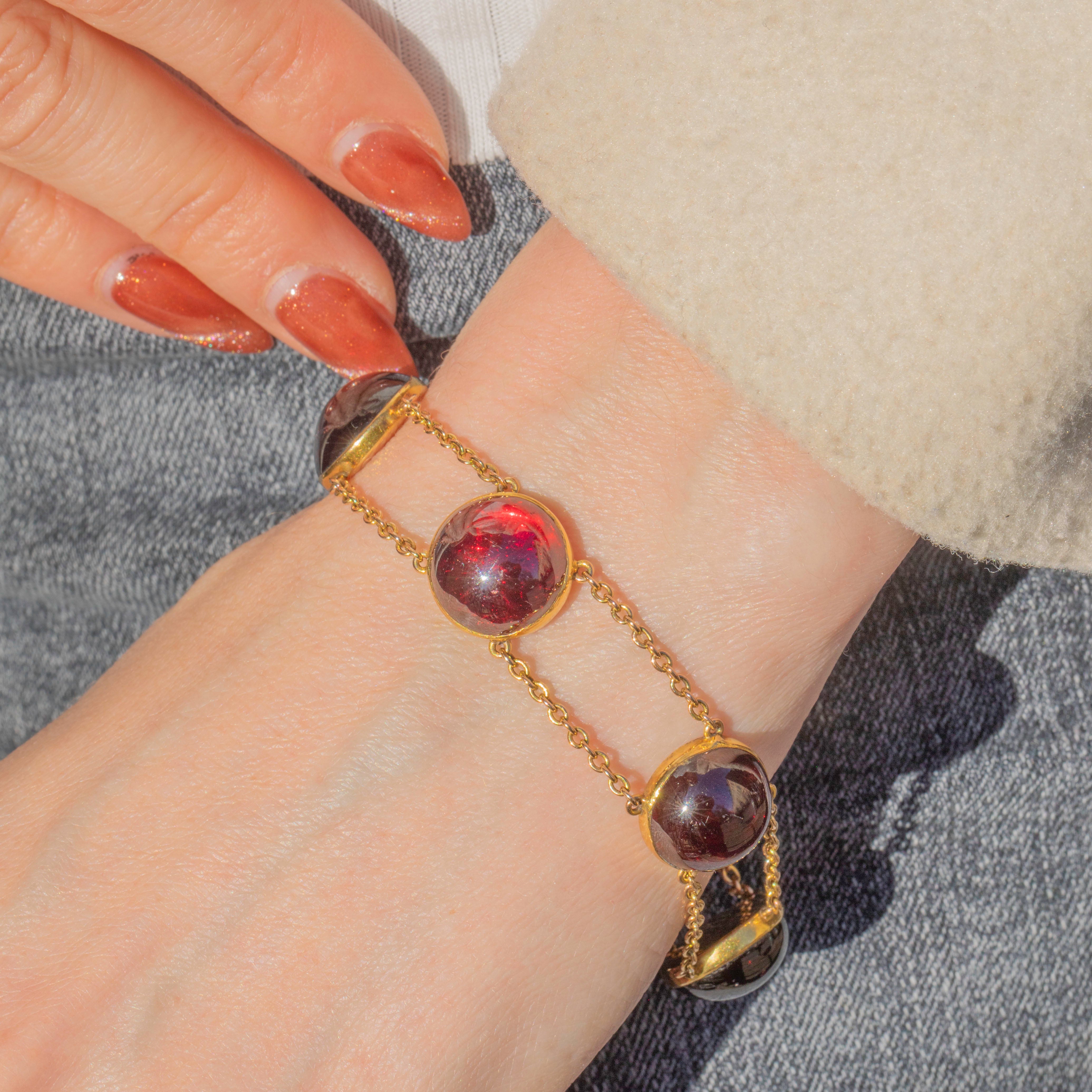 EXCELLENT: This antique 18ct Gold Garnet cabochon bracelet is in excellent condition. This 89.00ct Garnet bracelet wears uber comfortably, closing with a secure clasp. The Garnets are smooth, and secure in a bezel setting. There are some nibbles to the surface of some of the cabochons, but this isn't obvious to the naked eye! The chain links are all secure so you can wear this beauty confidently.