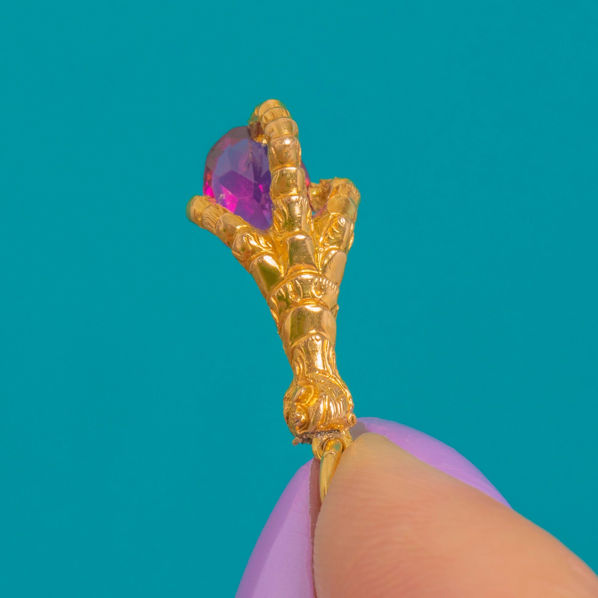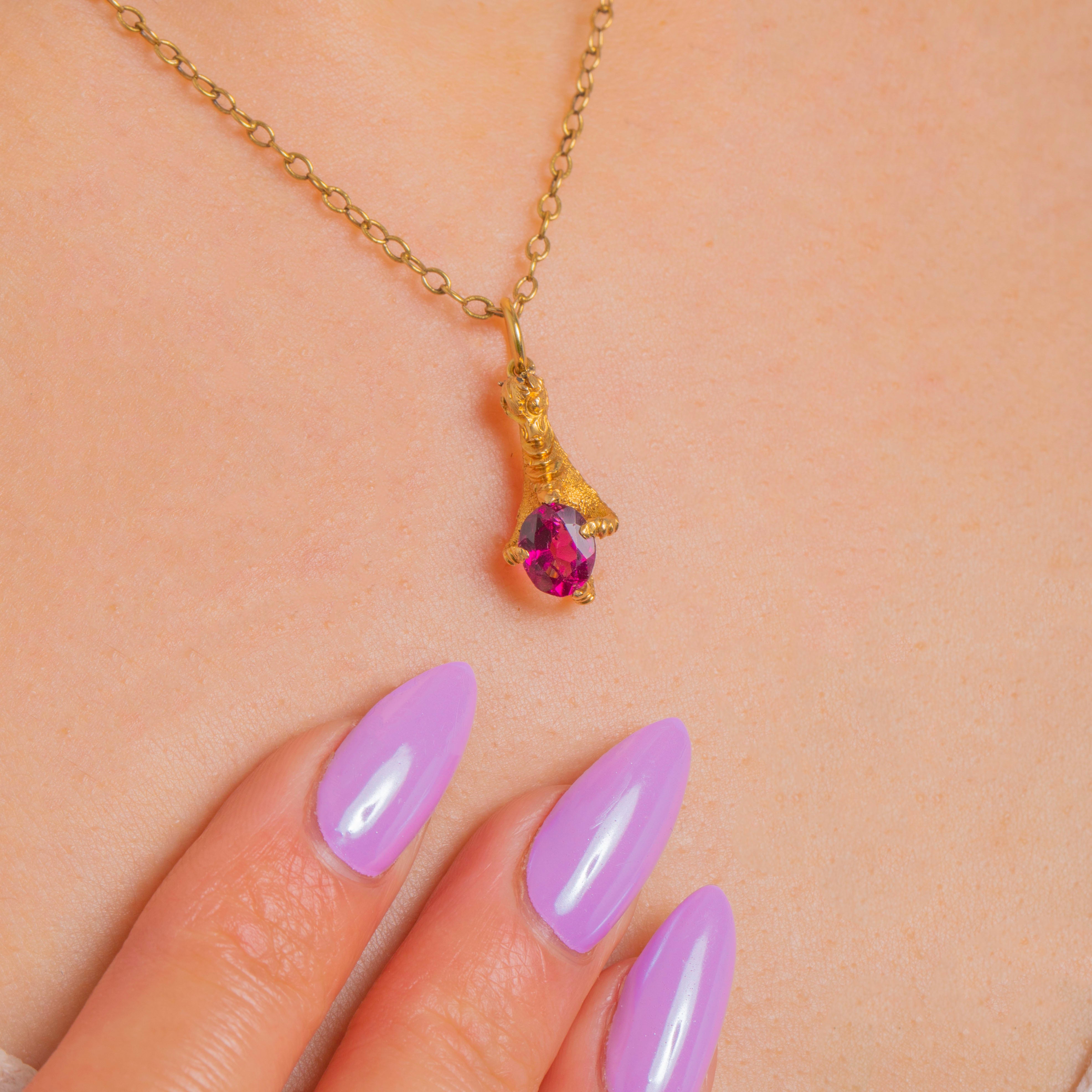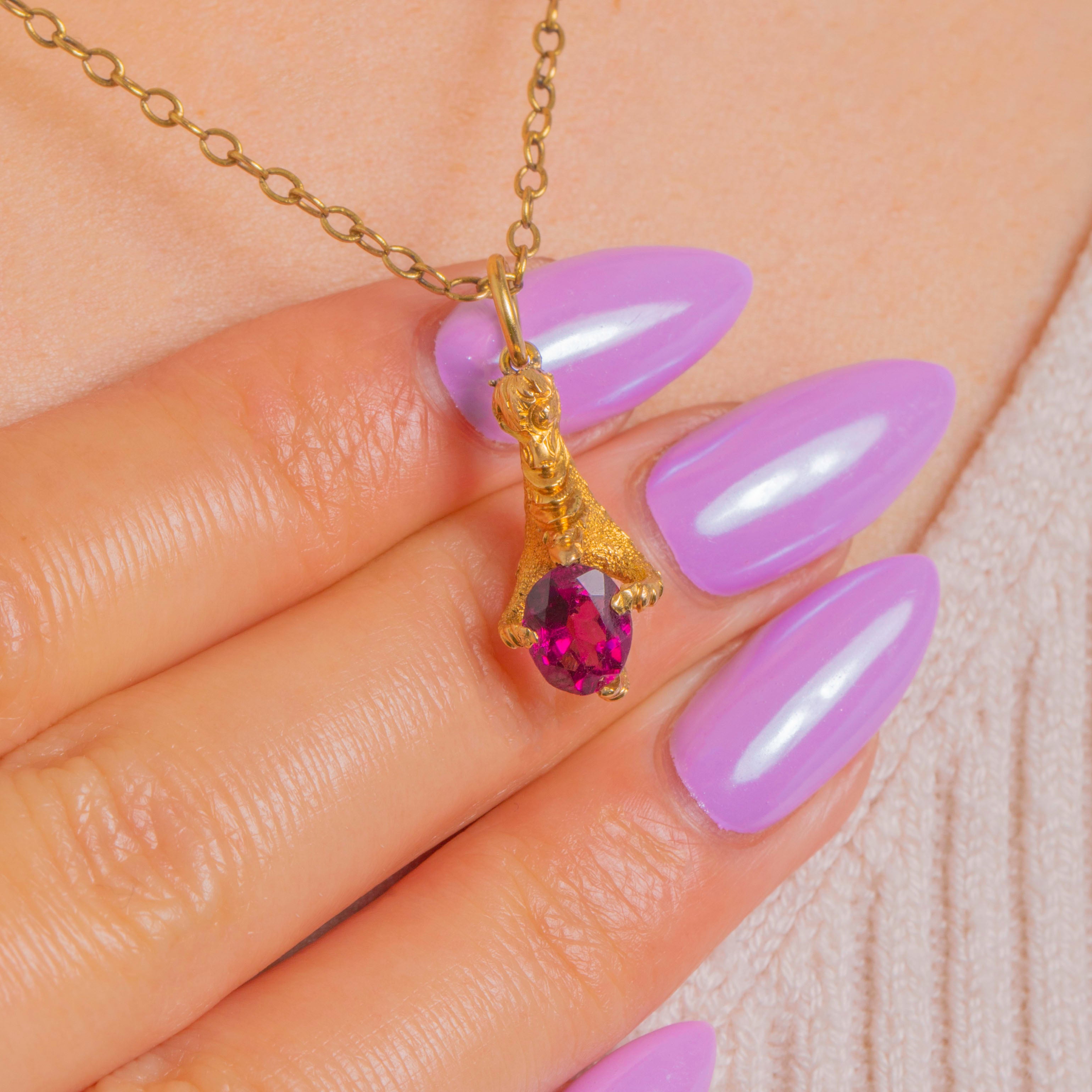 A delightful Victorian treasure, this 18ct Gold charm is sculpted as a naturalistic claw gently clasping a vivid oval Garnet. The three-dimensional figural form flows around the gemstone, with defined talon-like terminals and subtle texturing that accentuates the warm glow of high-carat Gold.