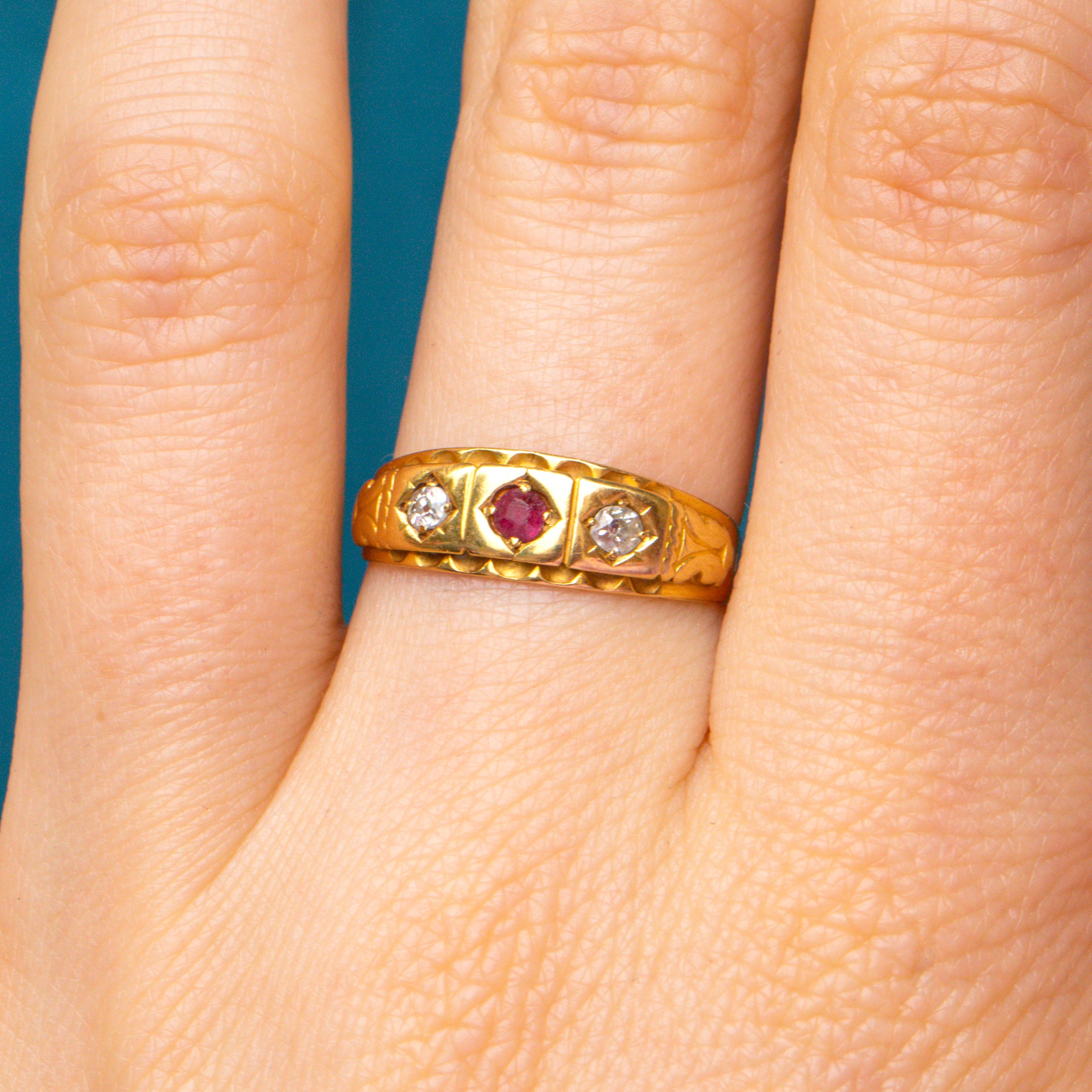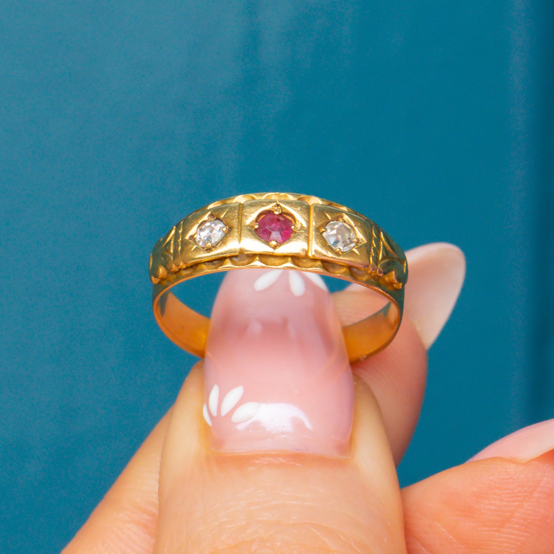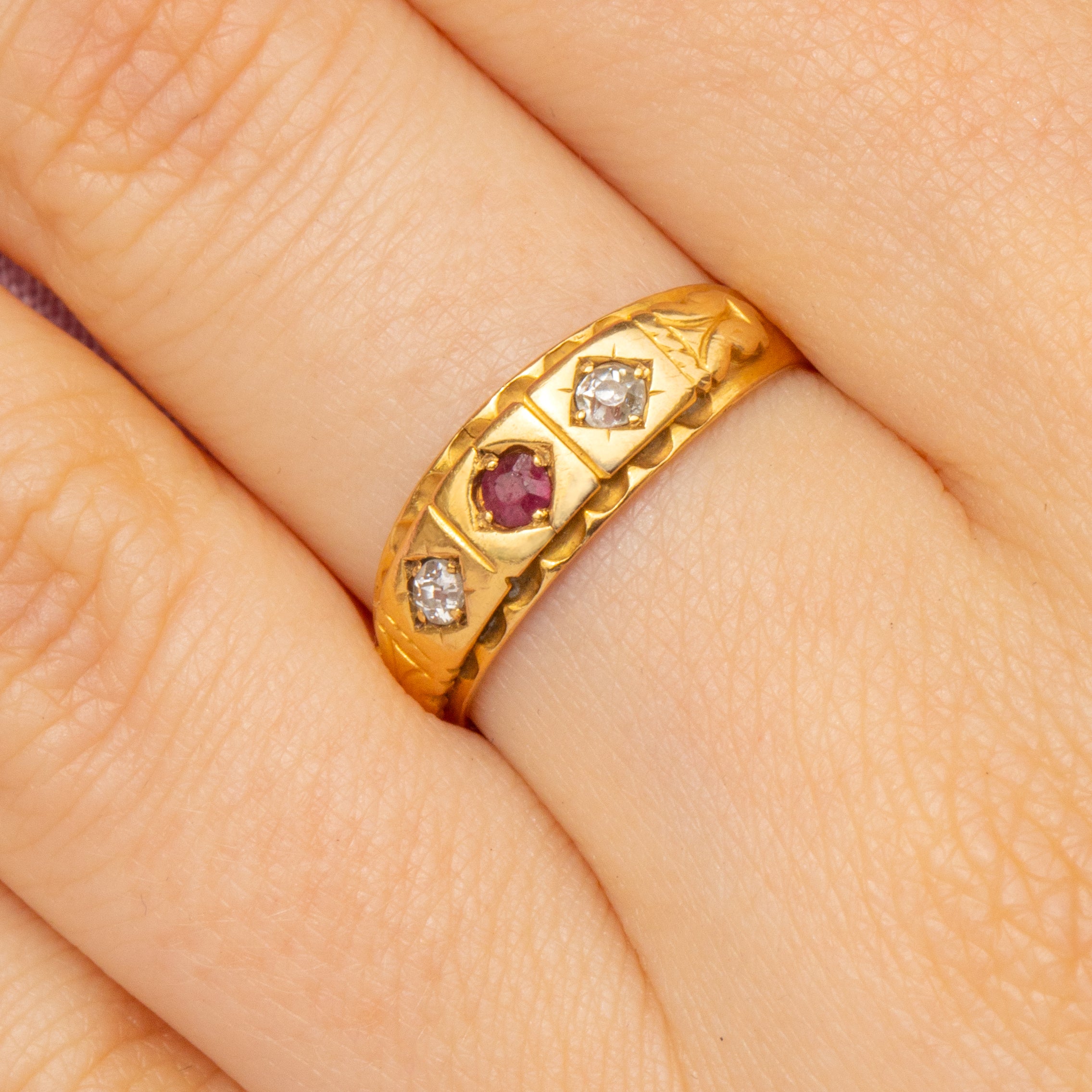VERY GOOD. This antique 18ct Gold Garnet Diamond gypsy ring is in very good condition. This ring has a gorgeous band that is stamped 18ct, and it is super smooth. There is a resize mark that has partially obscured the hallmarks on the inside of the band, but it's only visible on the inside. The gemstones are secure and this piece wears like a dream!