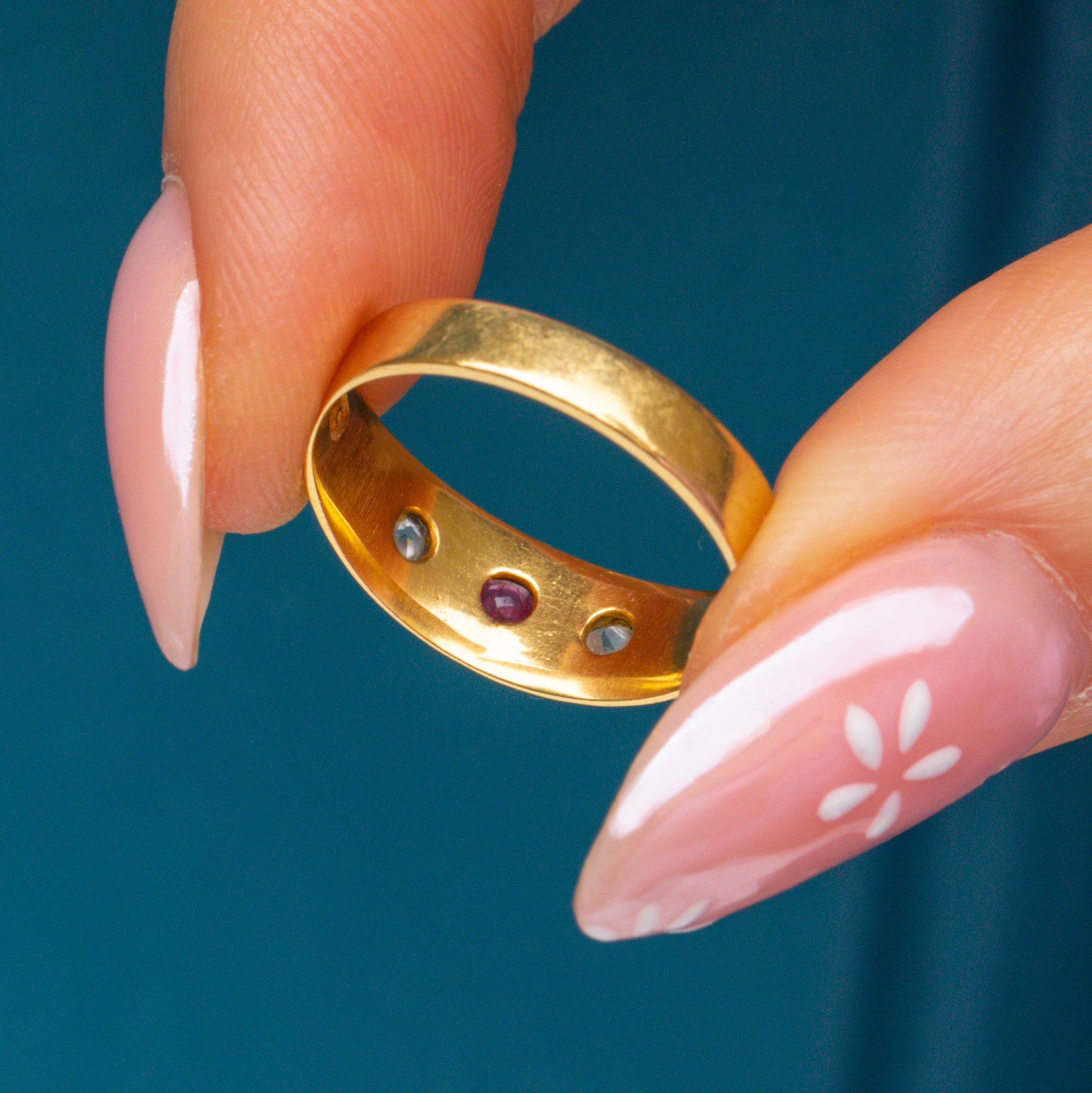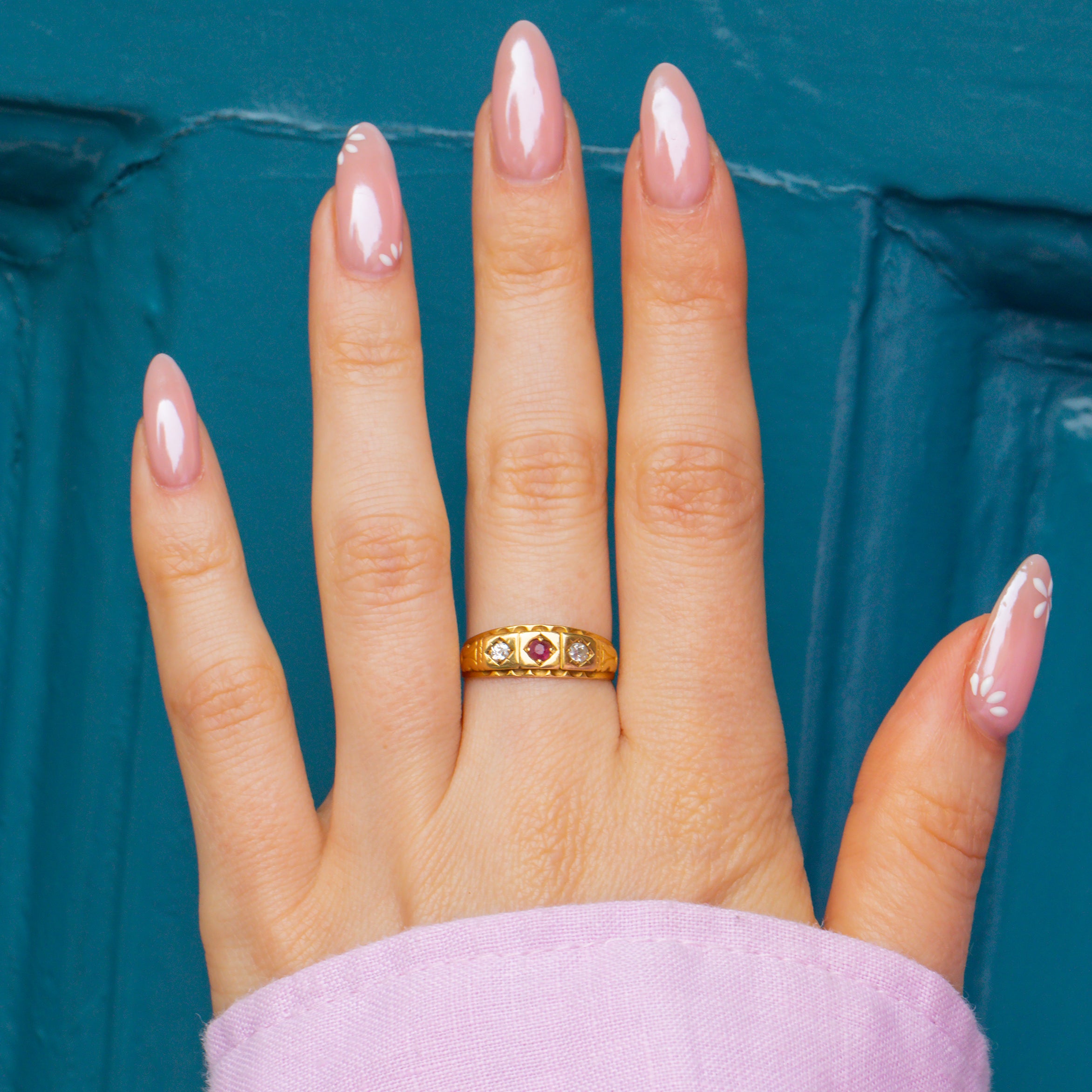 Perfect for embedding into your ring stack, this Gypsy ring is a timeless choice that will give you continuous wearing pleasure. The Garnet and Diamond duo pair beautifully with the warm glow from Gold, and the little details on the shoulders add another flourish of detail!