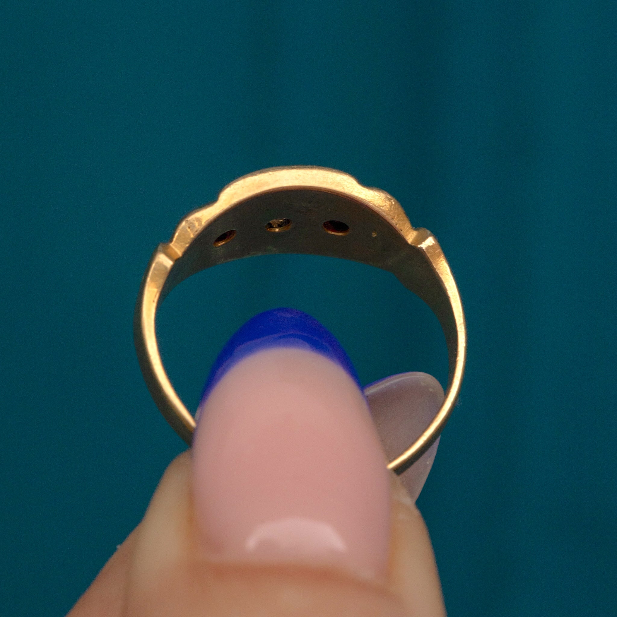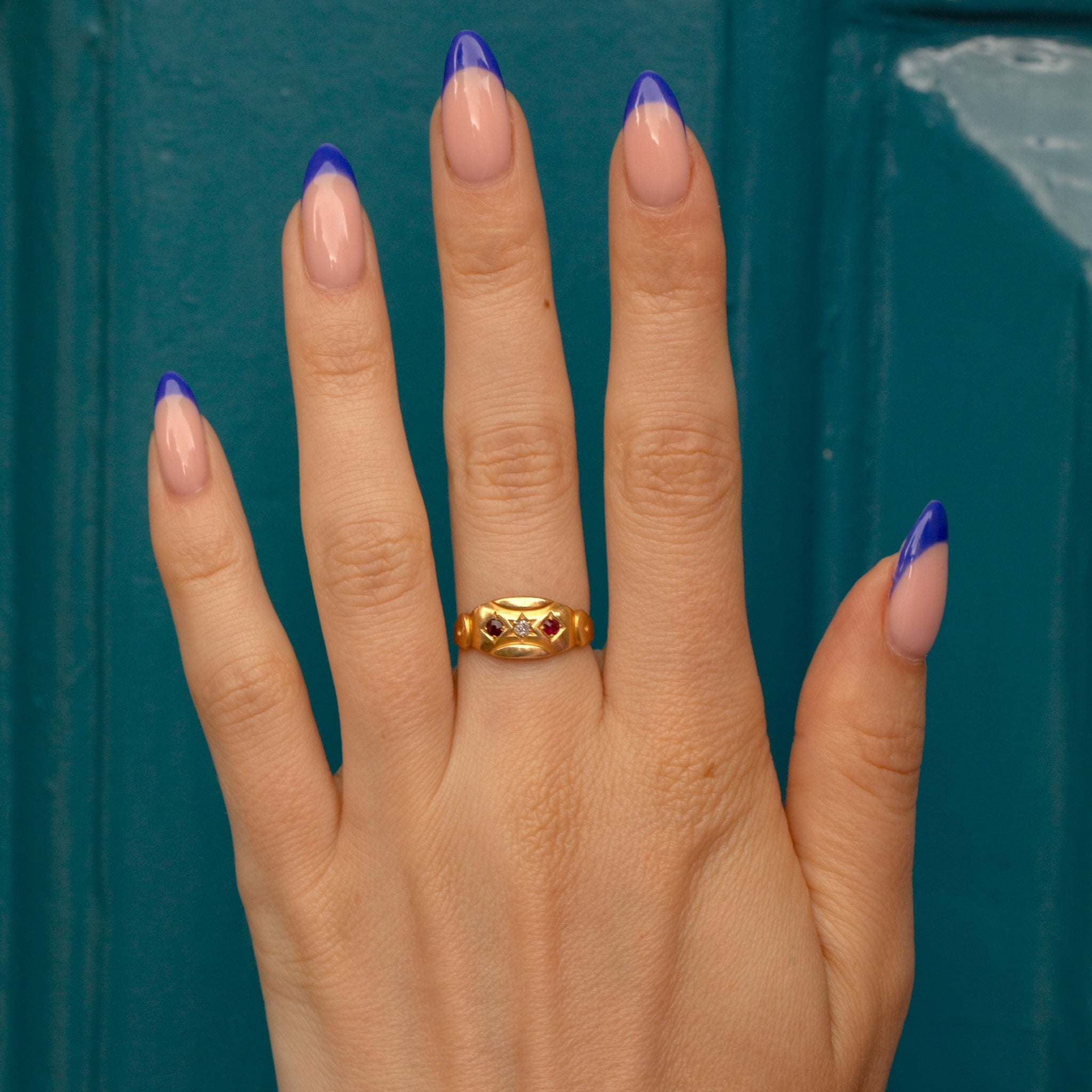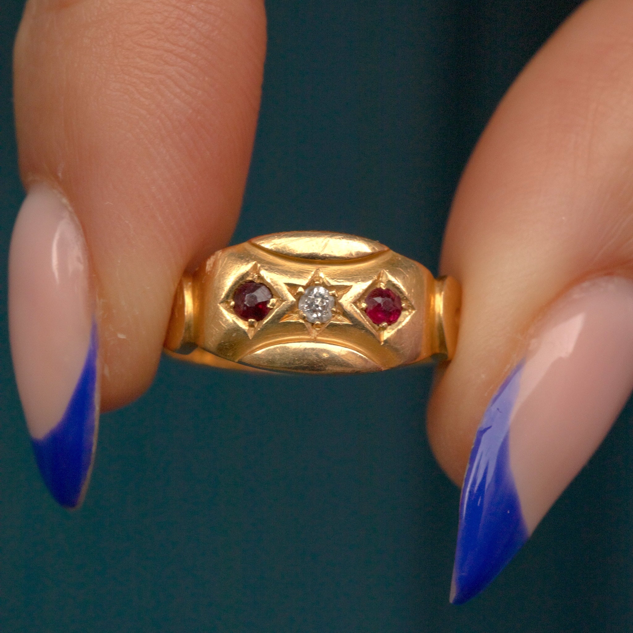 The star-set Diamond is flanked by crimson Garnets, each one glistening beneath the light. With a full set of hallmarks dating to 1899, this Victorian gypsy ring is a fine collector's piece!