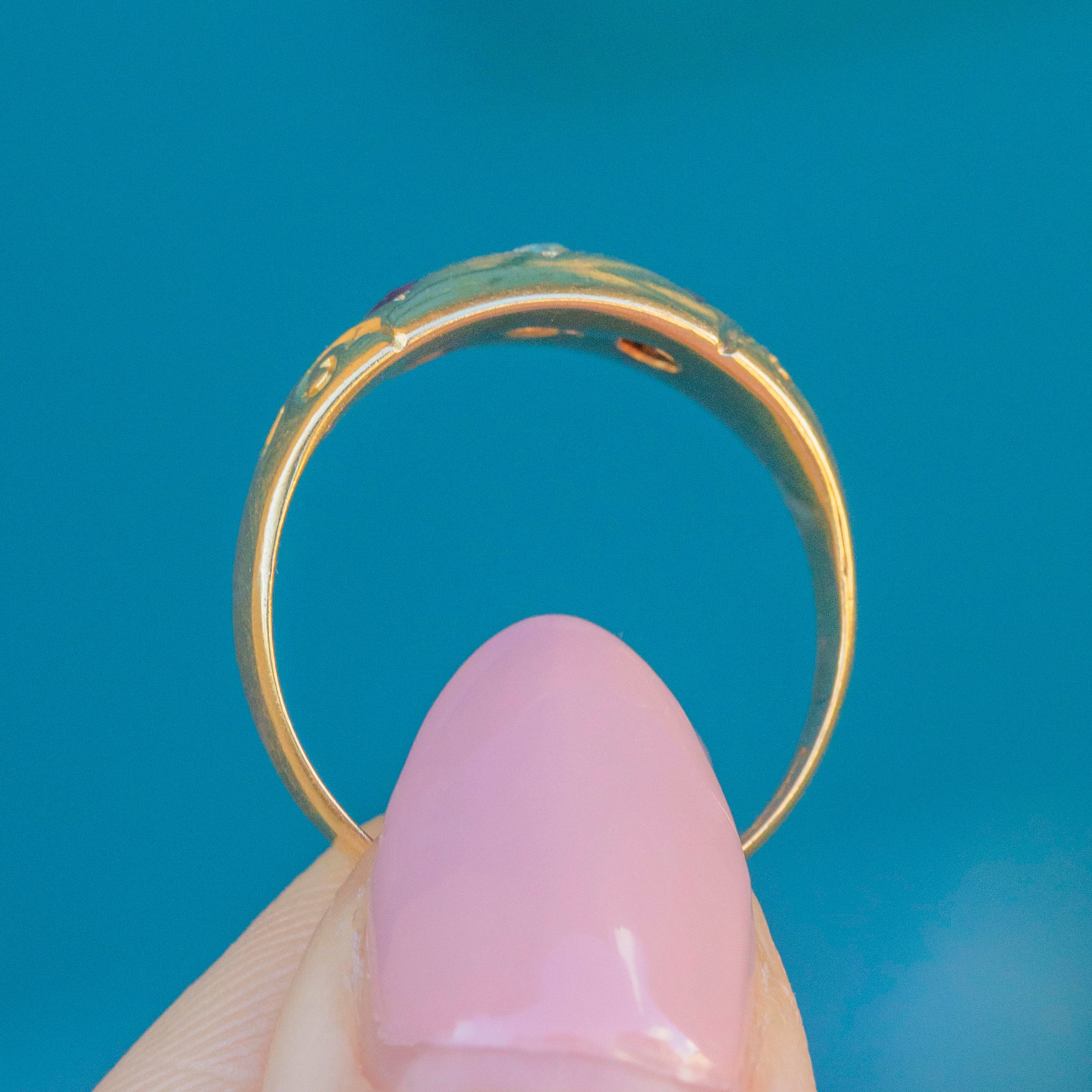 Featuring two cherry-red Garnet stones and a single sparkling star-set Diamond, this Edwardian 18ct Gold ring certainly does not disappoint! With a full set of English hallmarks inside the band, we can accurately date this Edwardian delight to 1902!