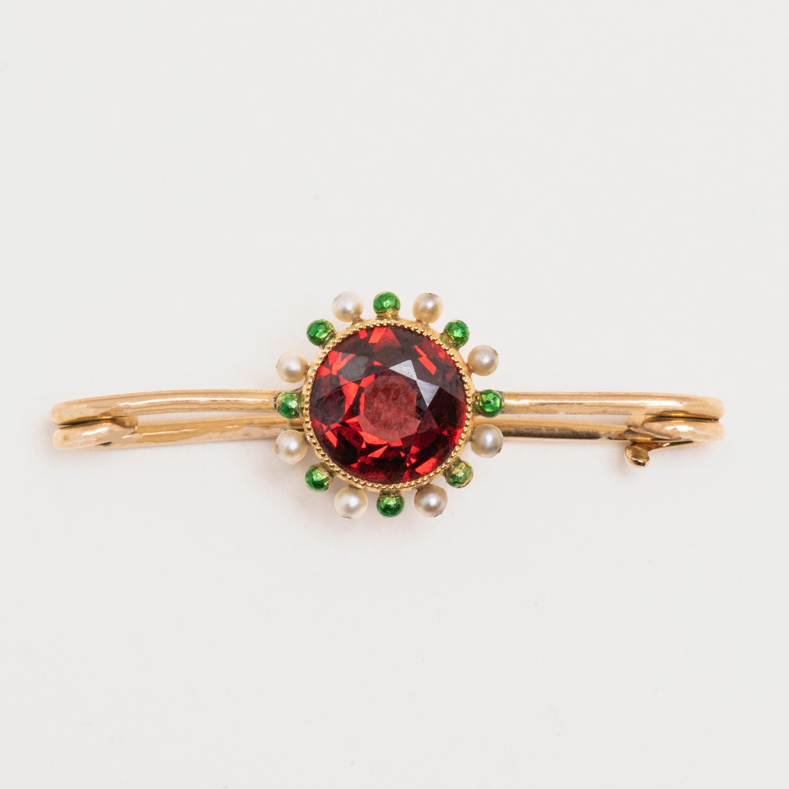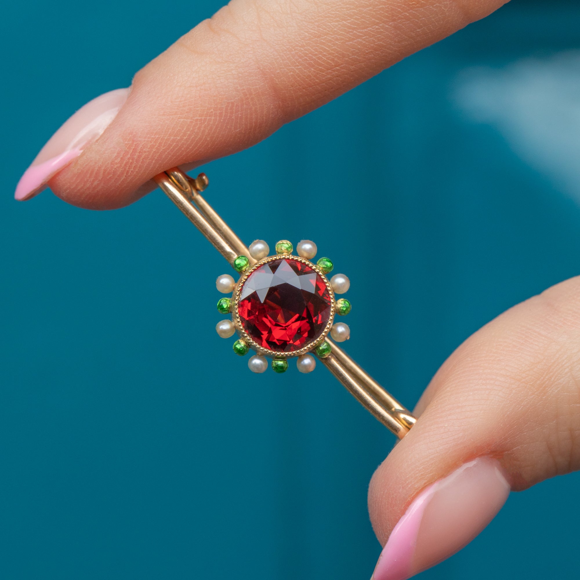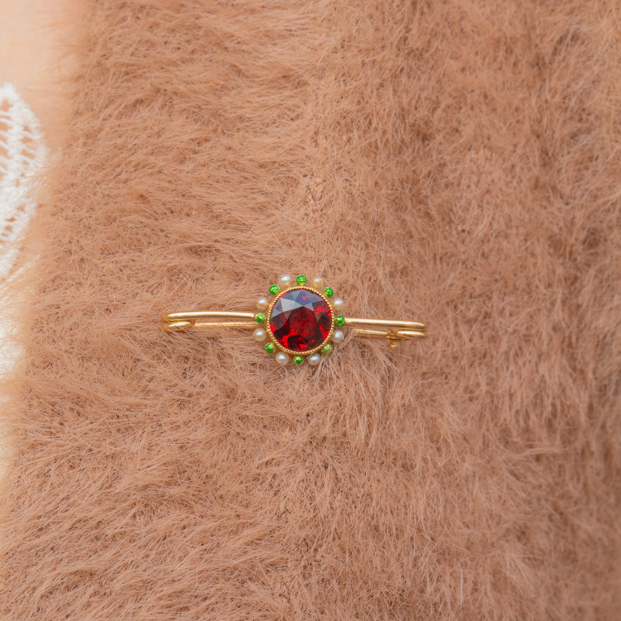 EXCELLENT. We are pleased to offer this antique 18ct Gold Garnet and Green enamel brooch in excellent condition! The Garnet is secure within it setting with no damage to the facets to note, surrounded by Pearls and Enamel which are fimly affixed to the bezel setting. The pin securely sits in the c-clasp allowing you to wear with the utmost confidence!