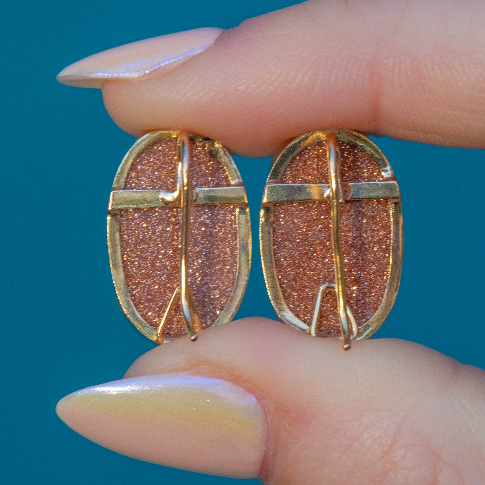 EXCELLENT. These antique 18ct Gold Goldstone earrings are in excellent condition. The earrings have lasted since the Victorian period in fabulous condition. The Goldstone cabochons are smooth and securely set. The earrings close securely, allowing you to wear them confidently.