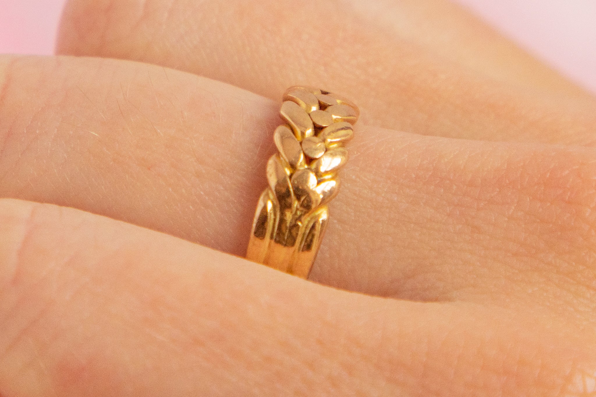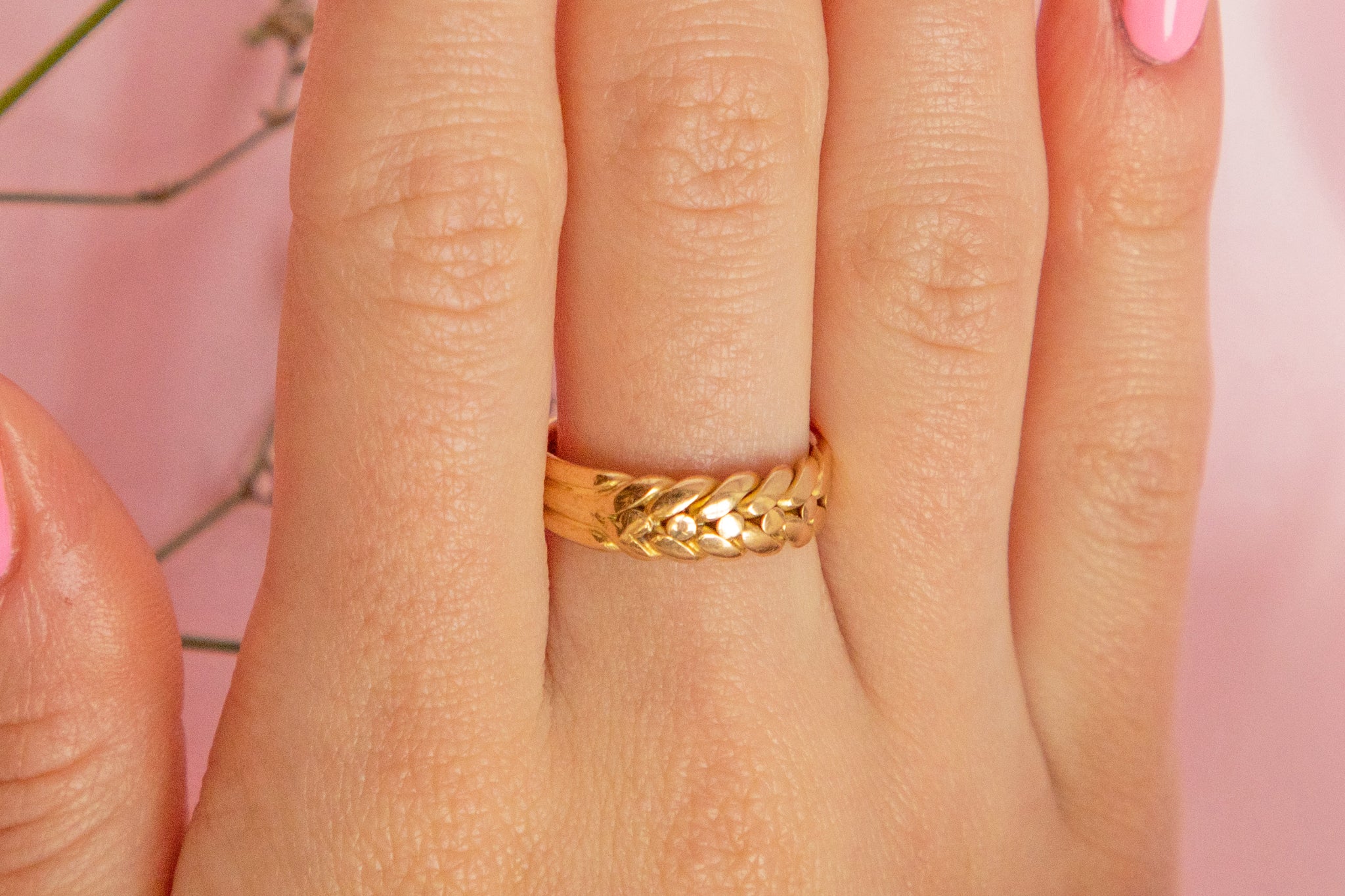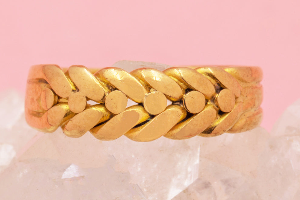This antique 18ct Gold keeper ring is a beautiful chunky piece perfect for everyday wear. Akin to braided wheat, this ring has a distinctive textural centre and smooth surface, comfortably hugging your finger in all the right places.