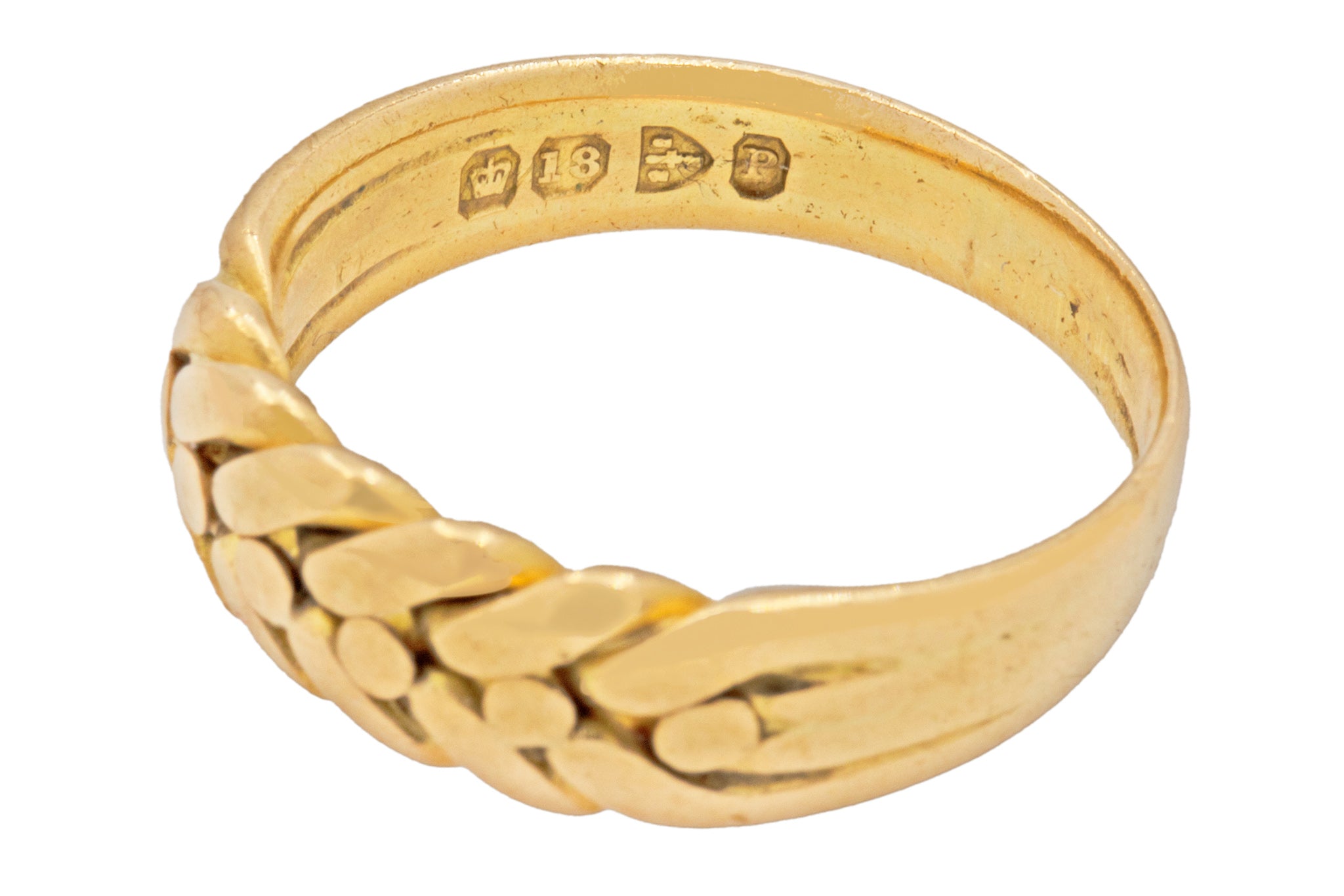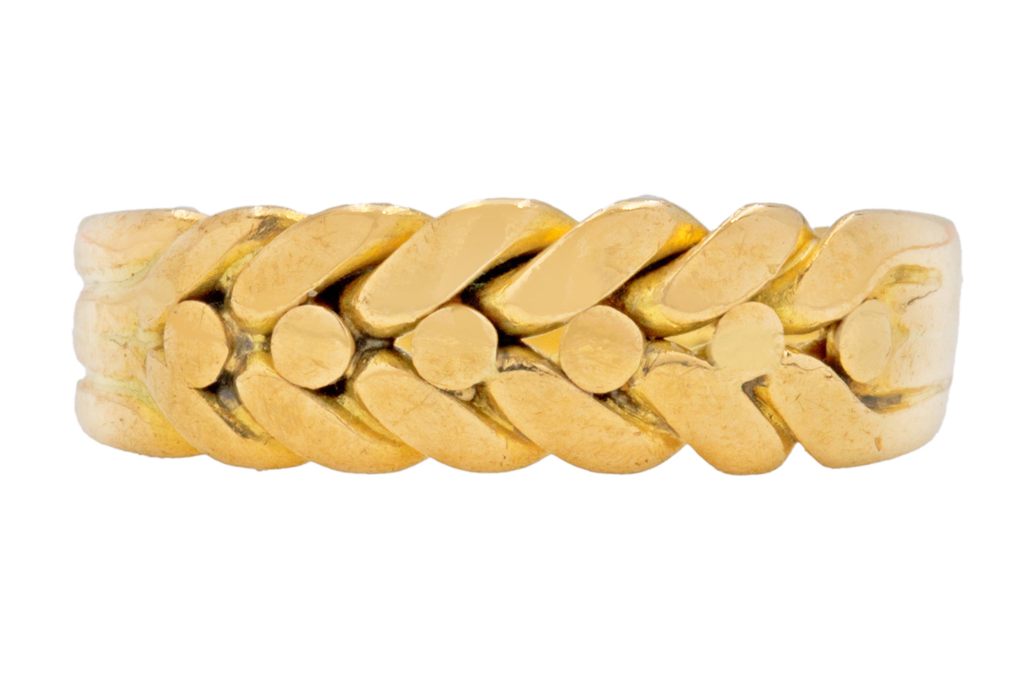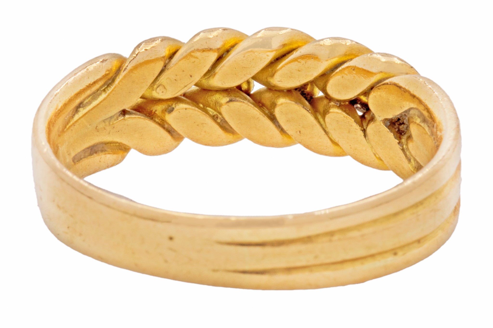 This antique 18ct Gold keeper ring is a beautiful chunky piece perfect for everyday wear. Akin to braided wheat, this ring has a distinctive textural centre and smooth surface, comfortably hugging your finger in all the right places.