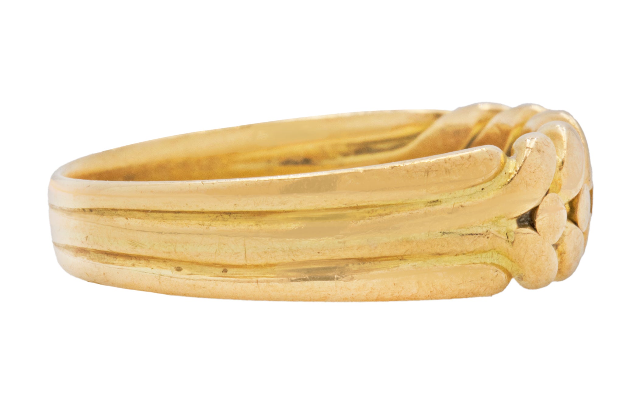 VERY GOOD. This antique 18ct Gold keeper ring is in very good condition! The ring has retained a perfectly rounded shape, making her comfortable for everyday wear. The Gold is rich and buttery and, although some of her engraved features have worn, she is still distinctly a keeper ring. With a full set of English hallmarks, we can accurately date her back to 1898!